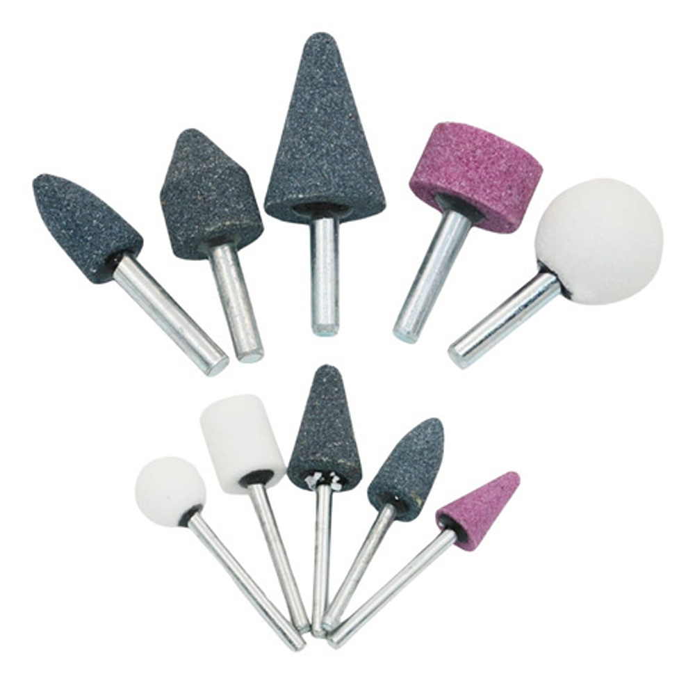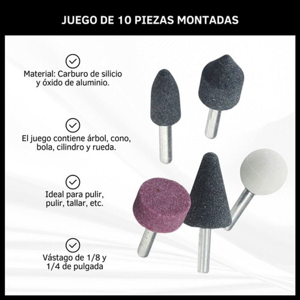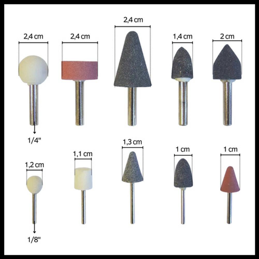 Características: -Ideal para pulir, pulir, tallar, etc. -Vástago de 1/8 y 1/4 de pulgada. -Tres tipos de grano: fino, medio, grueso. -Material Carburo de silicio, óxido de aluminio. -Puede trabajar con un máximo de 20000 RPM. -Un gran set para esos pequeños trabajos de pulido. -El juego contiene árbol, cono, bola, cilindro y rueda.