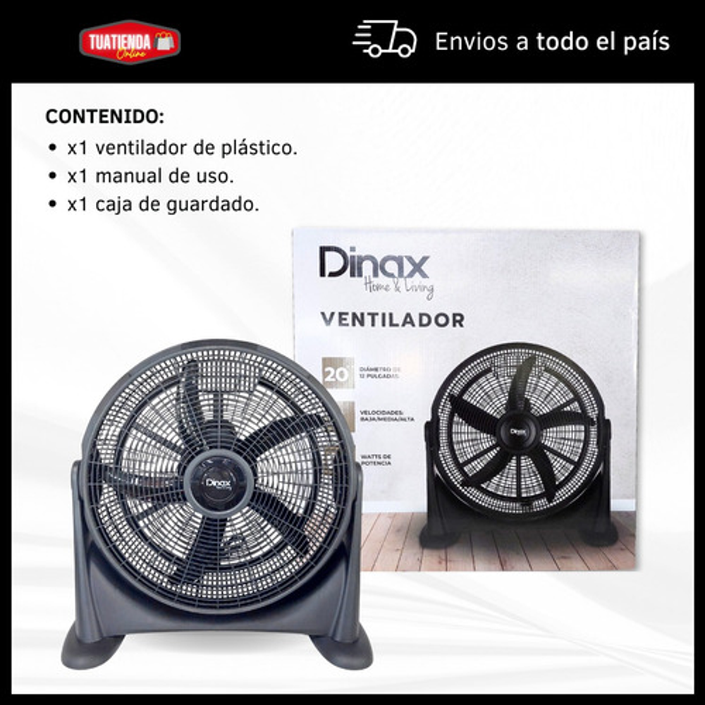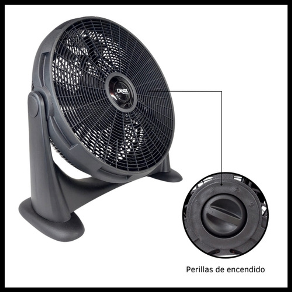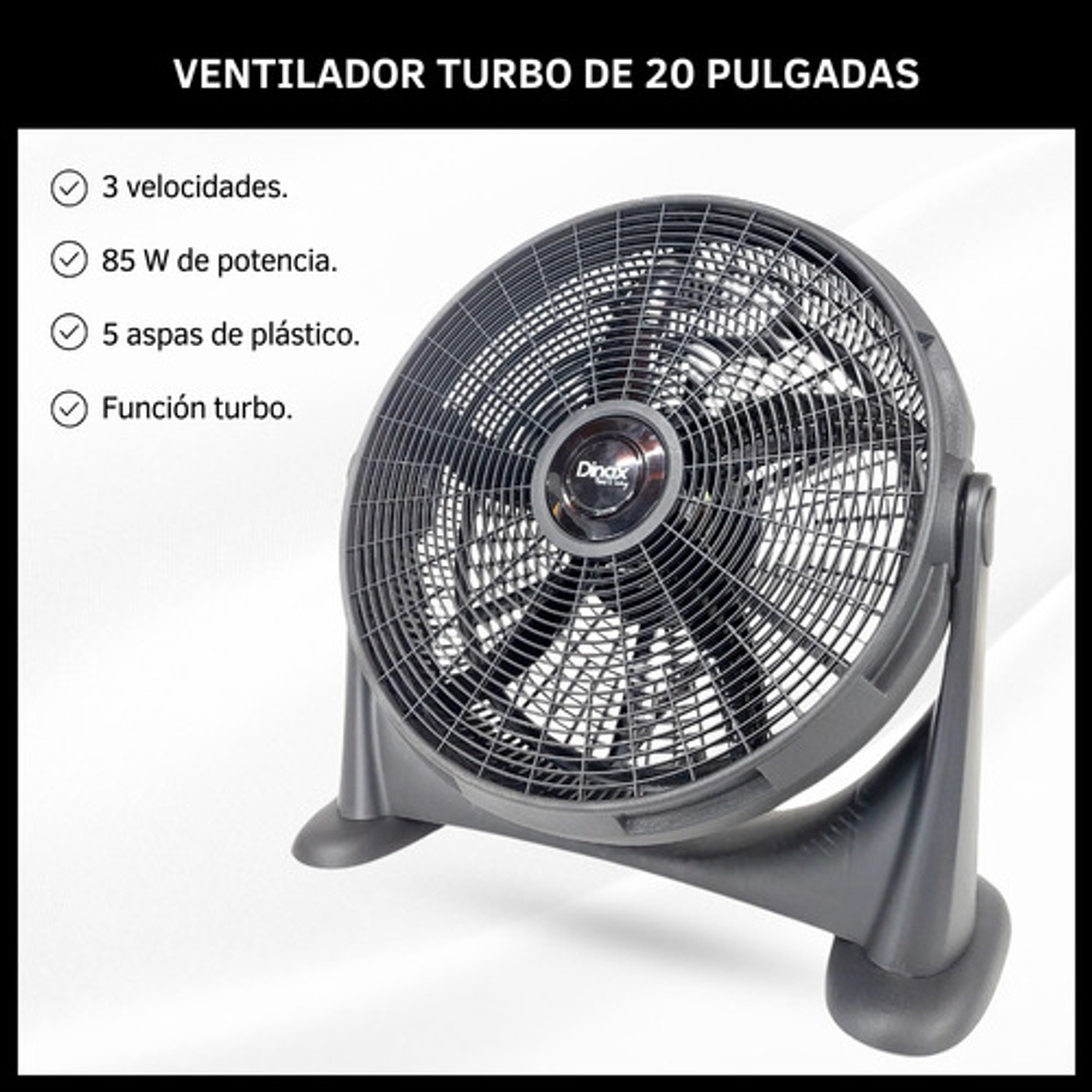 Características: -20" diámetro de pulgadas. -3 velocidades, baja, media y alta. -85W de potencia. -Material: plástico. -Tipo de ventilador: de piso. -Con función turbo. -Medidas: 57 cm x 57 cm.