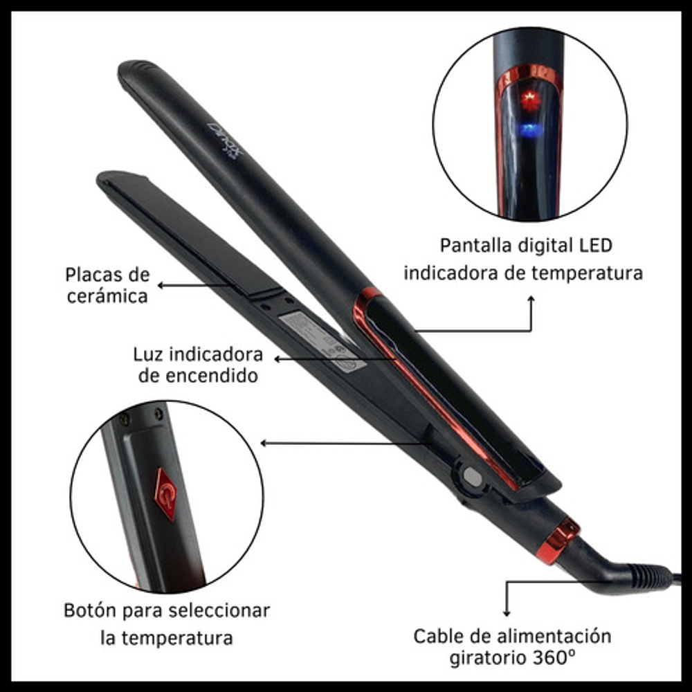 Características de la planchita de pelo: • Marca: Dinax • Temperatura máxima 220ºC • Diseño moderno y portátil • 4 niveles de temperatura • Calentamiento rápido • Pantalla digital LED • Placas de cerámica