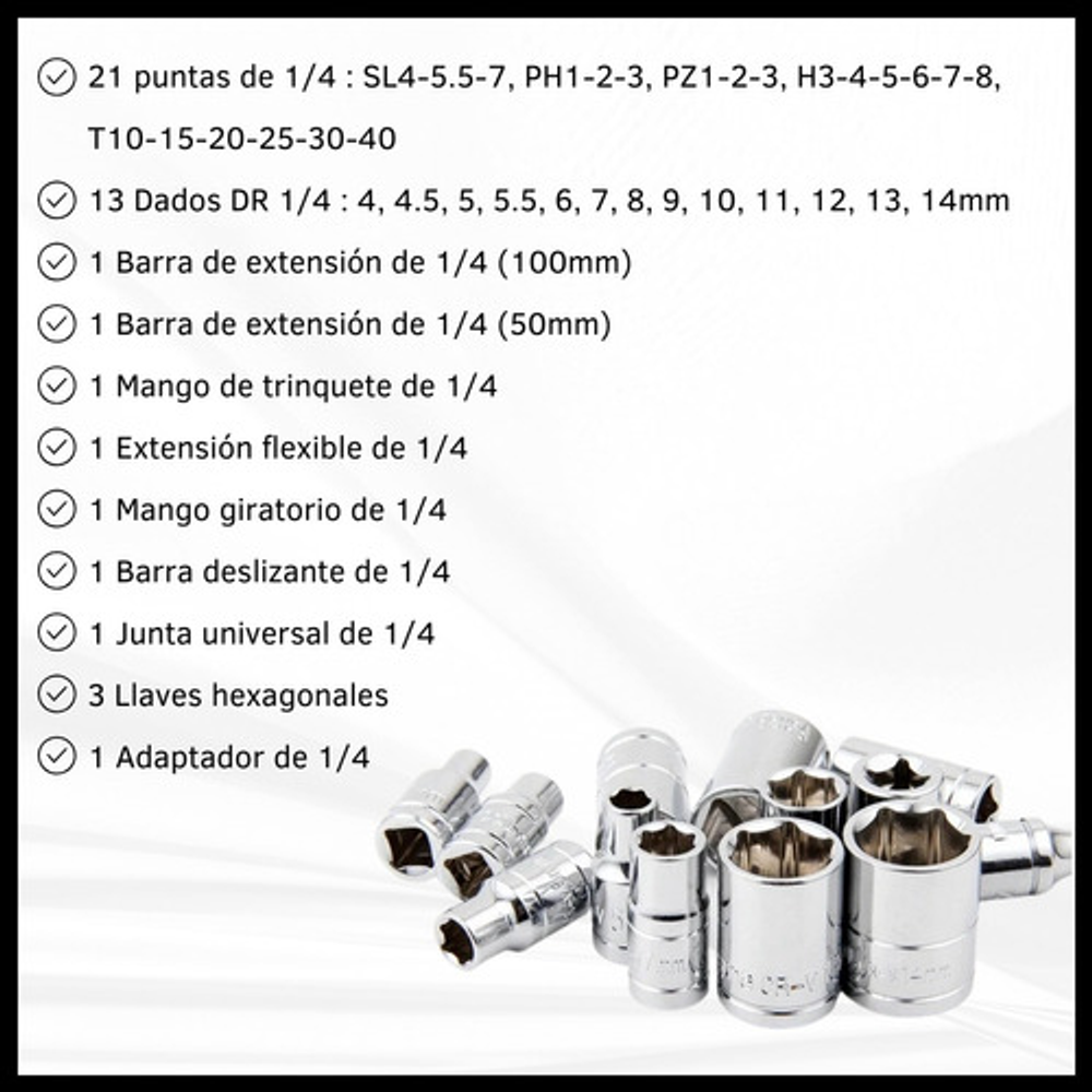 13 Dados DR 1/4: 4, 4.5, 5, 5.5, 6, 7, 8, 9, 10, 11, 12, 13, 14mm.