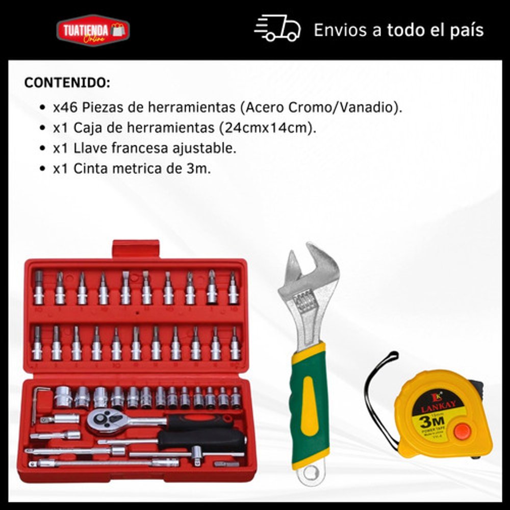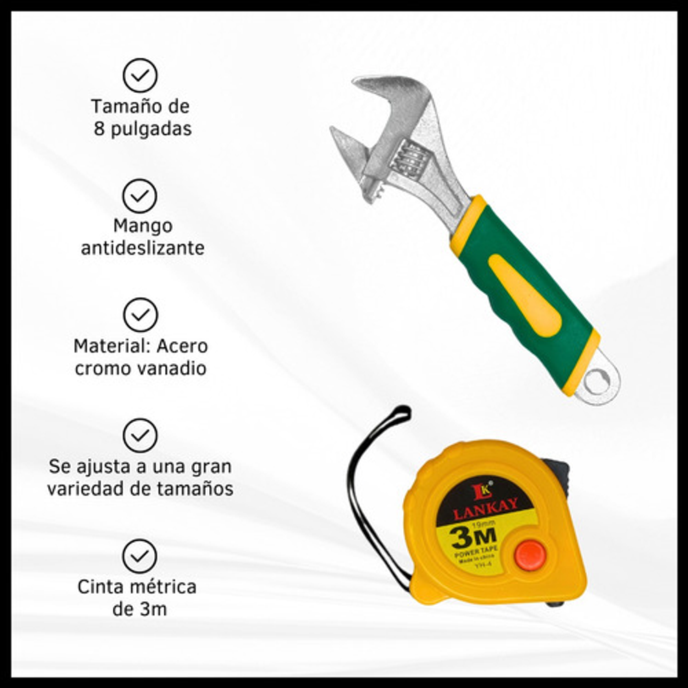 COMBO DE LLAVE TUBO DE 40 PIEZAS + LLAVE FRANCESA DE 10" + CINTA MÉTRICA DE 3M