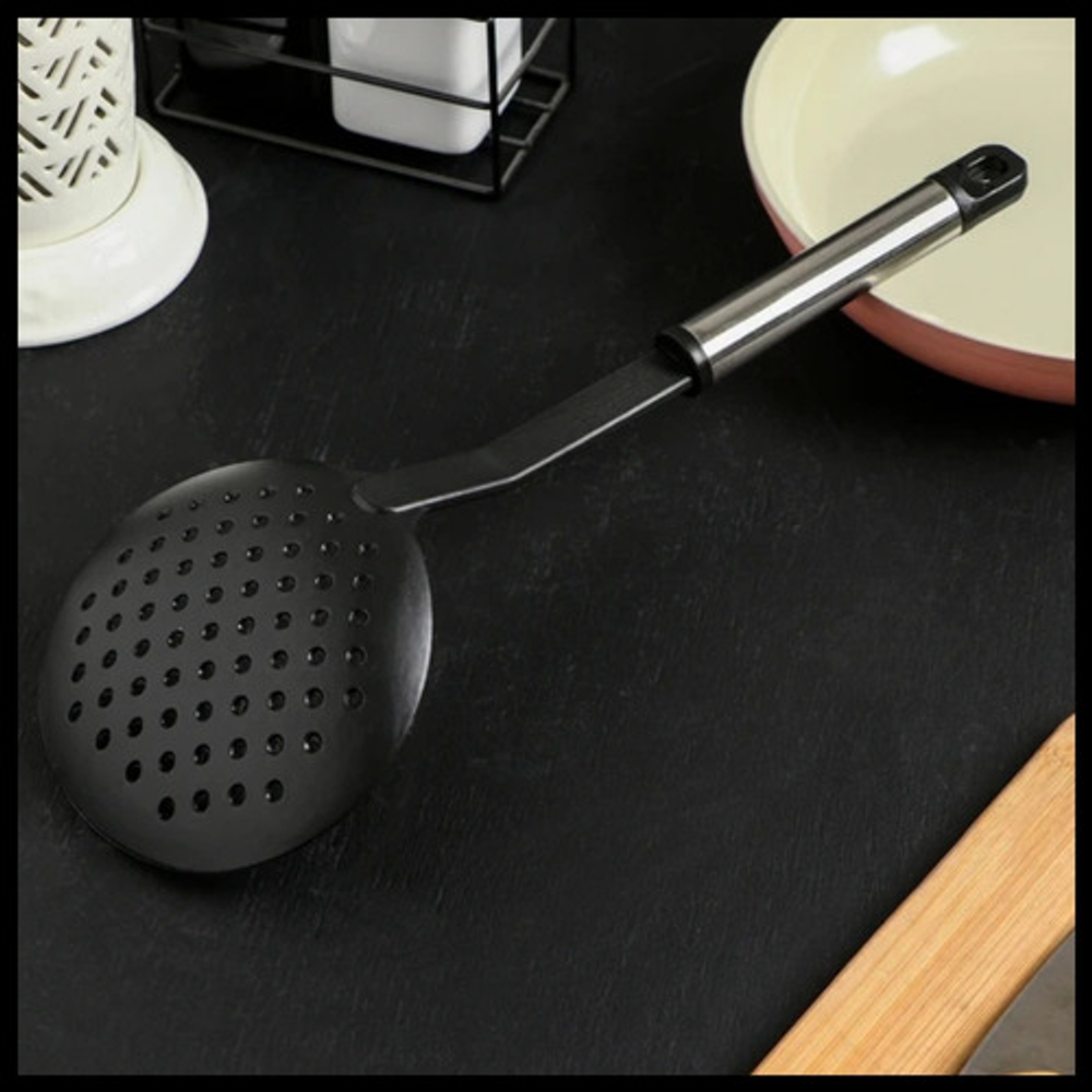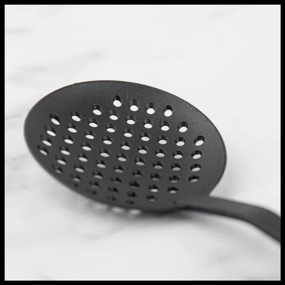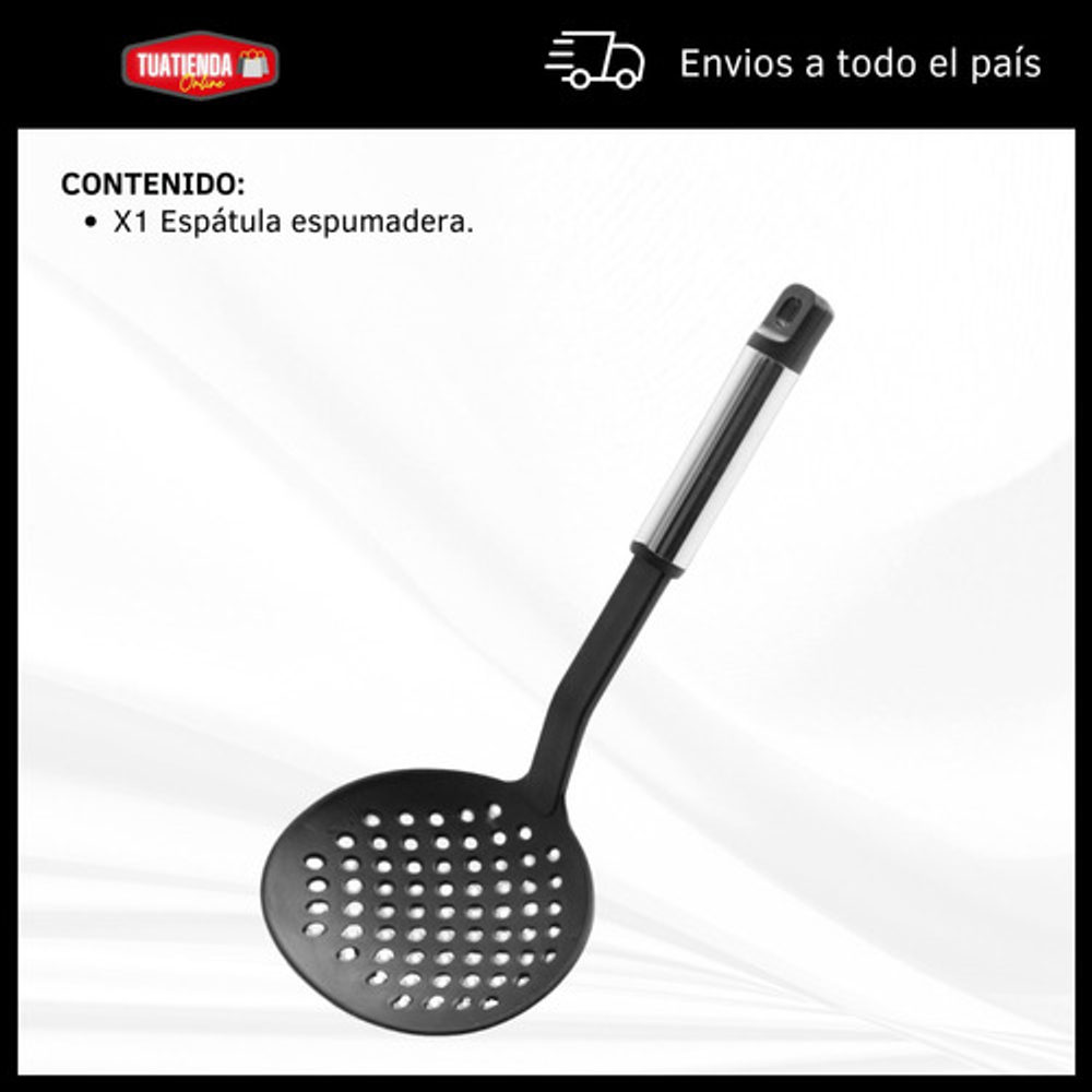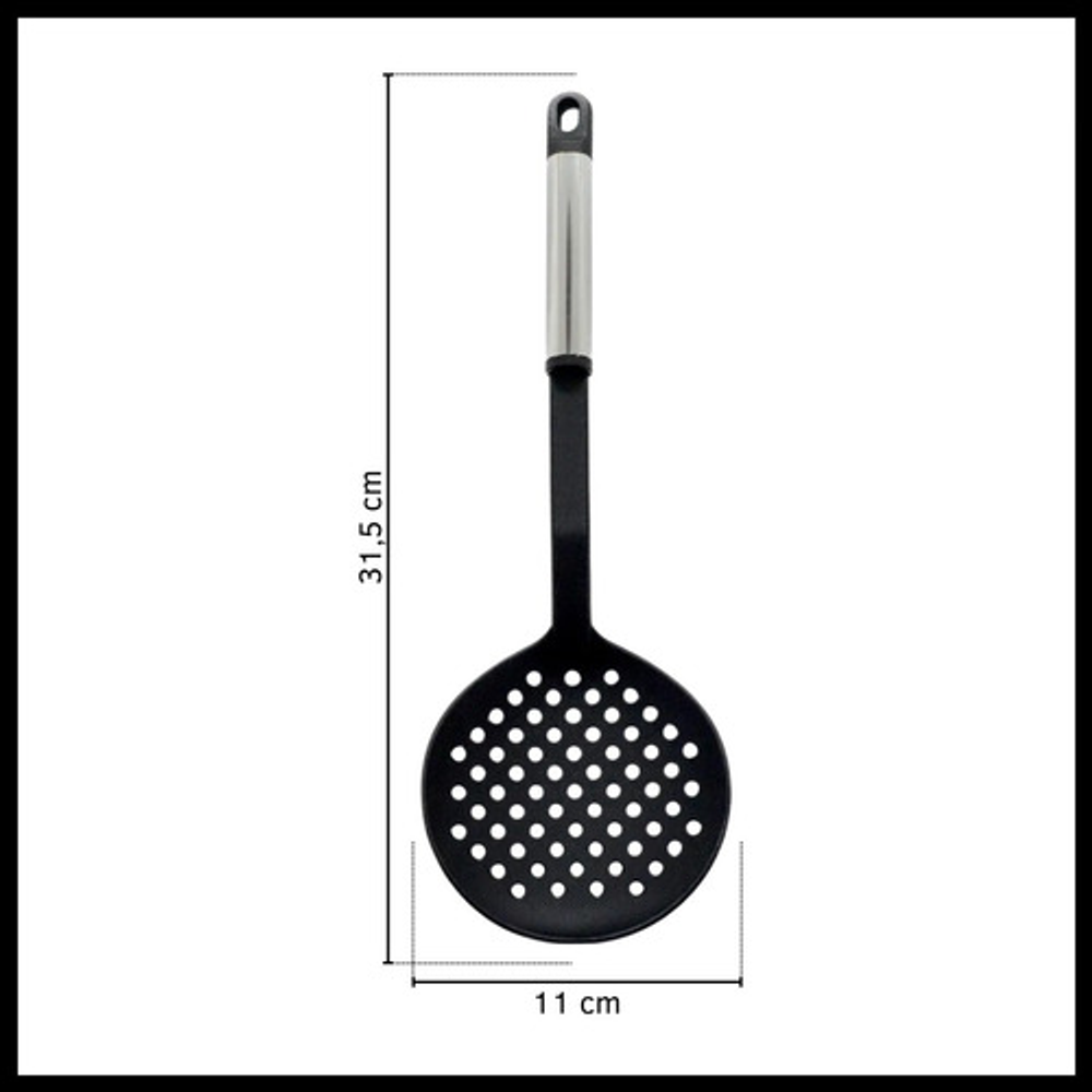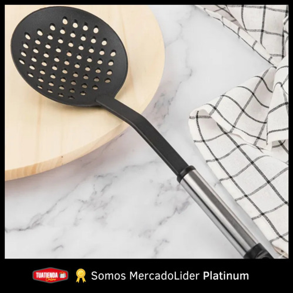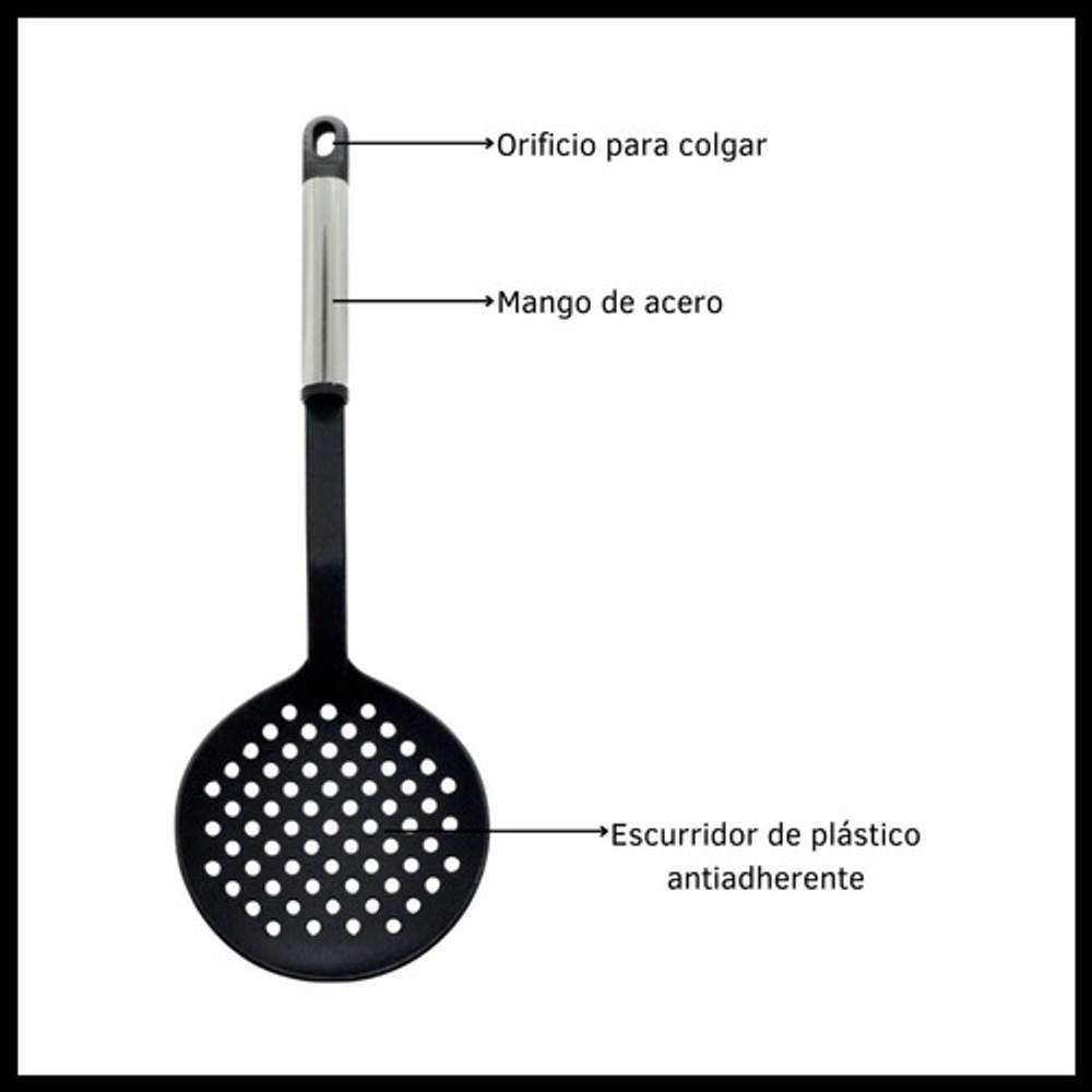 Características: • Resistente a altas temperaturas. • No absorbe olores ni sabores. • Mango de acero inoxidable. • Escurridor antiadherente.