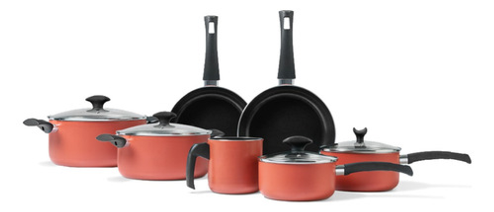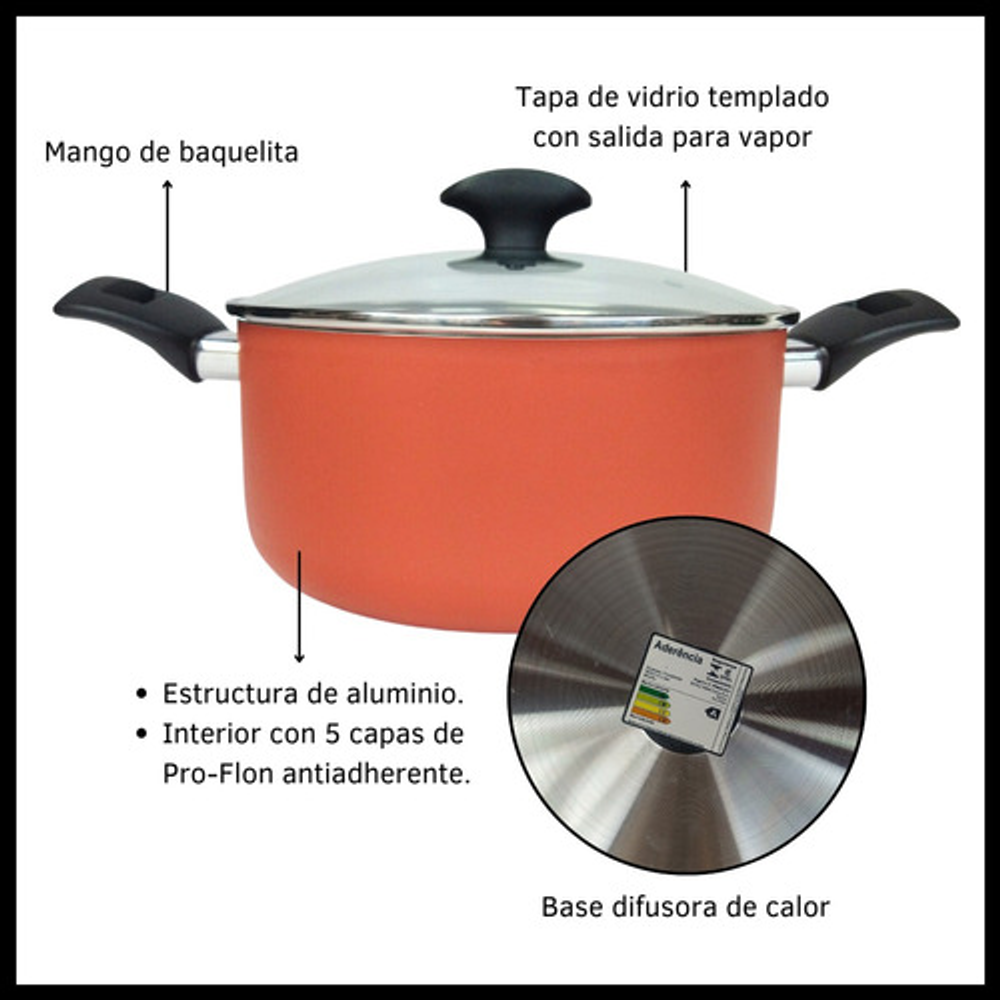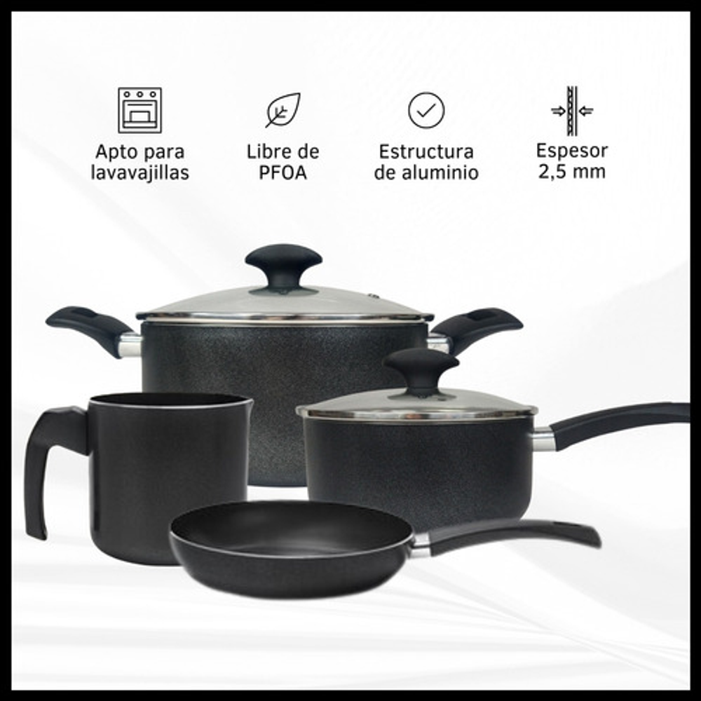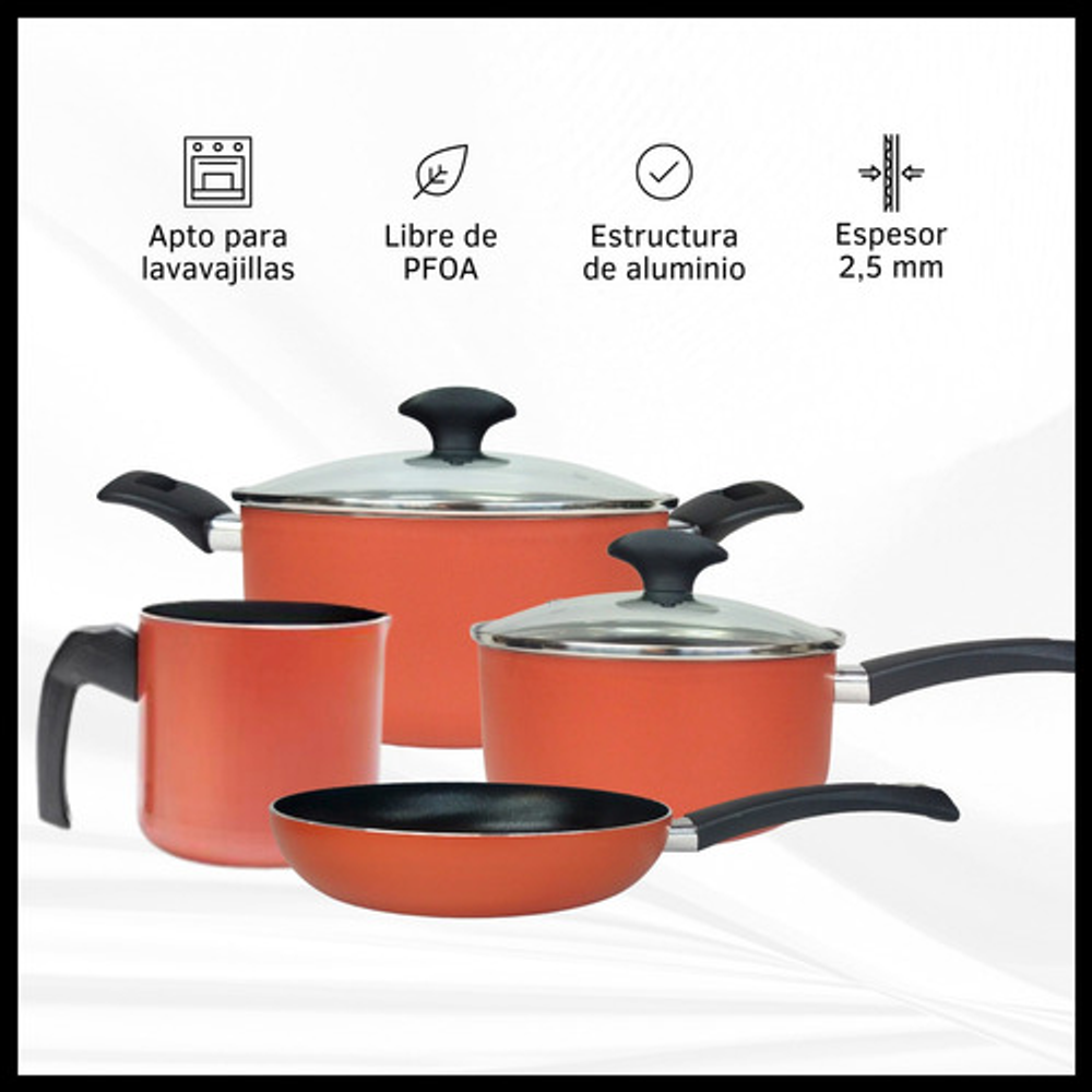 Características: • Incluye: x2 Cacerolas con tapa de vidrio, x2 Ollas con tapa de vidrio, x2 Sartenes y x1 Jarro hervidor. • Todas las piezas tienen las mismas características. • Capacidad y tamaño de cada olla especificado en la foto 4. • Material exterior de las piezas: aluminio. • Interior con 5 capas de Pro-Flon antiadherente. • Mango de baquelita antitérmico. • Base difusora de calor. • Apto para lavavajillas. • Espesor: 2,5mm • Libres de PFOA.