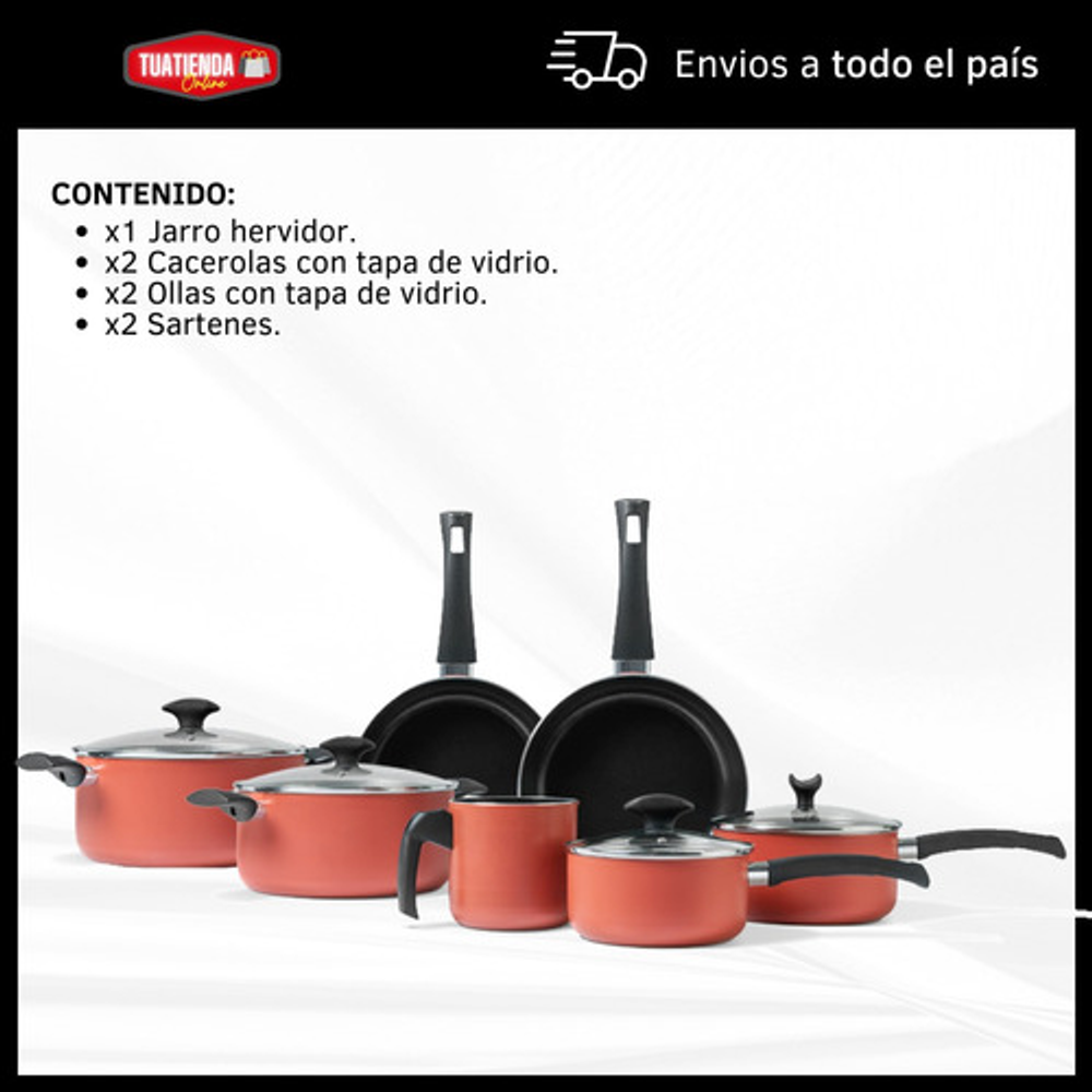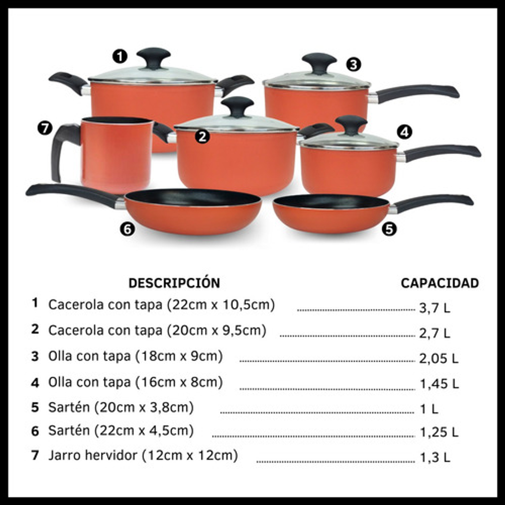 Piezas incluidas: 2 Ollas,2 Sartén,2 Cacerola,1 Jarro hervidor