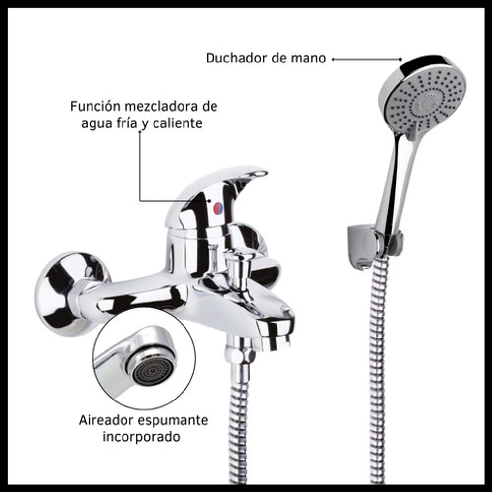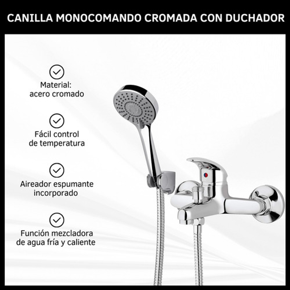 Incluye: • Kit de instalación. • Duchador de mano. • Ducha monocomando. • 1 Conector flexible de 150cm.
