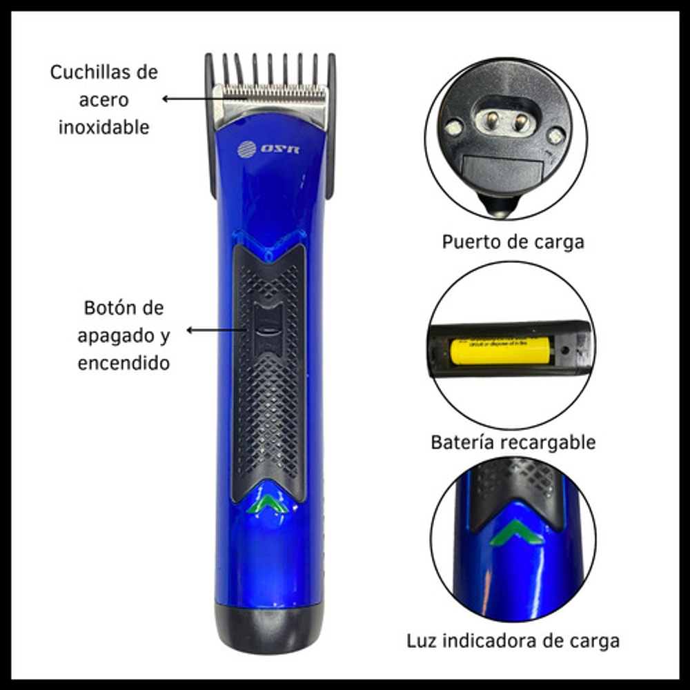 CARACTERISTICAS: -Incluye peine de limpieza -Batería recargable -Potencia 2W / Voltaje 220-240V -Cuchillas de acero inoxidable -Incluye cable de carga
