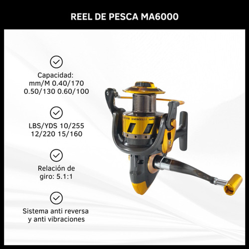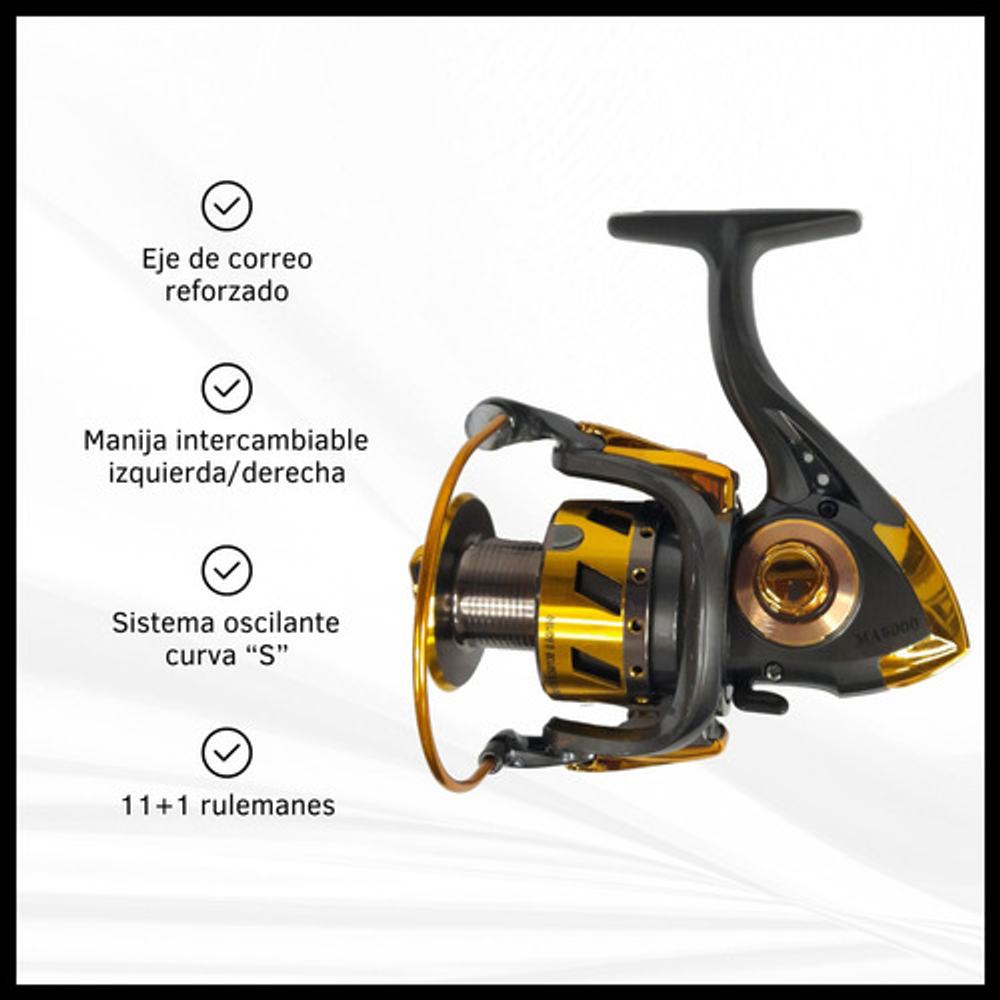 Características: • Sistema oscilante curva “S”, asegura un enrollado de línea uniforme y apretado, mejorando la distancia y la precisión en los lanzamientos. • Manija intercambiable izquierda/derecha, es útil para pescadores diestros y zurdos, proporcionando flexibilidad y comodidad. • Relación de giro: 5.1:1, es bastante versátil, adecuada para una variedad de técnicas de pesca. • Sistema anti reversa y anti vibraciones, asegura la línea y reduce las vibraciones. • 11+1 rulemanes, ofrece una operación más fluida y eficiente. • Capacidad: mm/M 0.40/170 0.50/130 0.60/100. • LBS/YDS 10/255 12/220 15/160. • Eje de correo reforzado