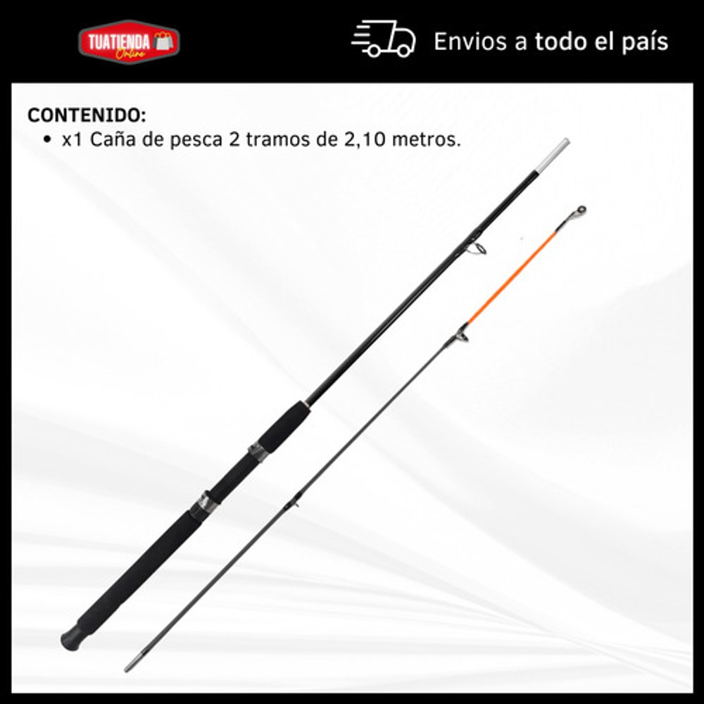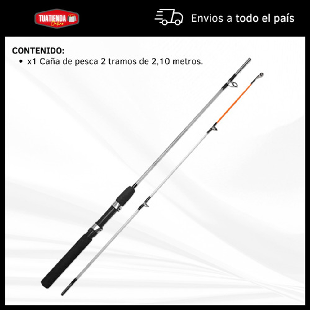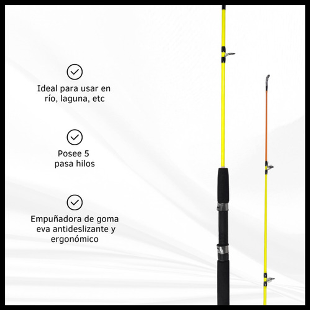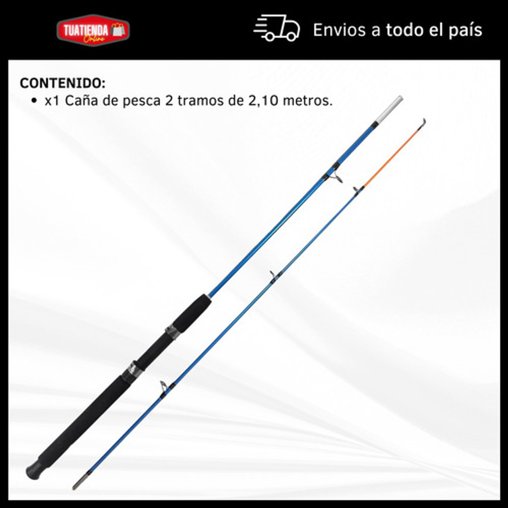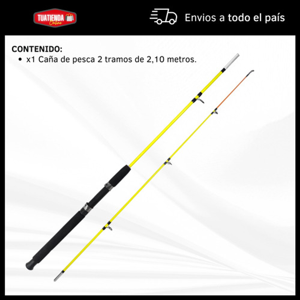 Características: • Largo total: 2,10m., ideal para pesca en lugares donde se requiere alcance extendido. • Cuenta con 5 pasa hilos que ayudan a prevenir enredos y mejora la precisión. • Su material de fibra de vidrio la hace ligera y flexible. • Empuñadura de goma eva antideslizante. • Caña de pesca adecuada para una amplia gama de técnicas de pesca.