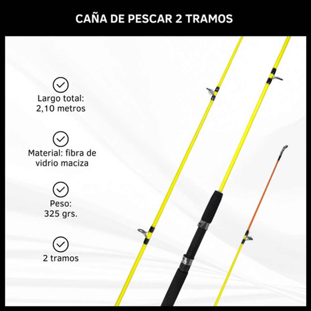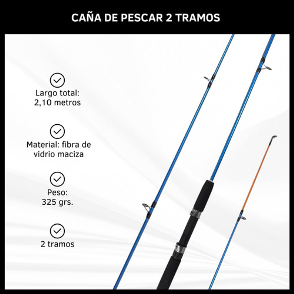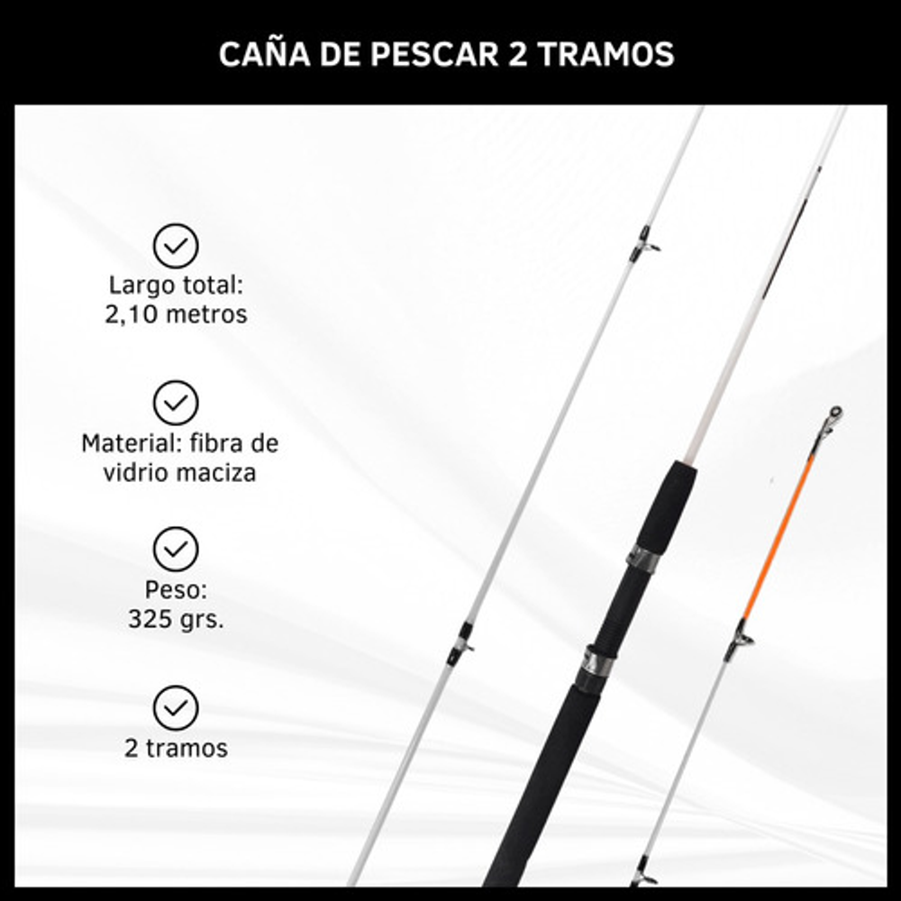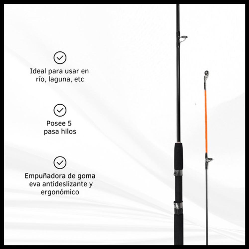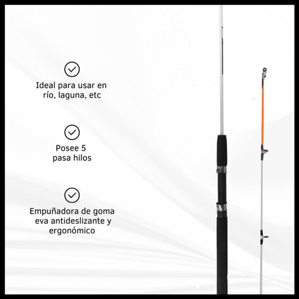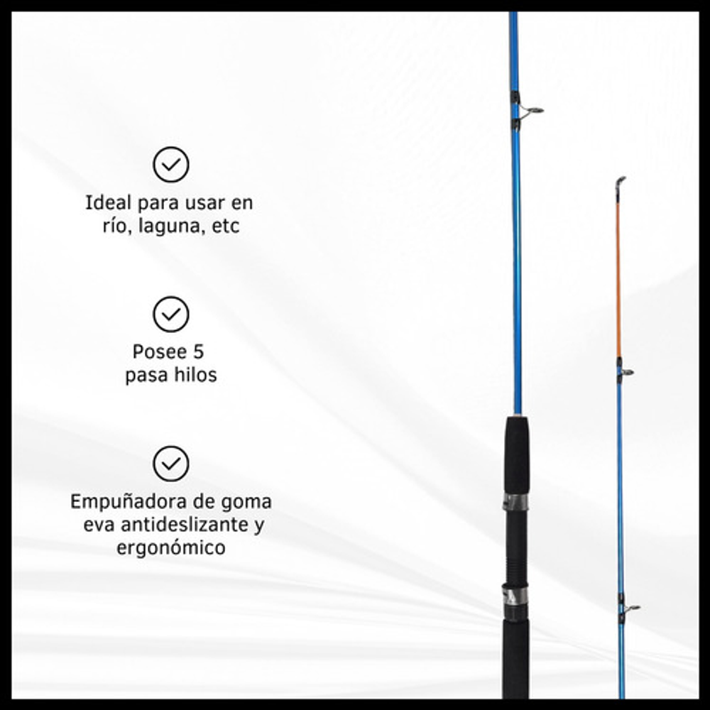 Características: • Largo total: 2,10m., ideal para pesca en lugares donde se requiere alcance extendido. • Cuenta con 5 pasa hilos que ayudan a prevenir enredos y mejora la precisión. • Su material de fibra de vidrio la hace ligera y flexible. • Empuñadura de goma eva antideslizante. • Caña de pesca adecuada para una amplia gama de técnicas de pesca.
