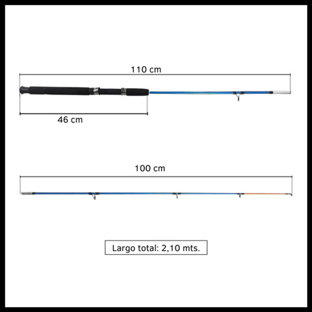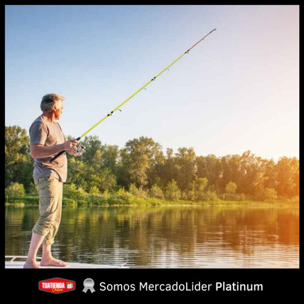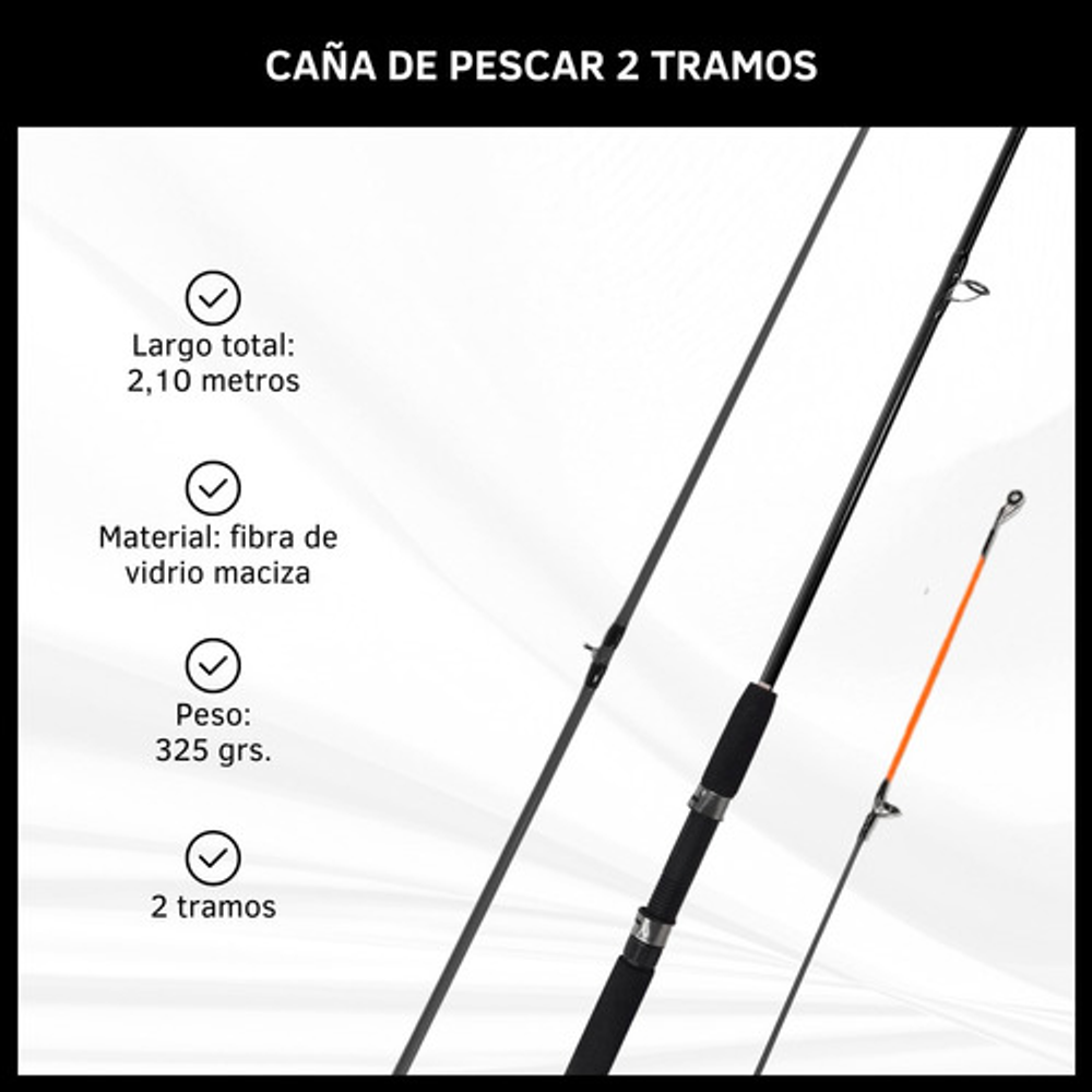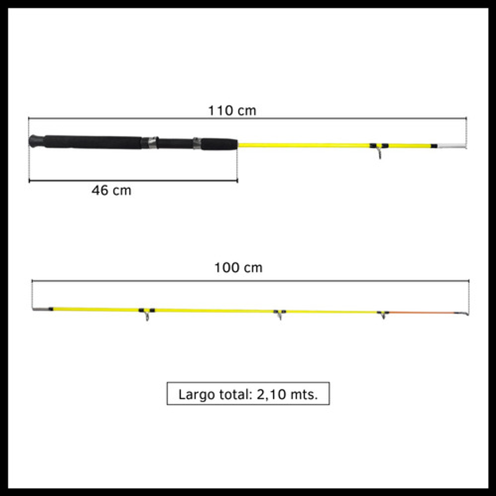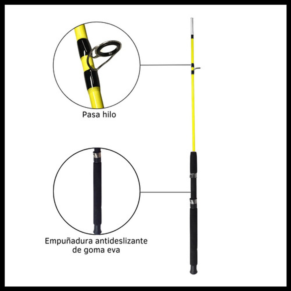 Características: • Largo total: 2,10m., ideal para pesca en lugares donde se requiere alcance extendido. • Cuenta con 5 pasa hilos que ayudan a prevenir enredos y mejora la precisión. • Su material de fibra de vidrio la hace ligera y flexible. • Empuñadura de goma eva antideslizante. • Caña de pesca adecuada para una amplia gama de técnicas de pesca.