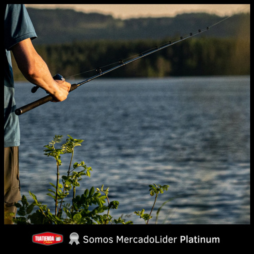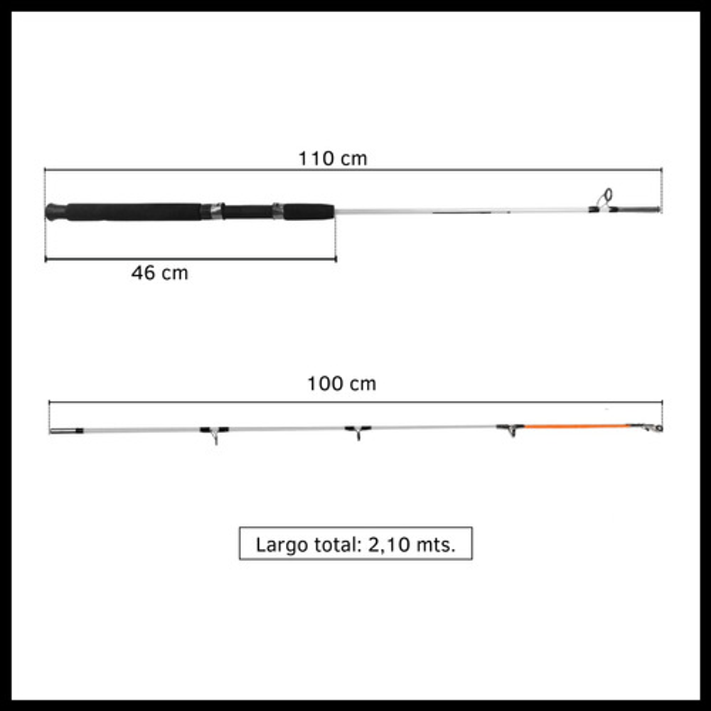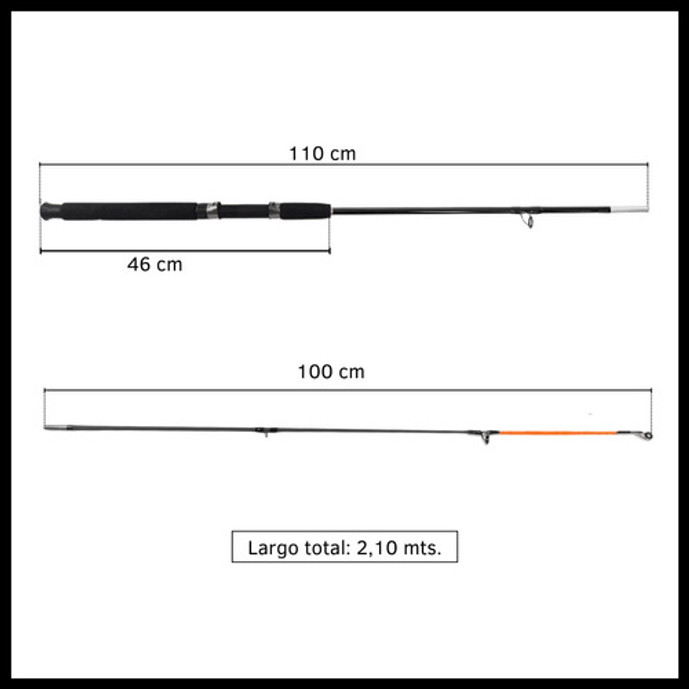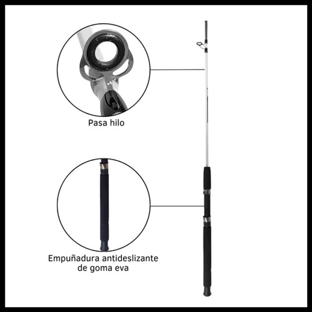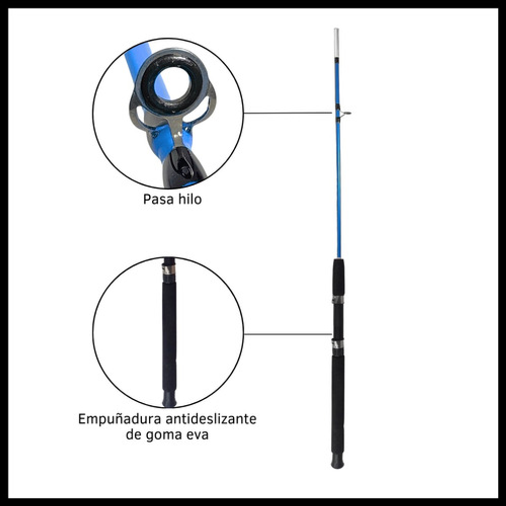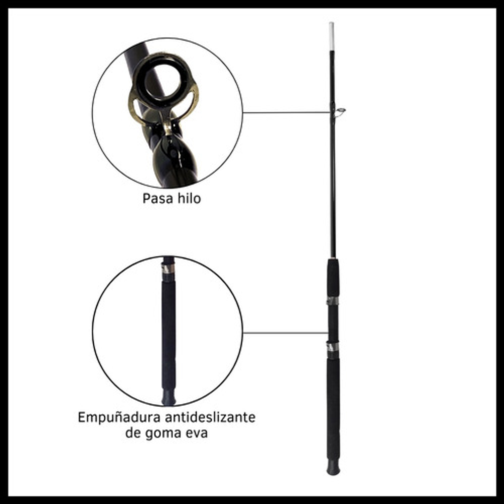 Características: • Largo total: 2,10m., ideal para pesca en lugares donde se requiere alcance extendido. • Cuenta con 5 pasa hilos que ayudan a prevenir enredos y mejora la precisión. • Su material de fibra de vidrio la hace ligera y flexible. • Empuñadura de goma eva antideslizante. • Caña de pesca adecuada para una amplia gama de técnicas de pesca.