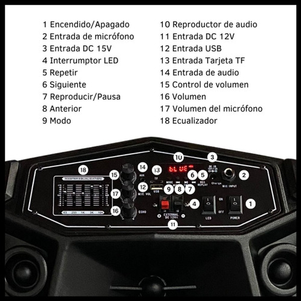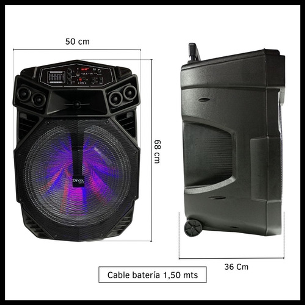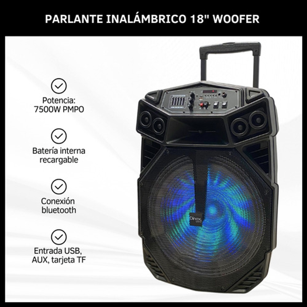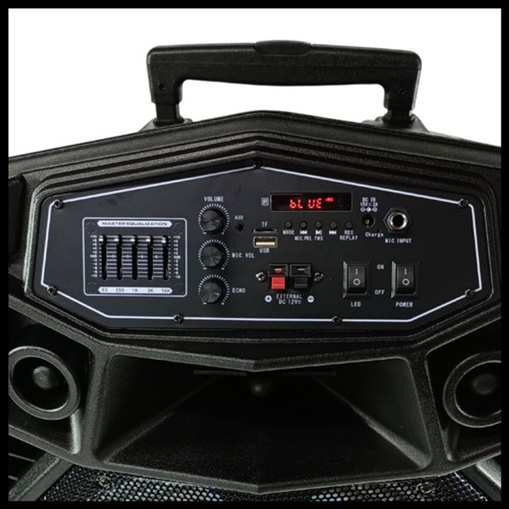 Características: • Conexión Bluetooth. • Luces LED RGB. • Función de radio FM. • Conexiones para pendrive USB, micrófono, AUX y tarjeta TF. • Potencia: 7500W PMPO que garantiza un sonido potente y de alta calidad. • Micrófono incluido, perfecto para karaoke o presentaciones. • Control remoto que facilita el manejo del parlante a distancia, permitiéndote cambiar de pista, ajustar el volumen y más. • Batería interna recargable a través de un cable USB.