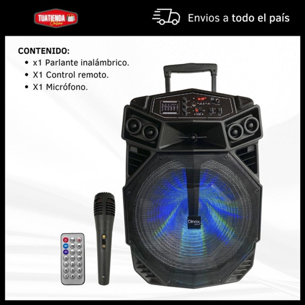 Contenido: • x1 Parlante inalámbrico • x1 Micrófono • x1 Control remoto • x1 Cable para micrófono • x1 Cable USB de carga