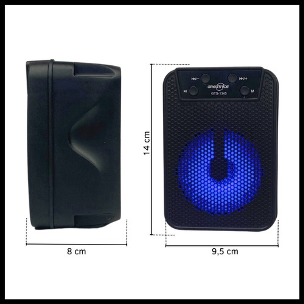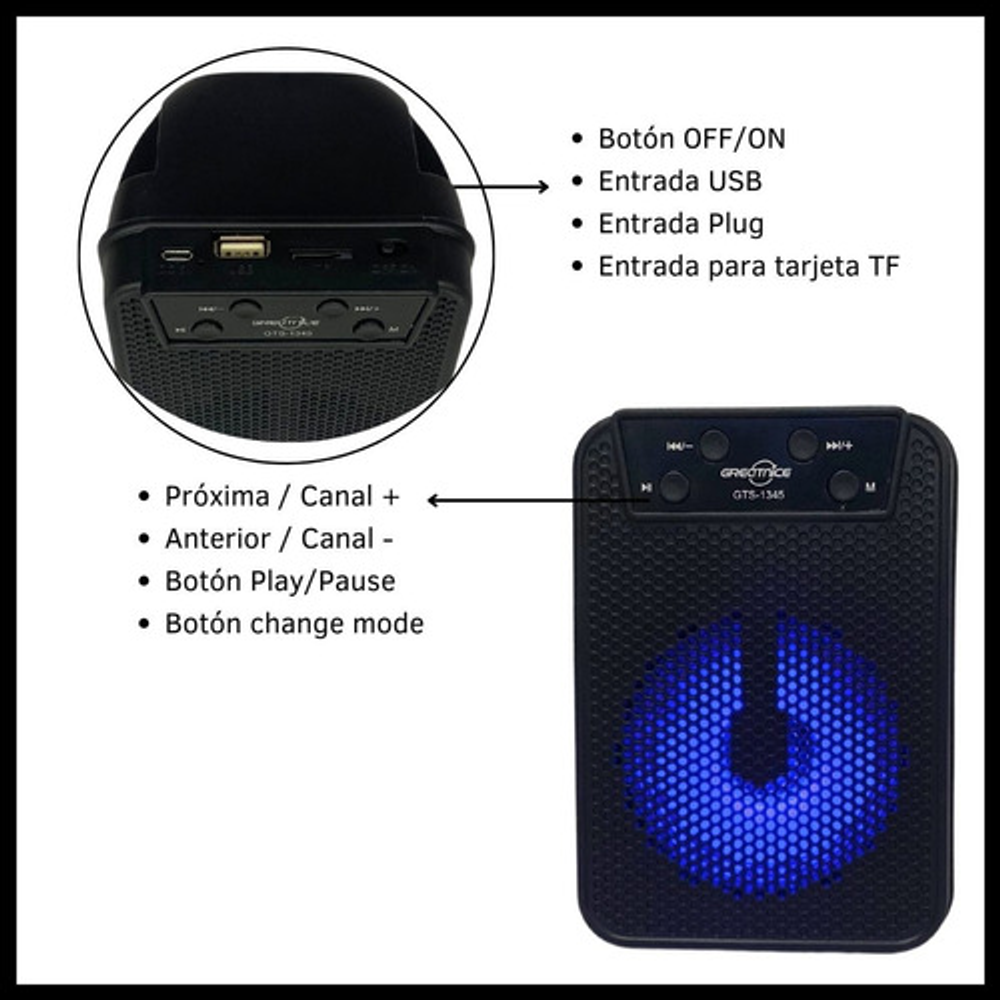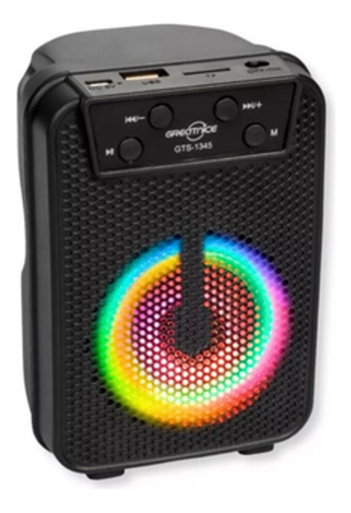 Caracteristicas: • Conexión Bluetooth. • Entrada para tarjeta SD. • Radio FM incorporada. • Batería recargable vía USB. • Luces RGB.