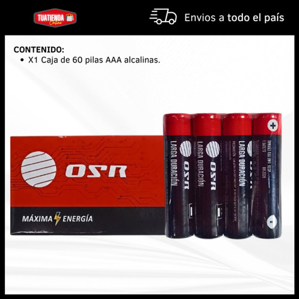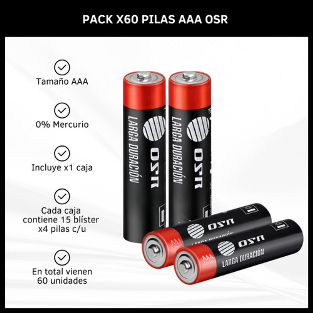 Características: • Incluye 1 caja con 15 blíster, cada uno con 4 pilas. • En total incluye 60 unidades. • Tipo de Pila: AAA. • No es recargable. • Forma: cilíndrica. • Voltaje: 1,5 V. • 0% mercurio.