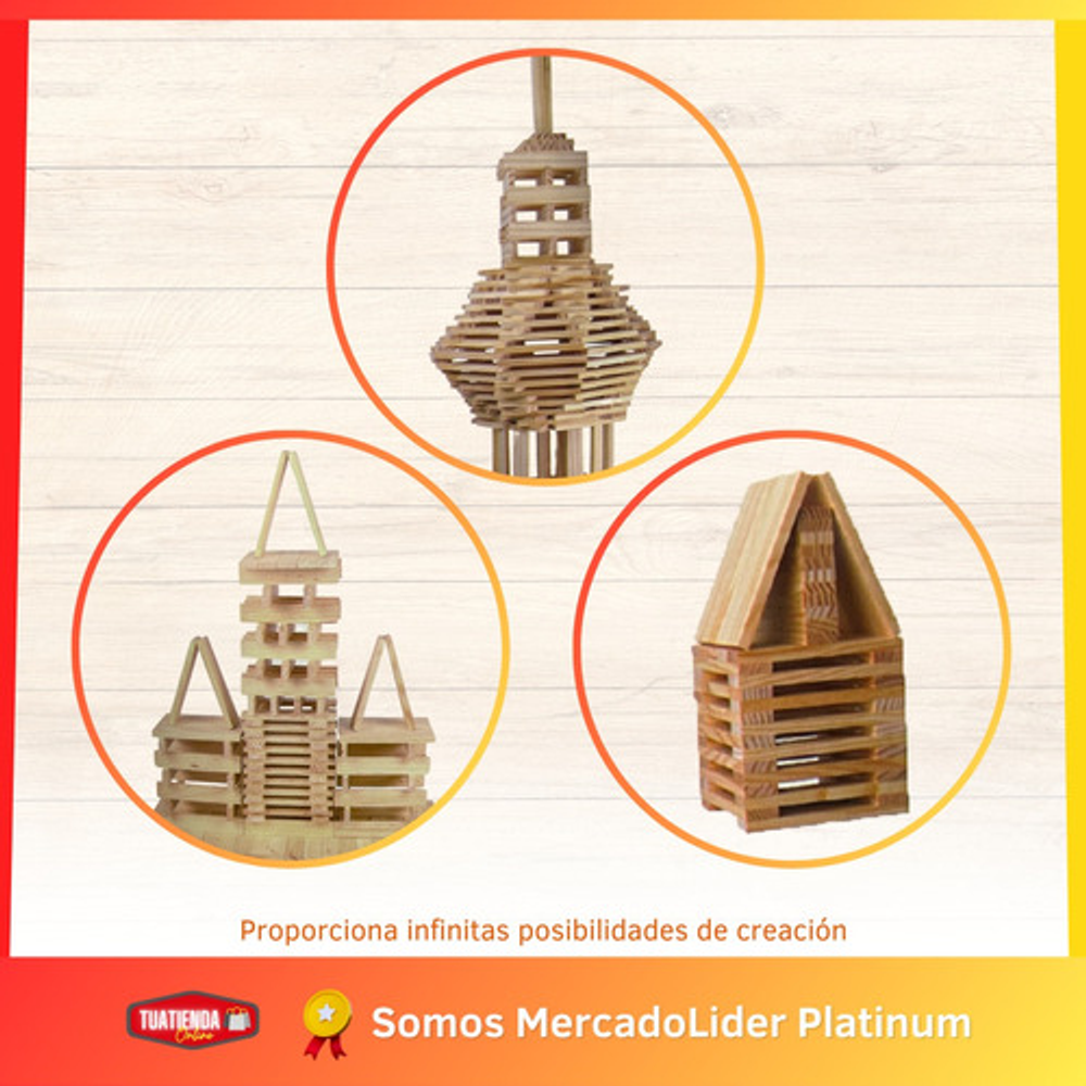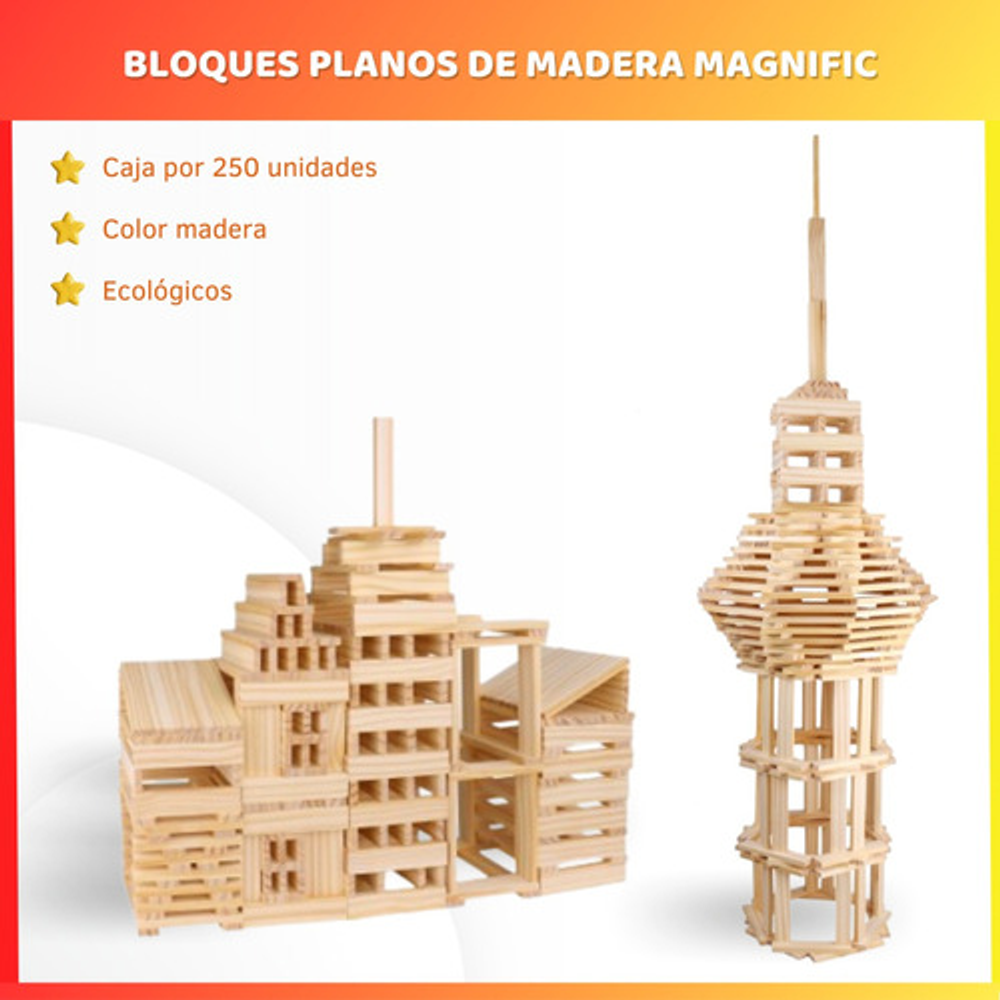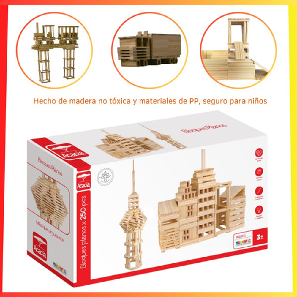 Caracteristicas: • 250 bloques planos de madera natural. • Formas geométricas. • Edad + 3 años. • Creaciones ilimitadas con imaginación. • Hecho en madera no toxica y segura para niños. • De Magnific Acacia 2170.