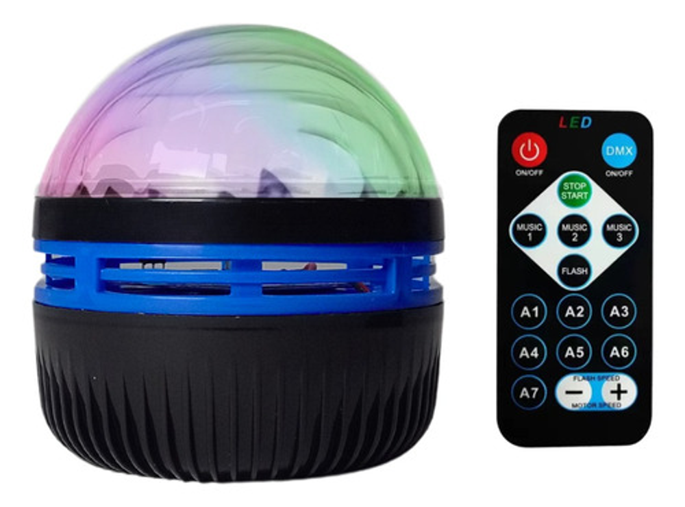 Características: • Ideal para utilizar en el hogar, fiestas, habitaciones, etc. • 3 colores: azul, rojo, verde y combinaciones entre ellos. • Funciona enchufado con cable USB. • Incluye control remoto con efectos. • Luz giratoria 360º. • Material: plástico. • Potencia: 5W. • Luz LED RGB. • 5V.