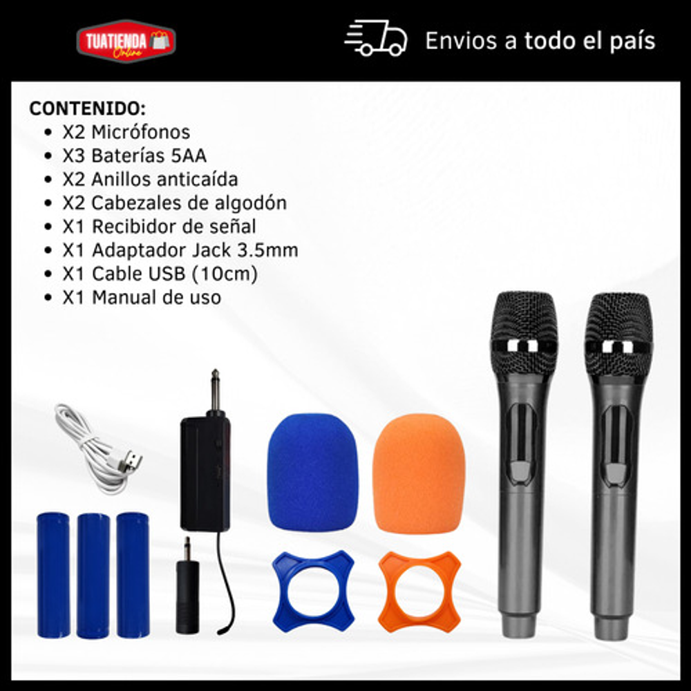 Contenido: X2 Micrófonos X3 Baterías 5AA X2 Anillos anticaída X2 Cabezales de algodón X1 Recibidor de señal X1 Adaptador Jack 3.5mm X1 Cable USB (10cm) X1 Manual de uso