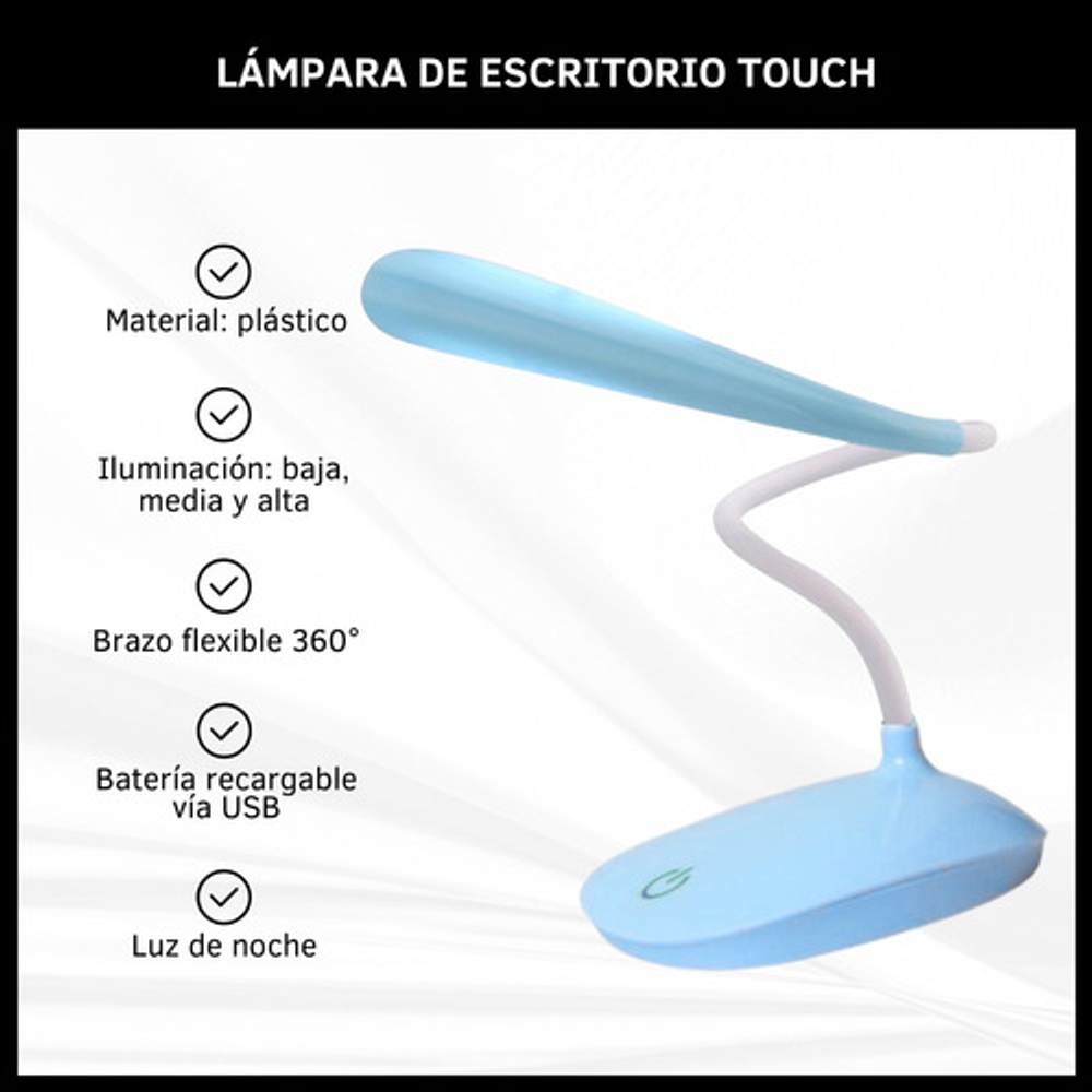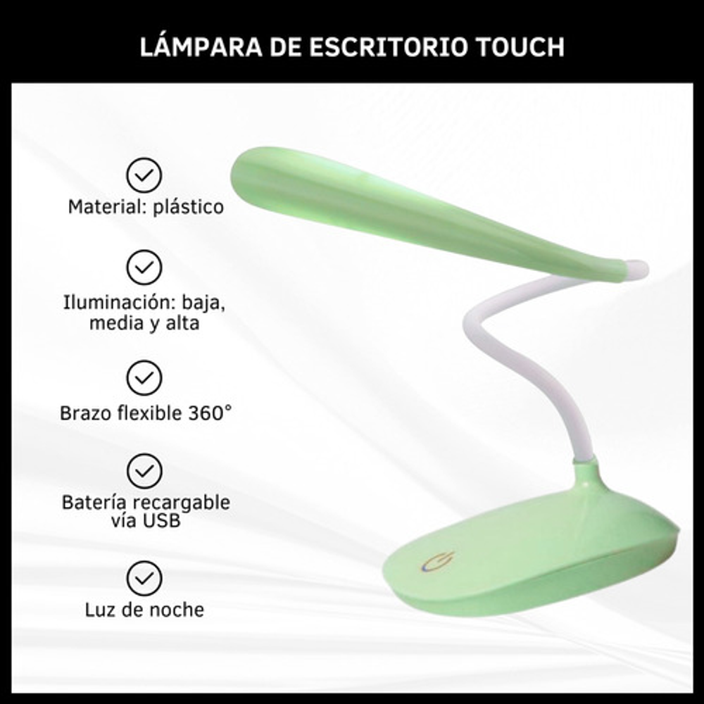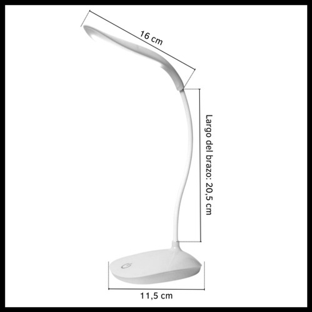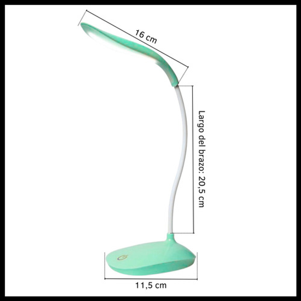 Características: • Posee tres posiciones de iluminación: baja, media y alta. • Ideal para tu escritorio. • Luz suave para lectura. • Durabilidad eléctrica. • Sin doble sombra. • Carga con USB. • Brazo flexible.