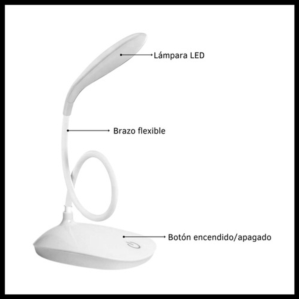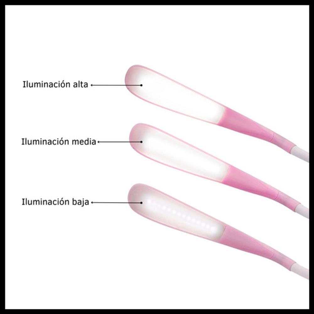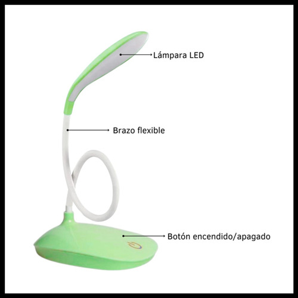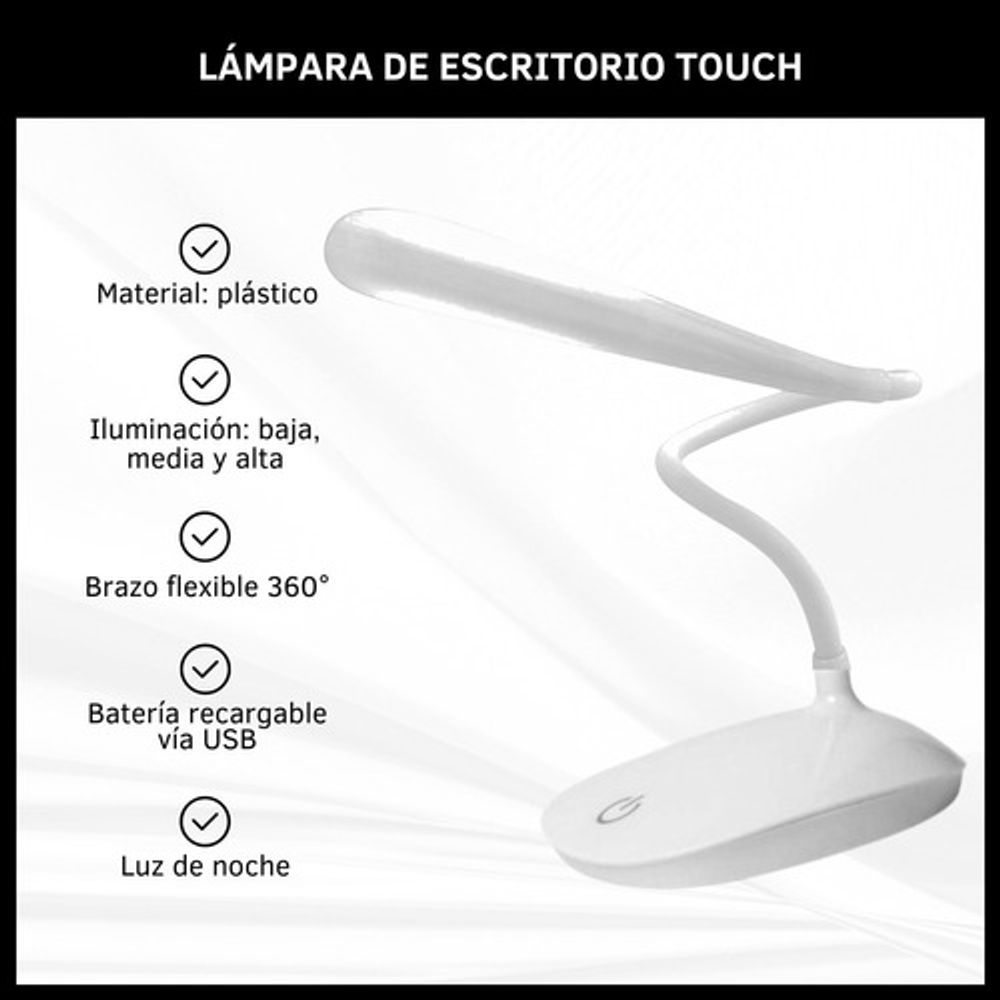 Características: • Posee tres posiciones de iluminación: baja, media y alta. • Ideal para tu escritorio. • Luz suave para lectura. • Durabilidad eléctrica. • Sin doble sombra. • Carga con USB. • Brazo flexible.