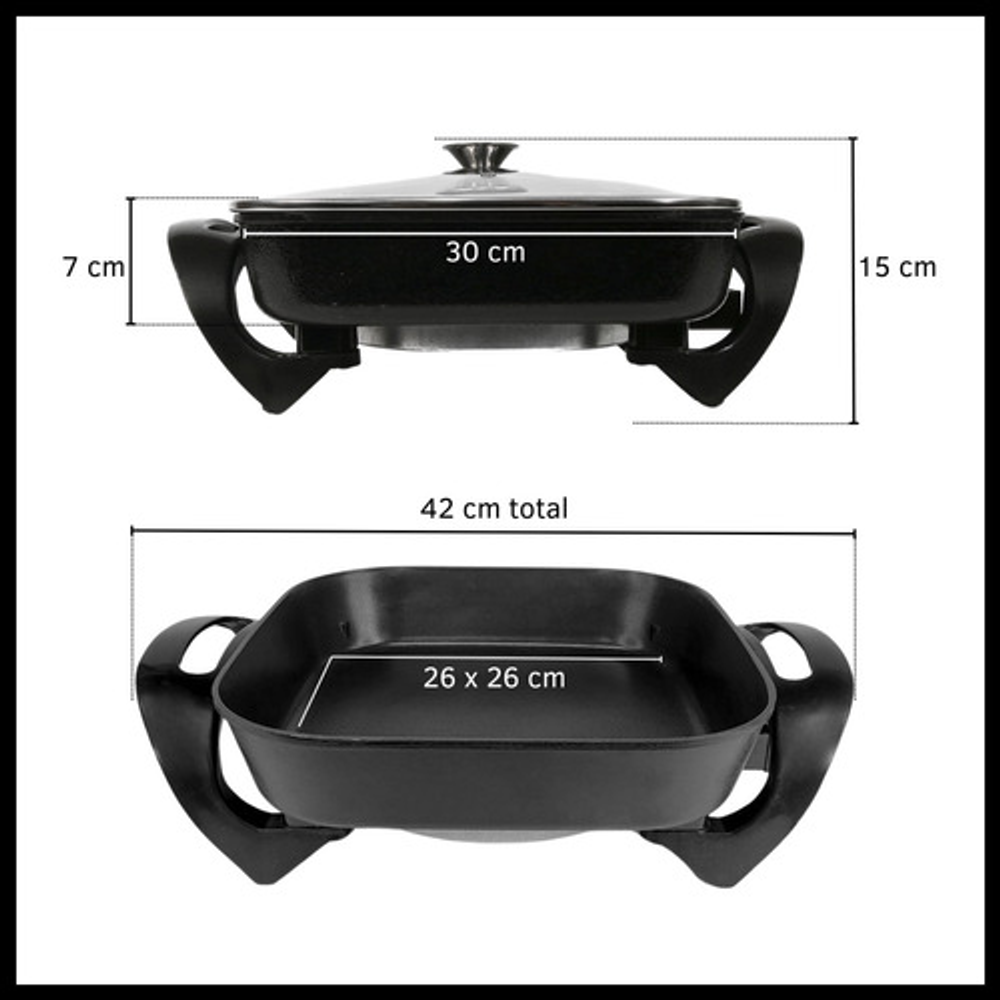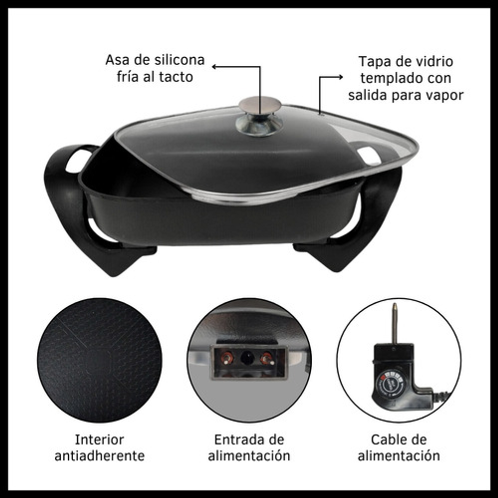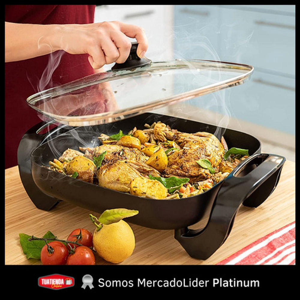 Características: • Tapa de vidrio templado con orificio para la salida del vapor. • Superficie antiadherente de teflón. • Calentamiento rápido. • Termostato regulable. • Capacidad de 3 litros. • Regulador desmontable. • Indicador luminoso. • Potencia de 1300 W. • CA 220V. • Temperatura controlada. • Ideal para grillar, guisar, freír y cocinar al vapor.