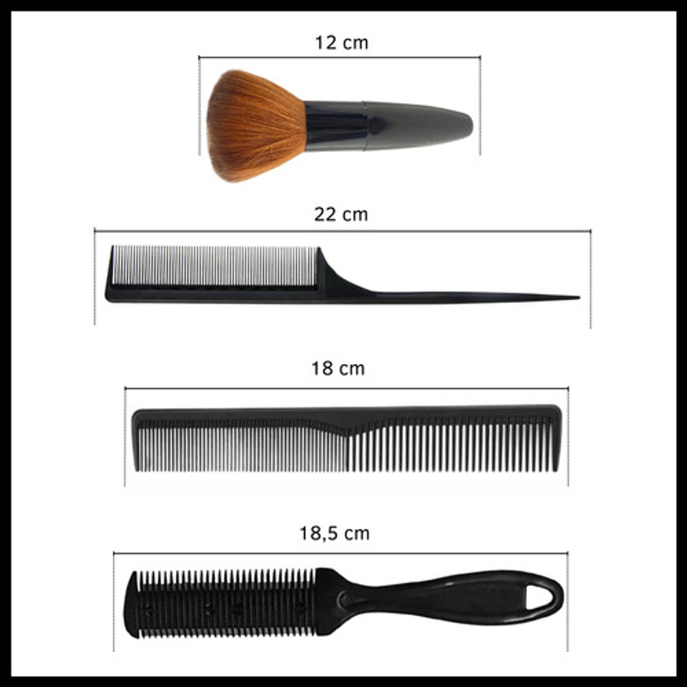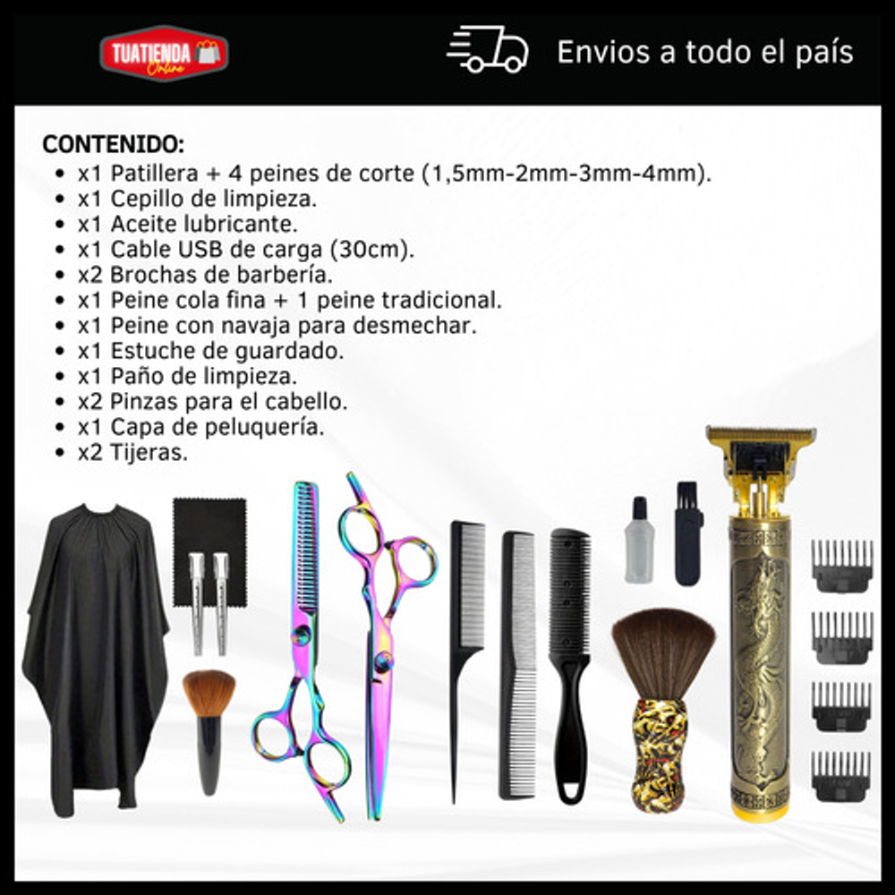 COMBO PARA BARBERIA O PELUQUERIA: MAQUINA DE PELO, PEINES, TIJERAS, CAPA, BROCHAS.