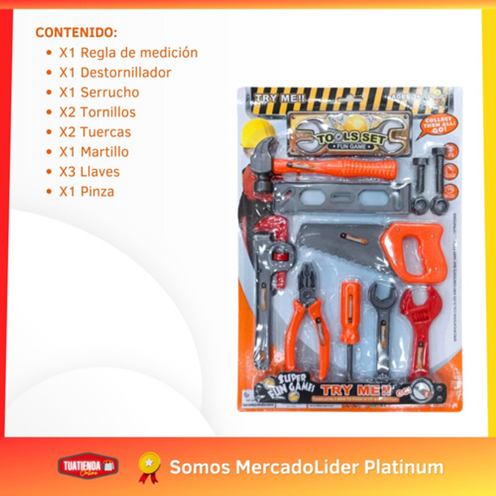 Contiene: • 1 Regla de medición. • 1 Destornillador. • 1 Serrucho. • 2 Tornillos. • 2 Tuercas. • 1 Martillo. • 3 Llaves. • 1 Pinza.