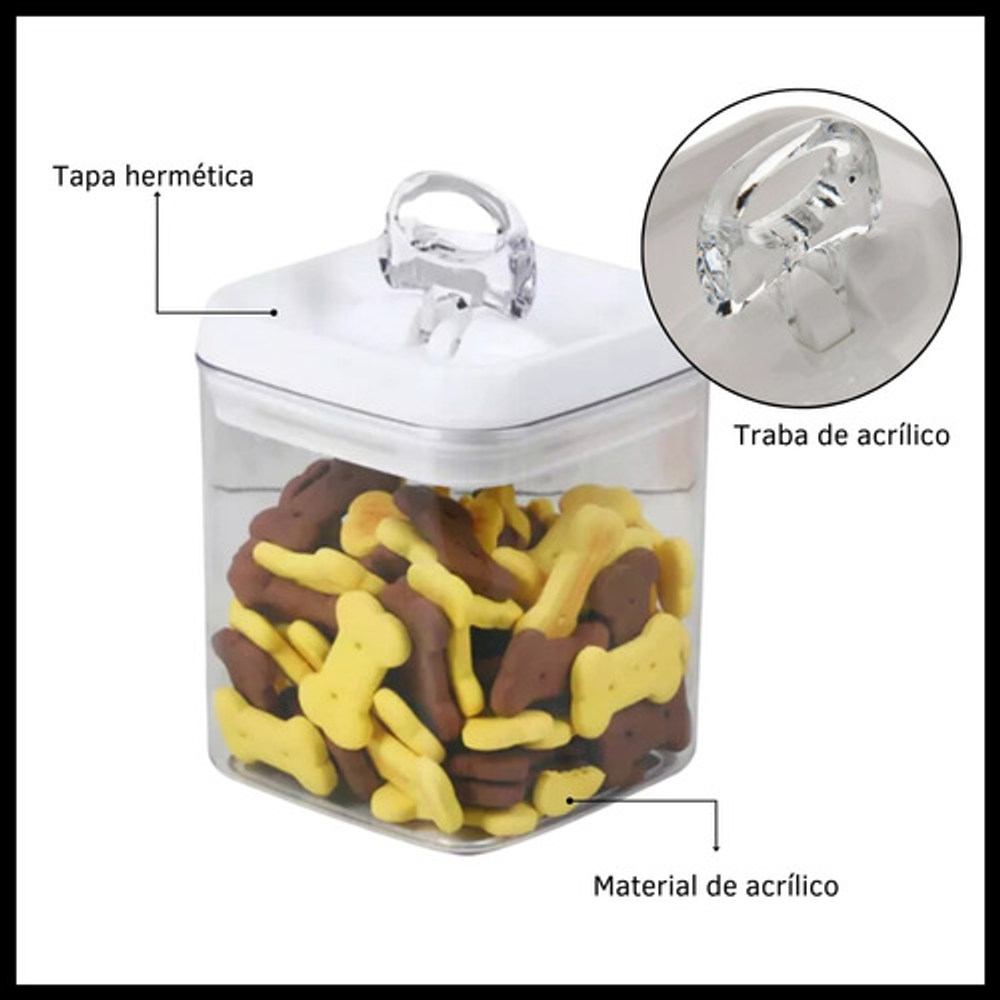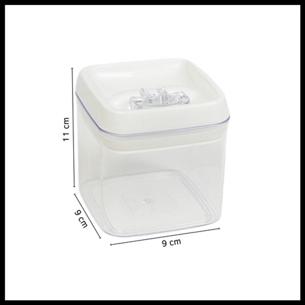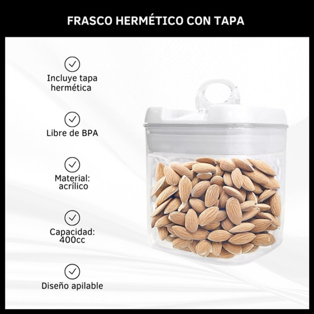 Características: • Diseño apilable y fácil de almacenar, optimizando el espacio disponible. • Ideal para mantener el orden y almacenar gran variedad de alimentos. •Tapa hermética que permite mantener los alimentos frescos por más tiempo. • Material: acrílico libre de BPA. • Capacidad: 400cc.