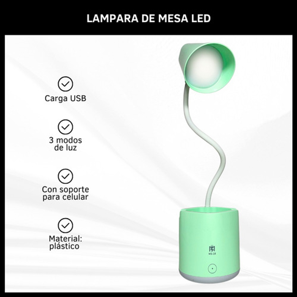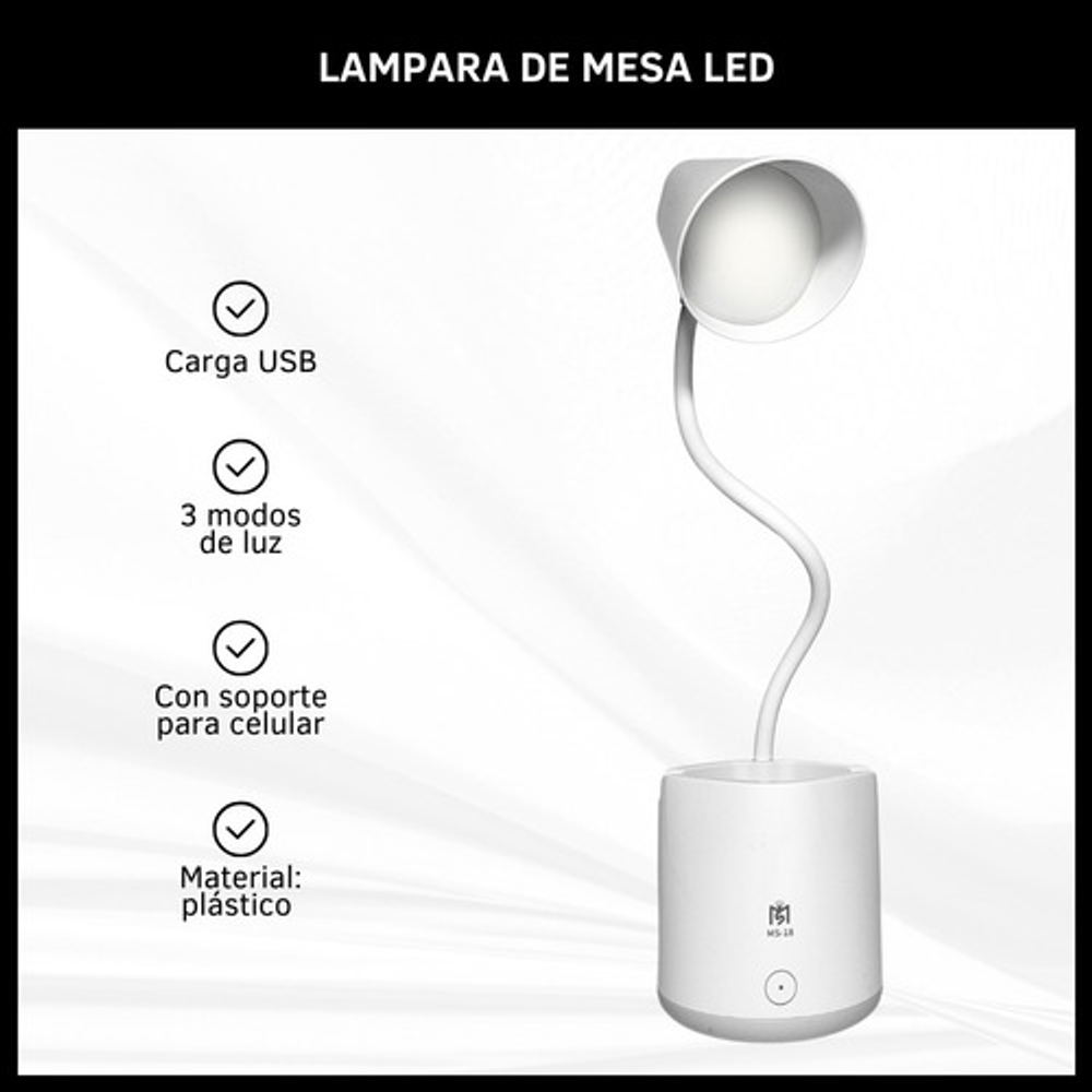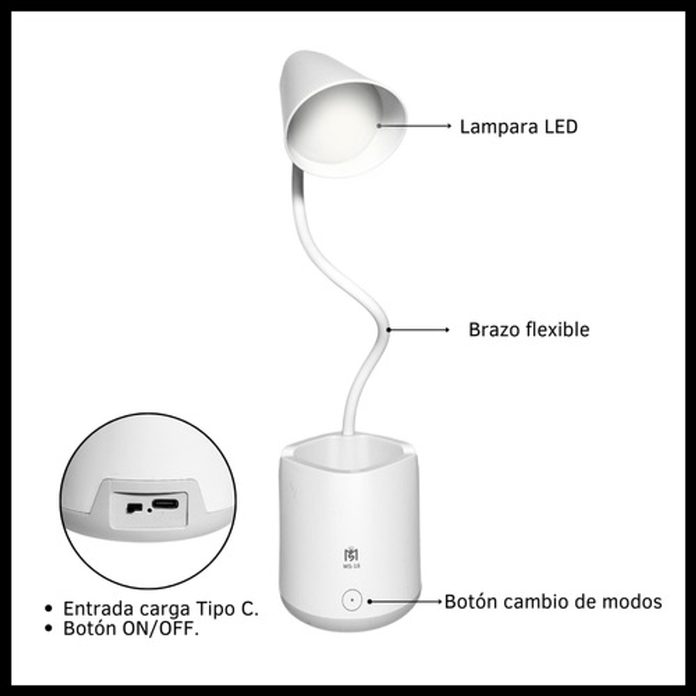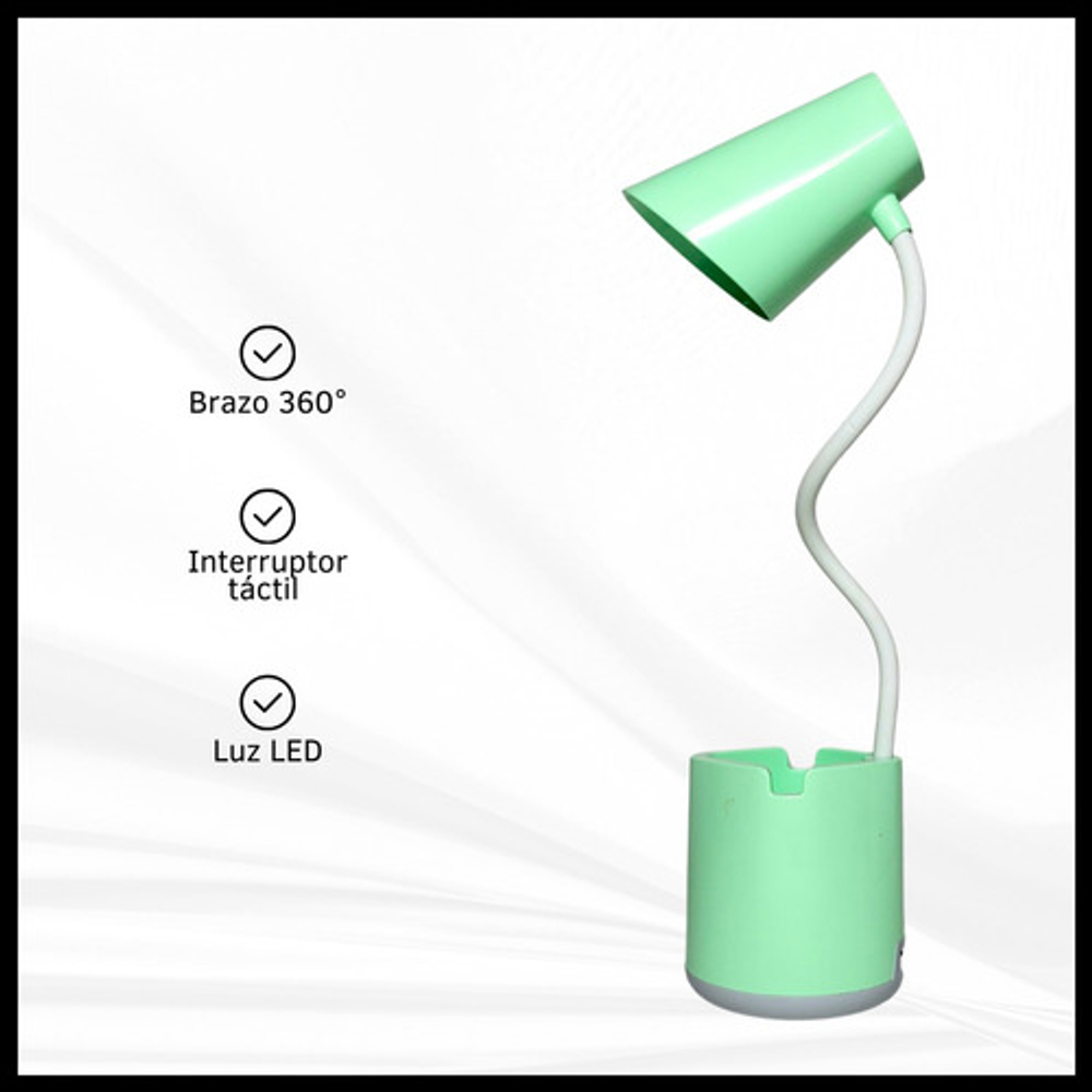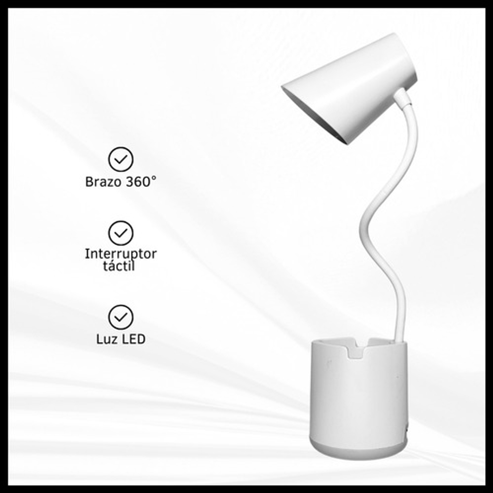 Características: • Posee tres modos de iluminación. • Con soporte para celular. • Carga con USB tipo C. • Ideal para tu escritorio. • Durabilidad eléctrica. • Material: plástico. • Interruptor táctil. • Brazo flexible. • Luz LED.