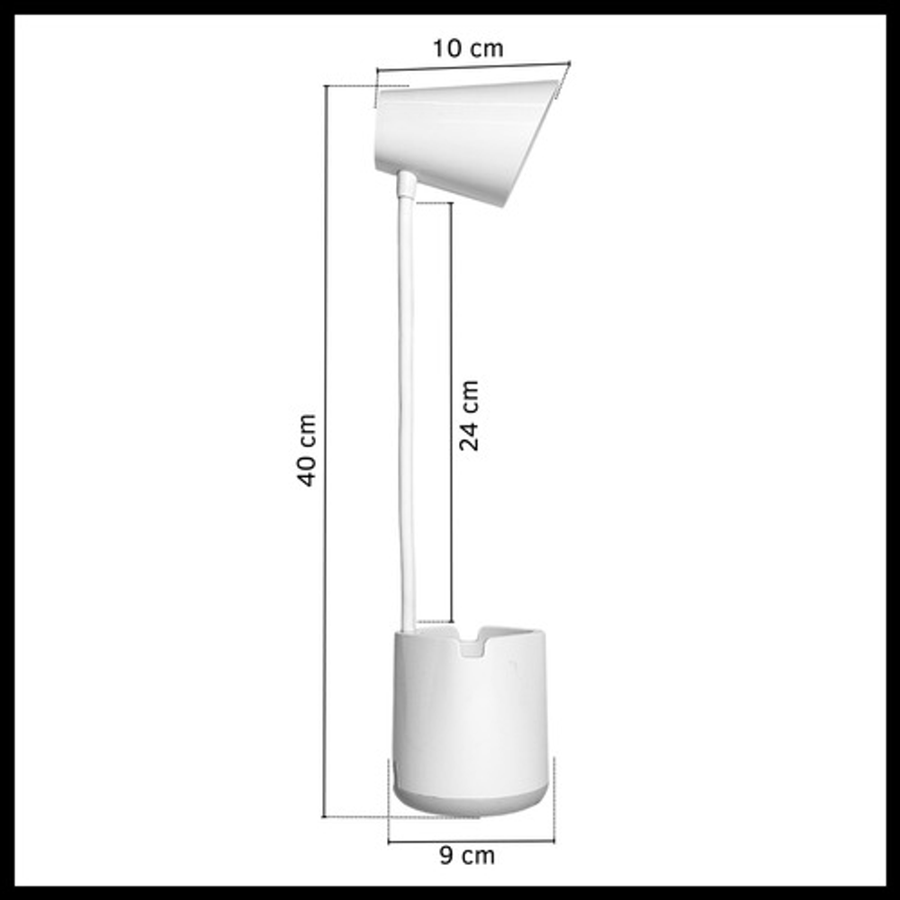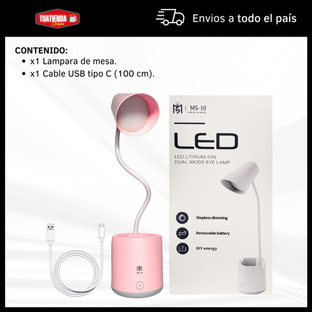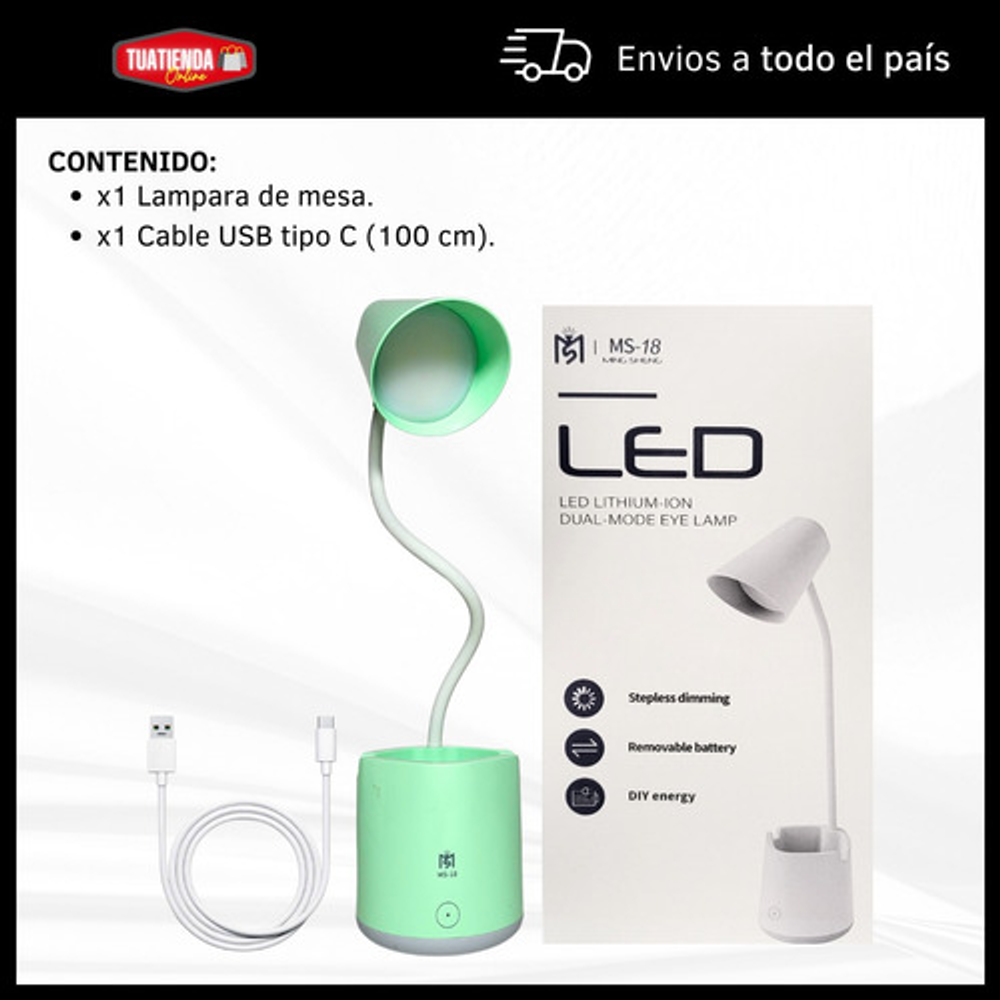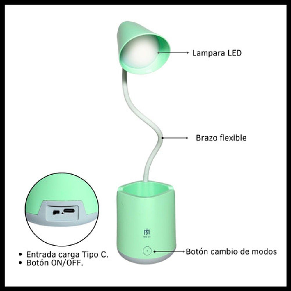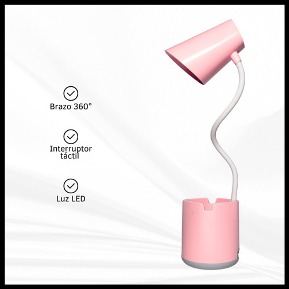 Características: • Posee tres modos de iluminación. • Con soporte para celular. • Carga con USB tipo C. • Ideal para tu escritorio. • Durabilidad eléctrica. • Material: plástico. • Interruptor táctil. • Brazo flexible. • Luz LED.