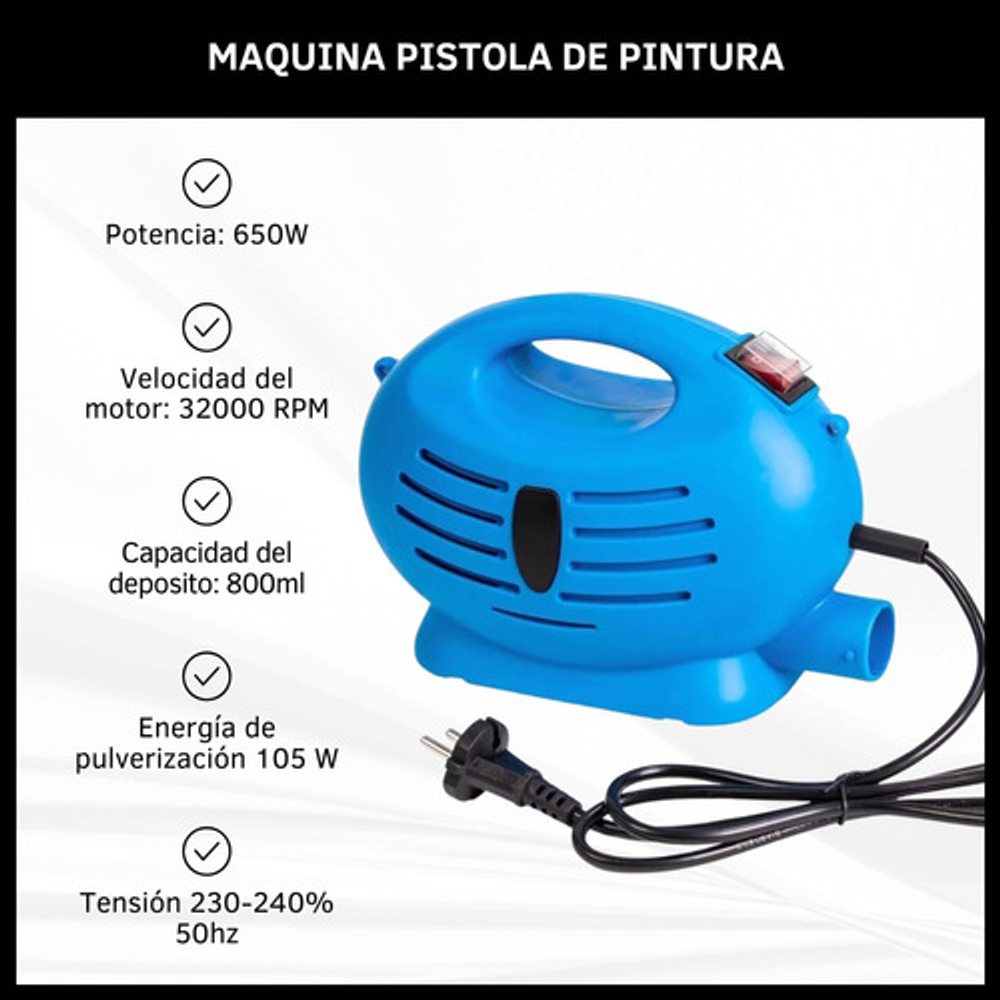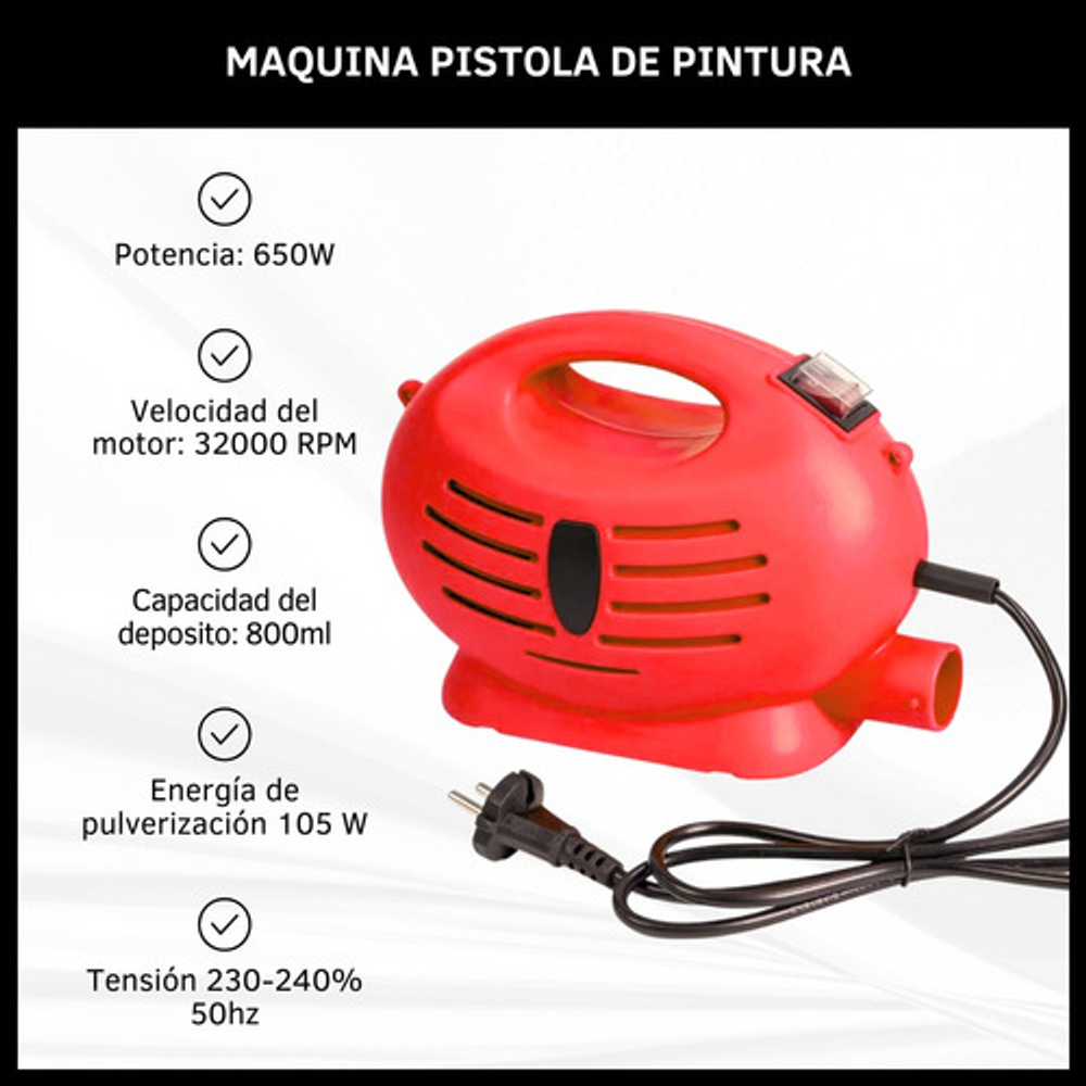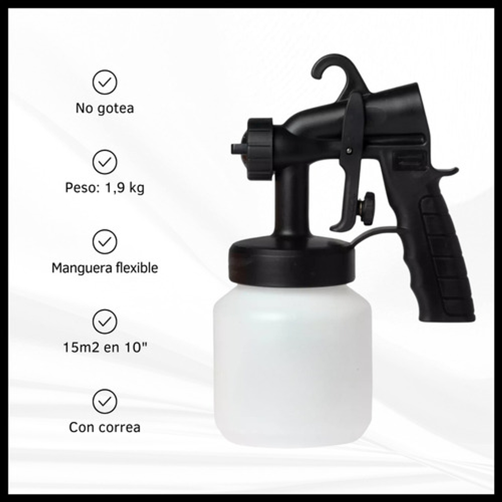 CARACTERÍSTICAS • No gotea. • Peso: 1,9kg. • Con correa. • 15 m2 en 10". • Potencia: 600W. • Manguera flexible. • Perfecta terminación. • Muy buena terminación. • Tensión 230-240% 50Hz. • Para todo tipo de superficies. • Largo de la manguera: 1,10 mts. • Capacidad del deposito: 800ml. • Energía de pulverización 105 W. • Velocidad del motor: 32000 RPM. • Ahorro de tiempo y mano de obra.