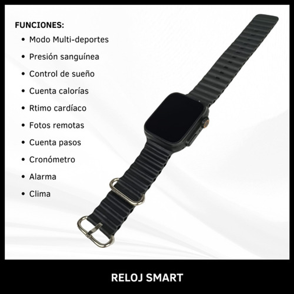 Funciones del smartwatch: Alarma,Clima,Control de sueño,Cronómetro,Cuenta calorías,Cuenta pasos,Fotos remotas,Modo Multi-deportes,Presión sanguinea,Rtimo cardíaco