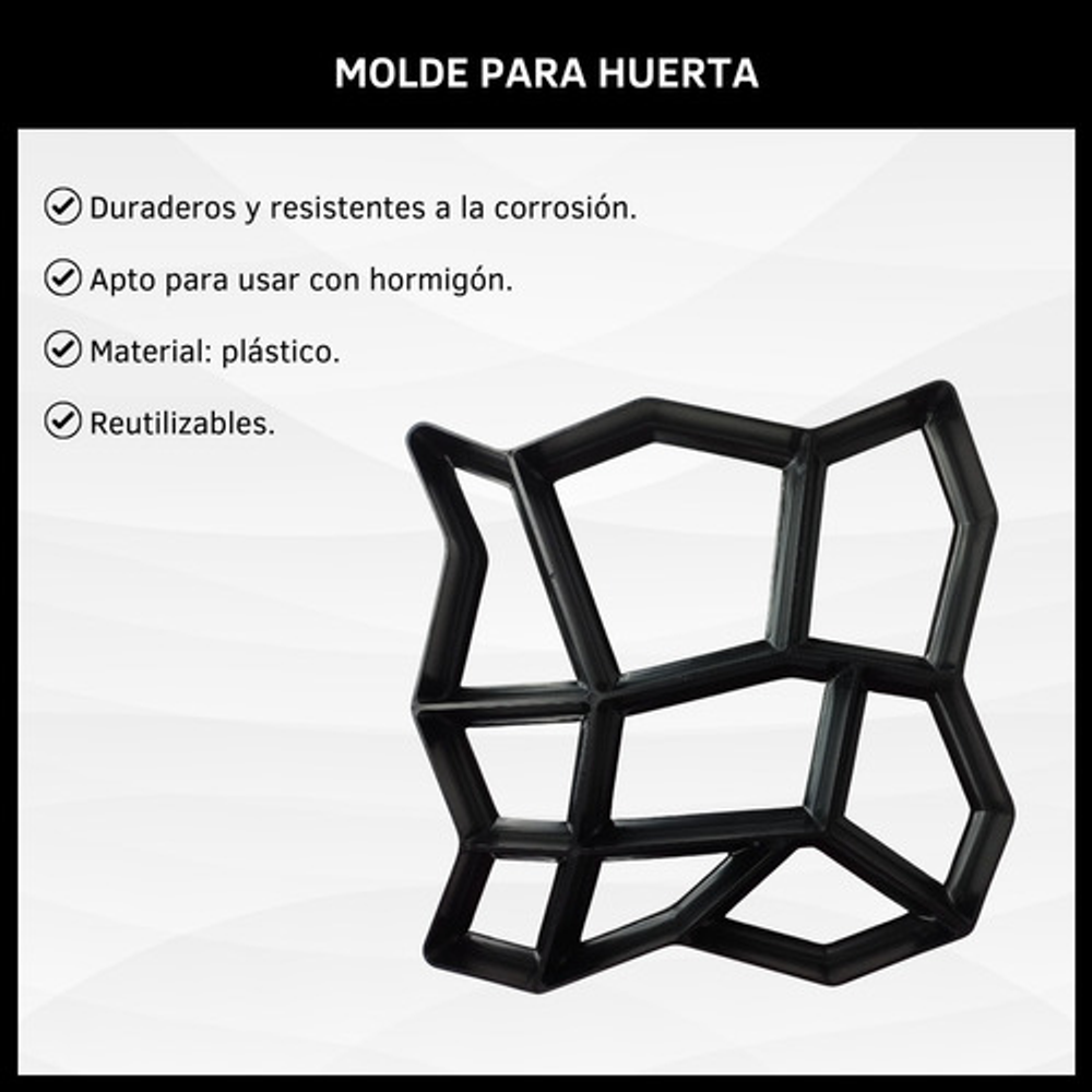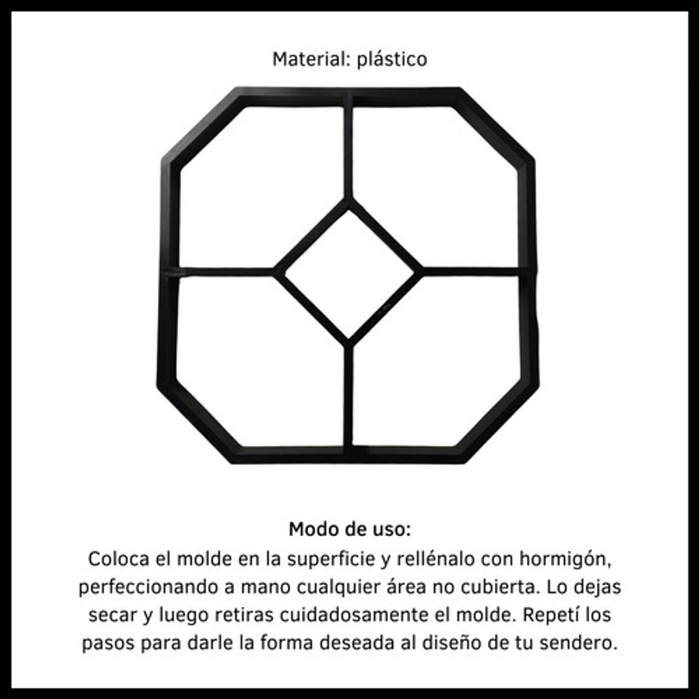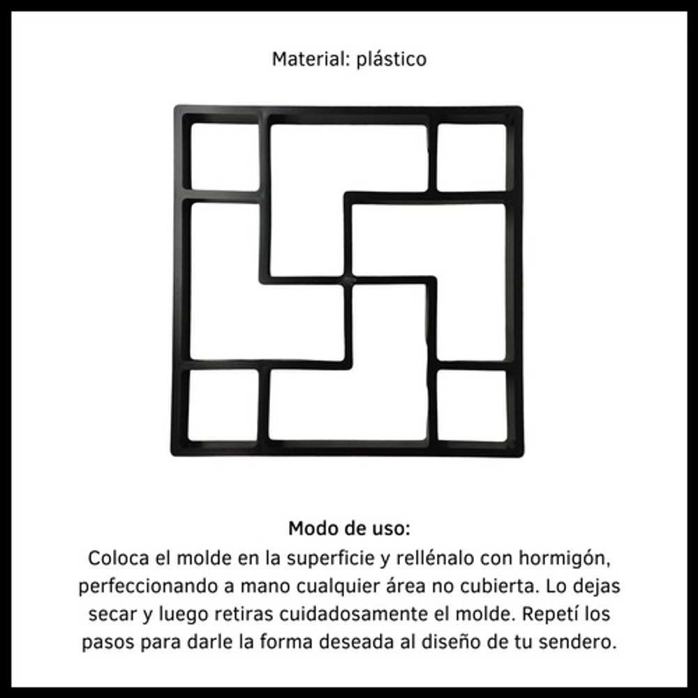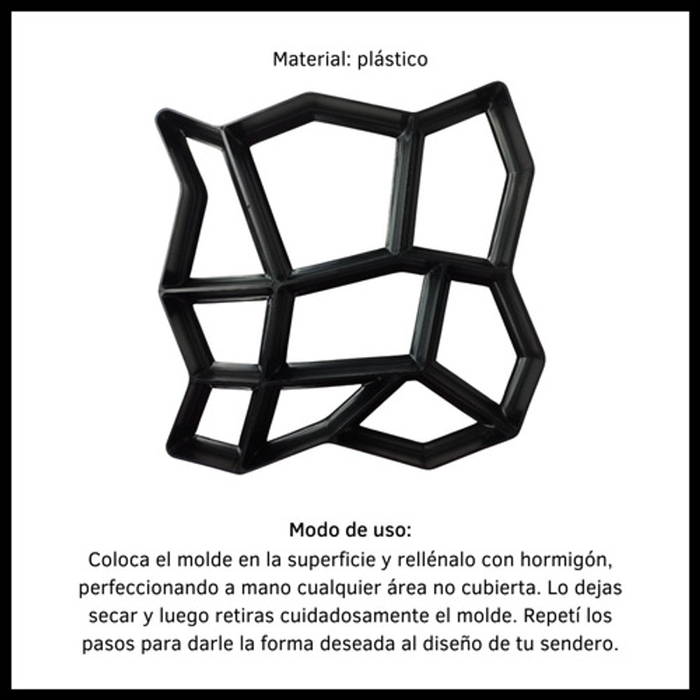 MODO DE USO: Coloca el molde en la superficie y rellénalo con hormigón, perfeccionado a mano cualquier área no cubierta. Dejar secar y luego retirar cuidadosamente el molde. Repetí los pasos para darle la forma deseada al diseño de tu sendero.