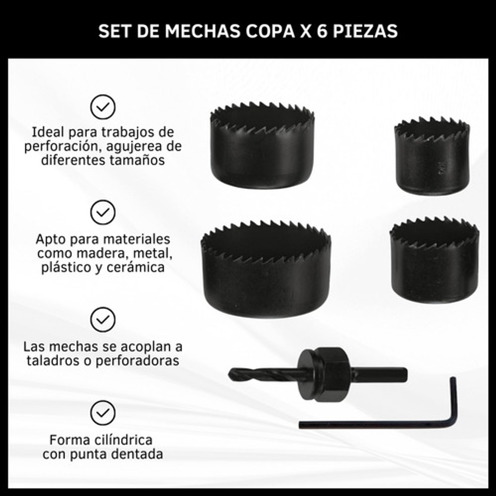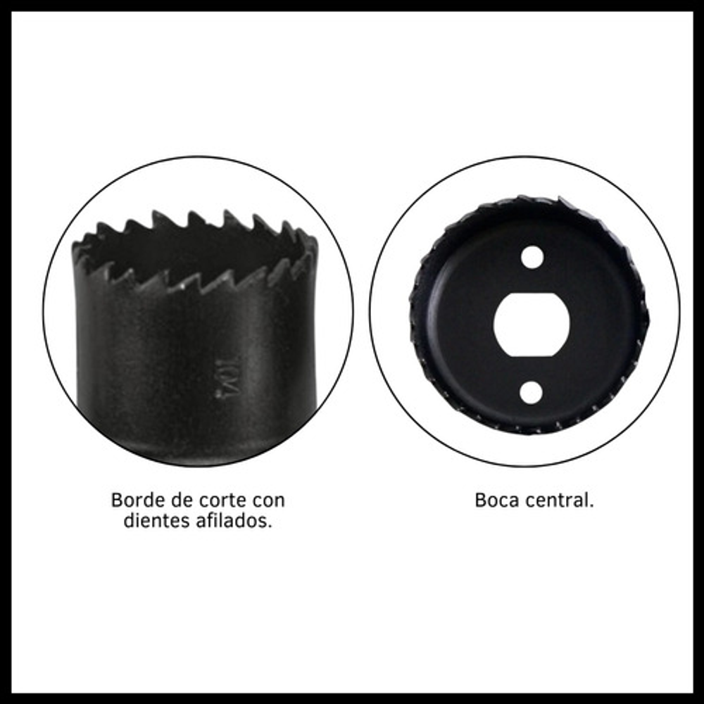 Características: -Ideal para trabajos de perforación, agujerea de diferentes tamaños. -Aptos para materiales como madera, metal, plástico y cerámica. -Las mechas se acoplan a taladros o perforadoras. -Forma cilíndrica con punta dentada.