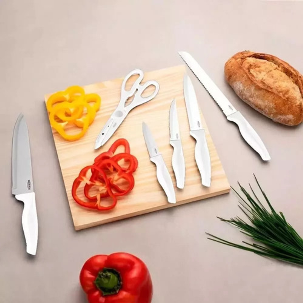 Este set incluye 1 cuchillo de carne 8”, 1 cuchillo para pan, 1 cuchillo de cocina 6”, 1 cuchillo de verduras 3 ½”, 1 cuchillo multiuso y 1 tijera.