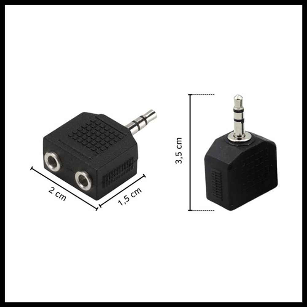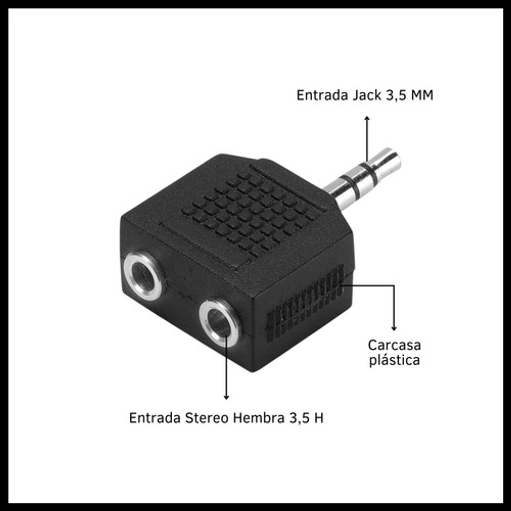Características: -Conector a dos entradas a la vez. -Adaptador Plug 3,5 mm a 2 Stereo 3,5H. -Tecnología Plug and Play.