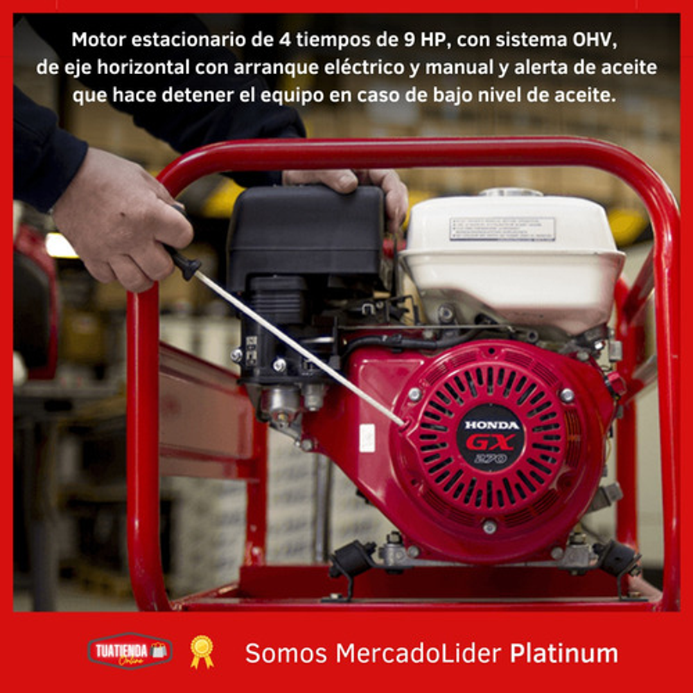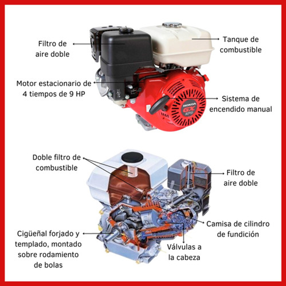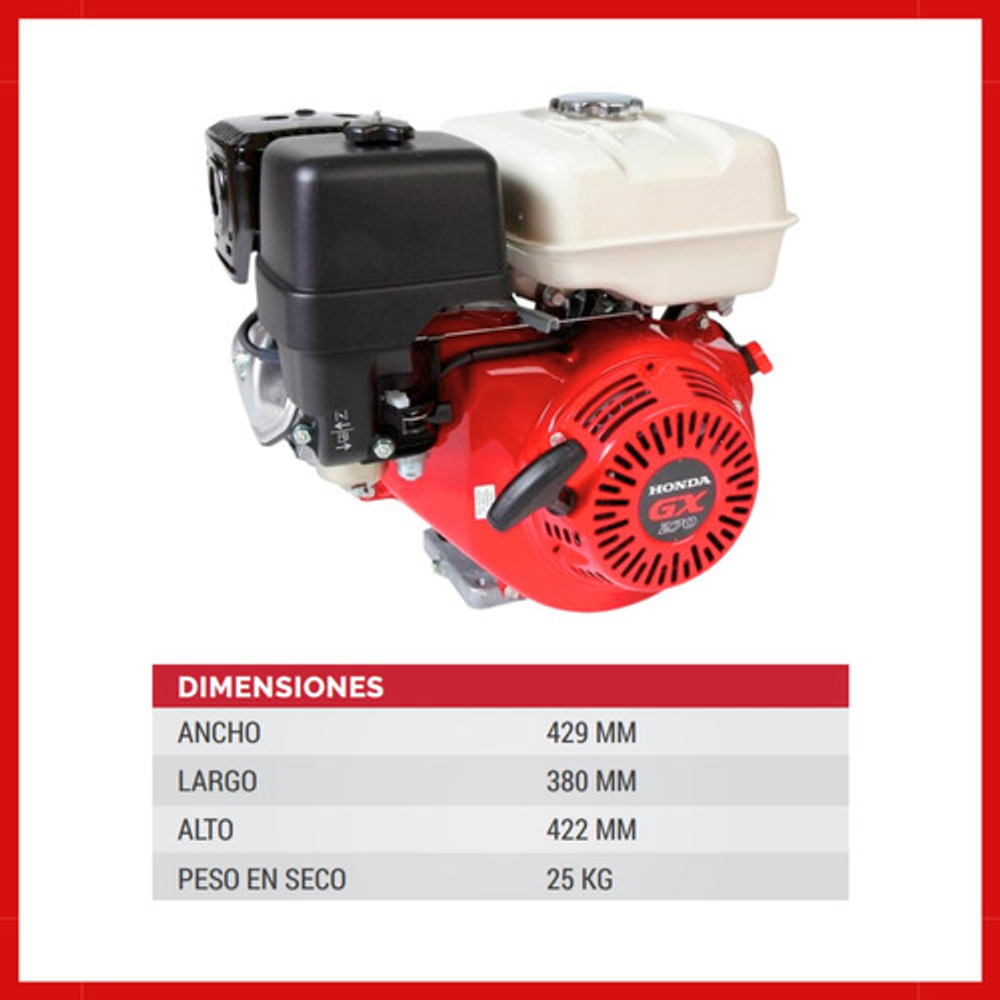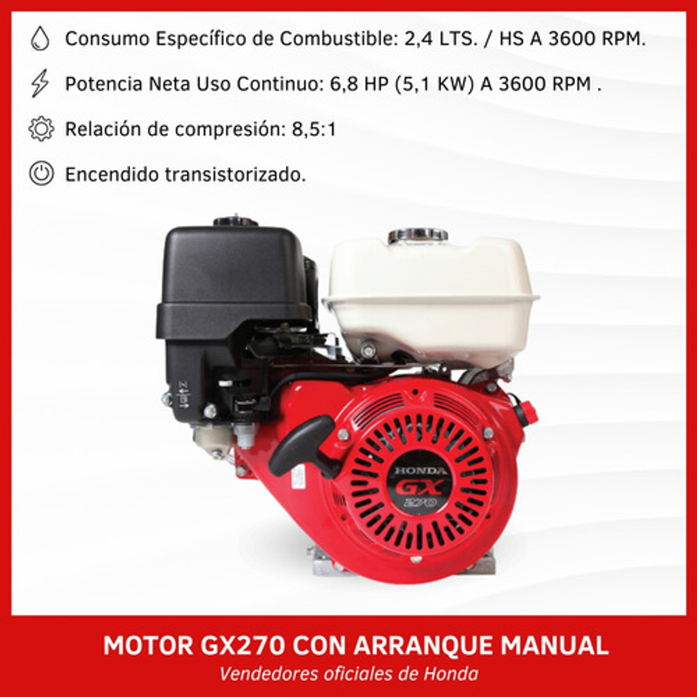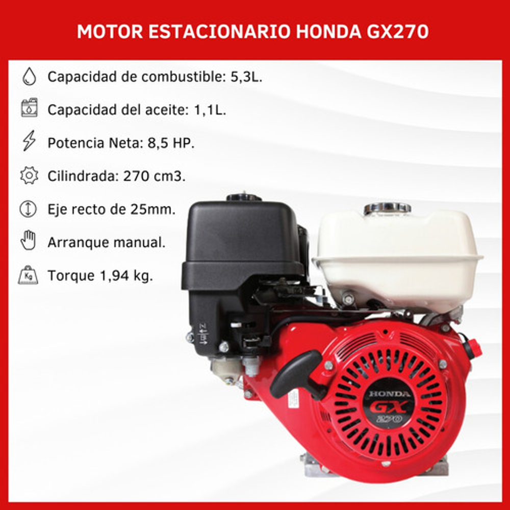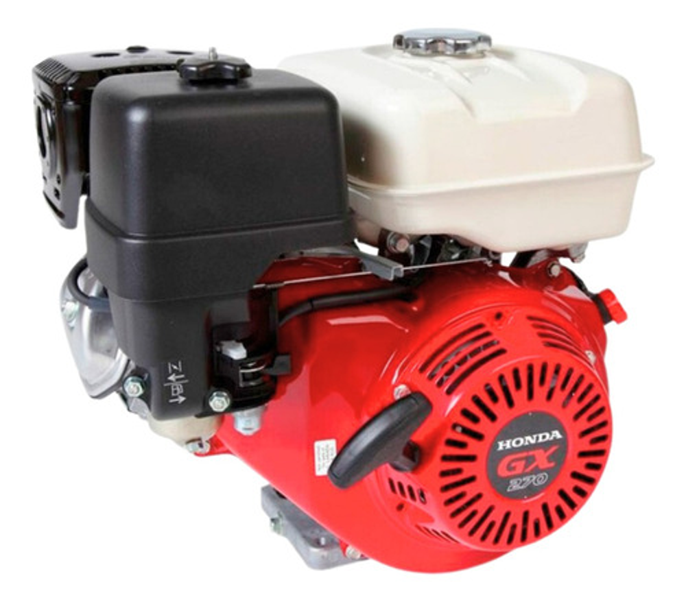 Motor Estacionario Honda GX 270 SX 9HP, Eje recto de 25mm, 4 tiempos con sistema OHV (válvulas a la cabeza), de eje horizontal con arranque manual y alerta de aceite que hace detener el equipo en caso de bajo nivel de aceite.