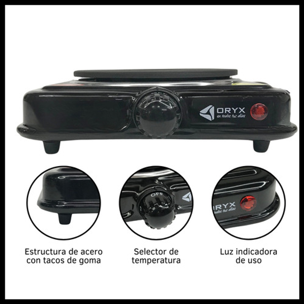 Características: • Potencia de 1000W. • Voltaje 220-240V. • Tiene 5 temperaturas regulables. • Cuenta con indicador de luz. • El diámetro de la hornalla es de 15,5 cm. • El largo total del cable es 90 cm.