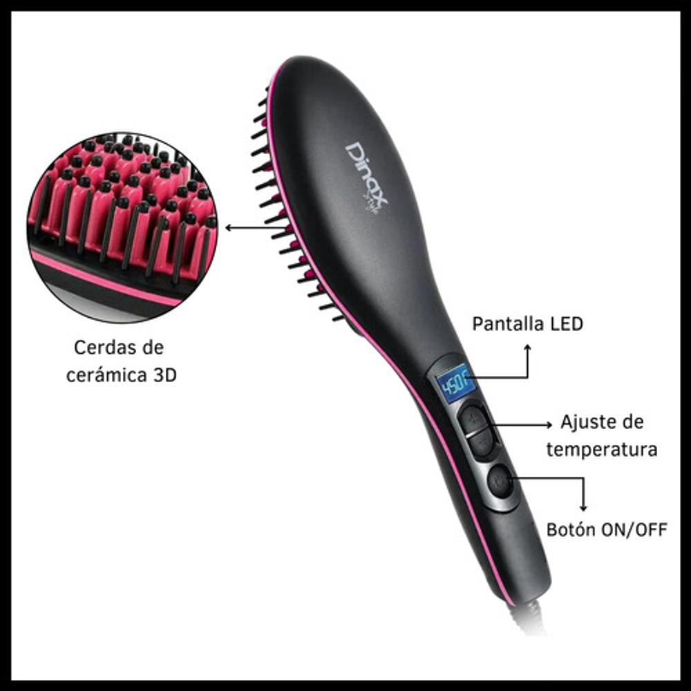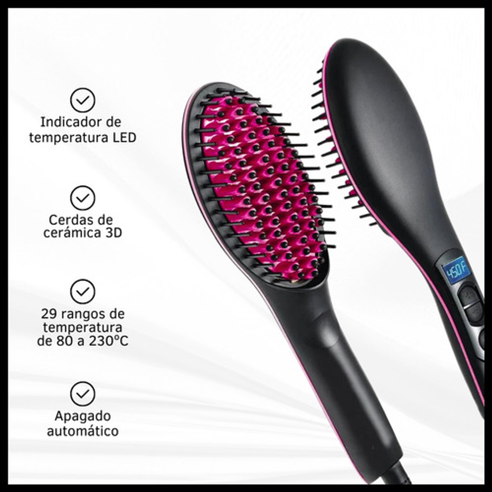 Características del cepillo alisador: • Botón de encendido y apagado. • Pantalla digital LCD. • 29 rangos de temperatura (80 a 230ºC/160-450ºF). • Temperatura en ºC o ºF. • Apagado automático luego de 60 minutos. • Calentamiento rápido. • Ideal para todo tipo de cabello.