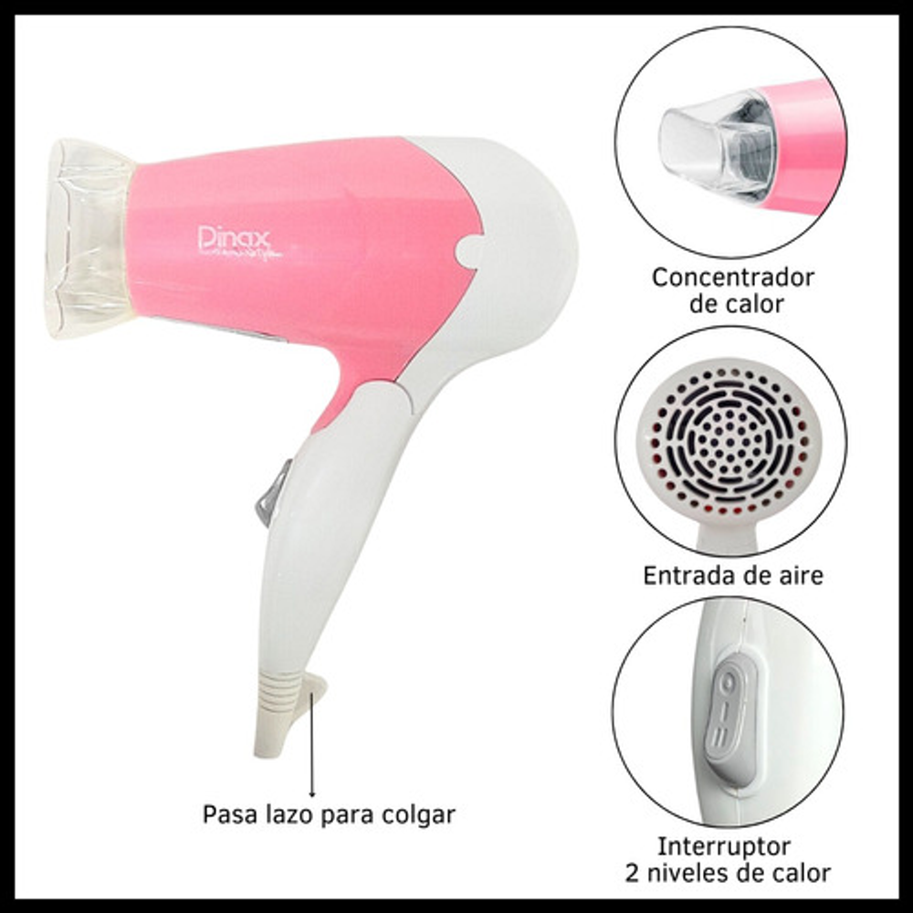 Caracteristicas del secador de pelo: • Temperatura máxima de 110º. • Plástico super resistente. • 1400 W de potencia. • 2 niveles de calor. • Super liviano. • Plegable.