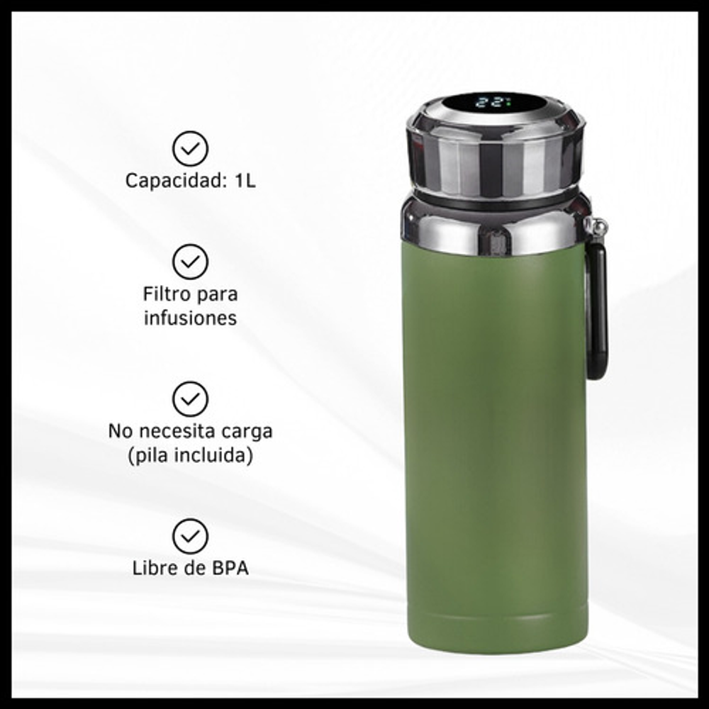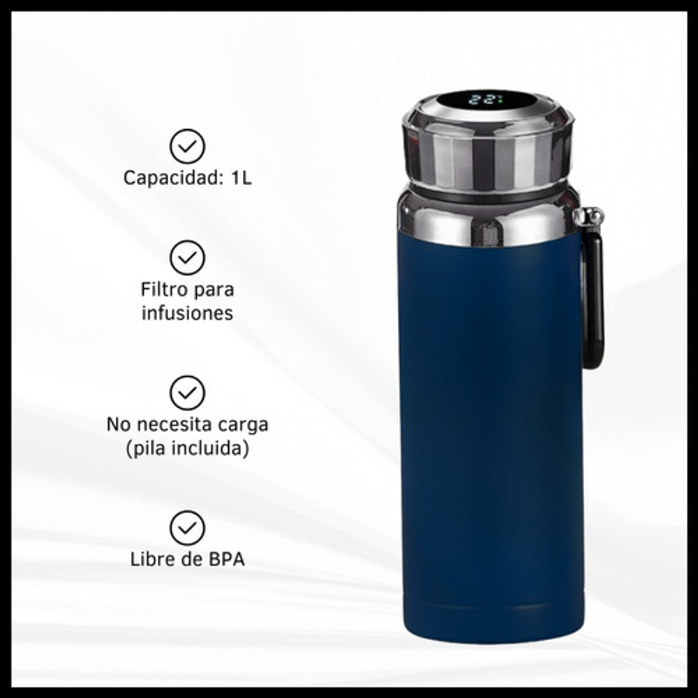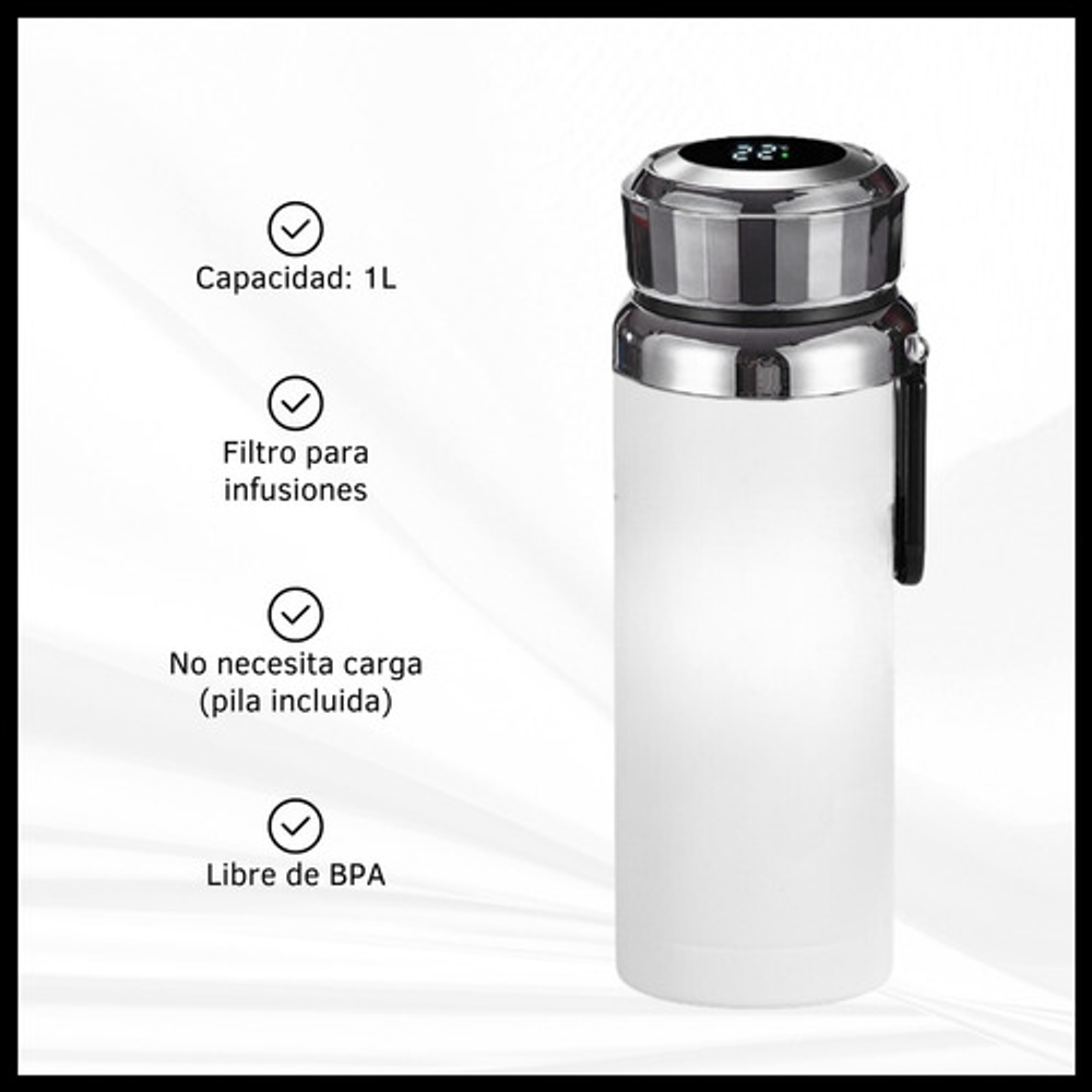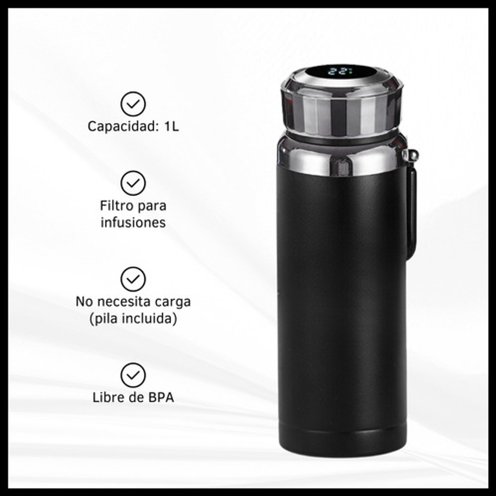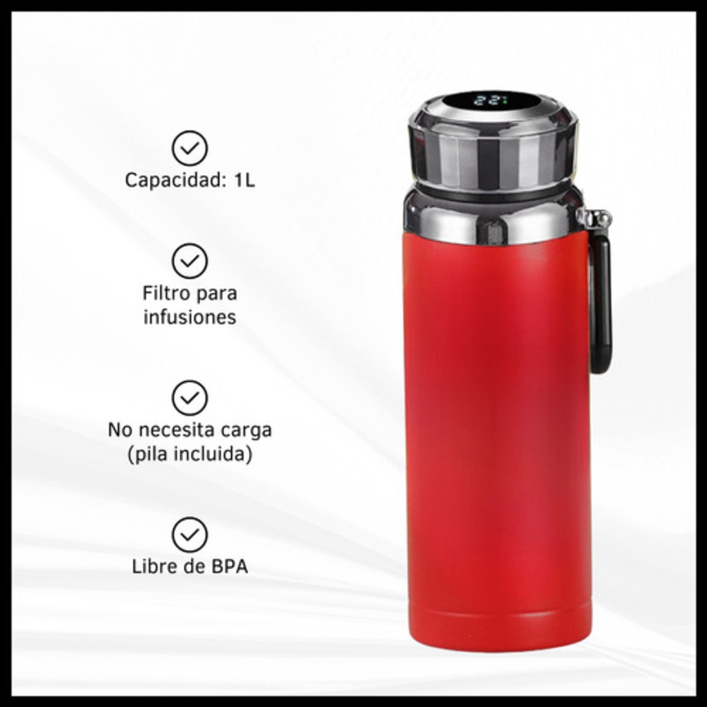 Características: -Indicador LED de temperatura en la tapa. -Fabricado de acero inoxidable. -Doble aislamiento térmico. -Filtro para infusiones. -Apto para frío y calor. -Capacidad: 1 litro. -Libre de BPA.