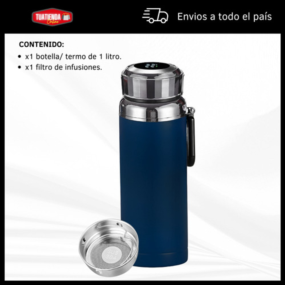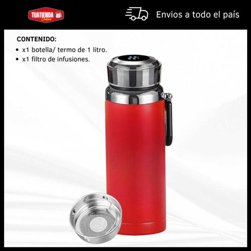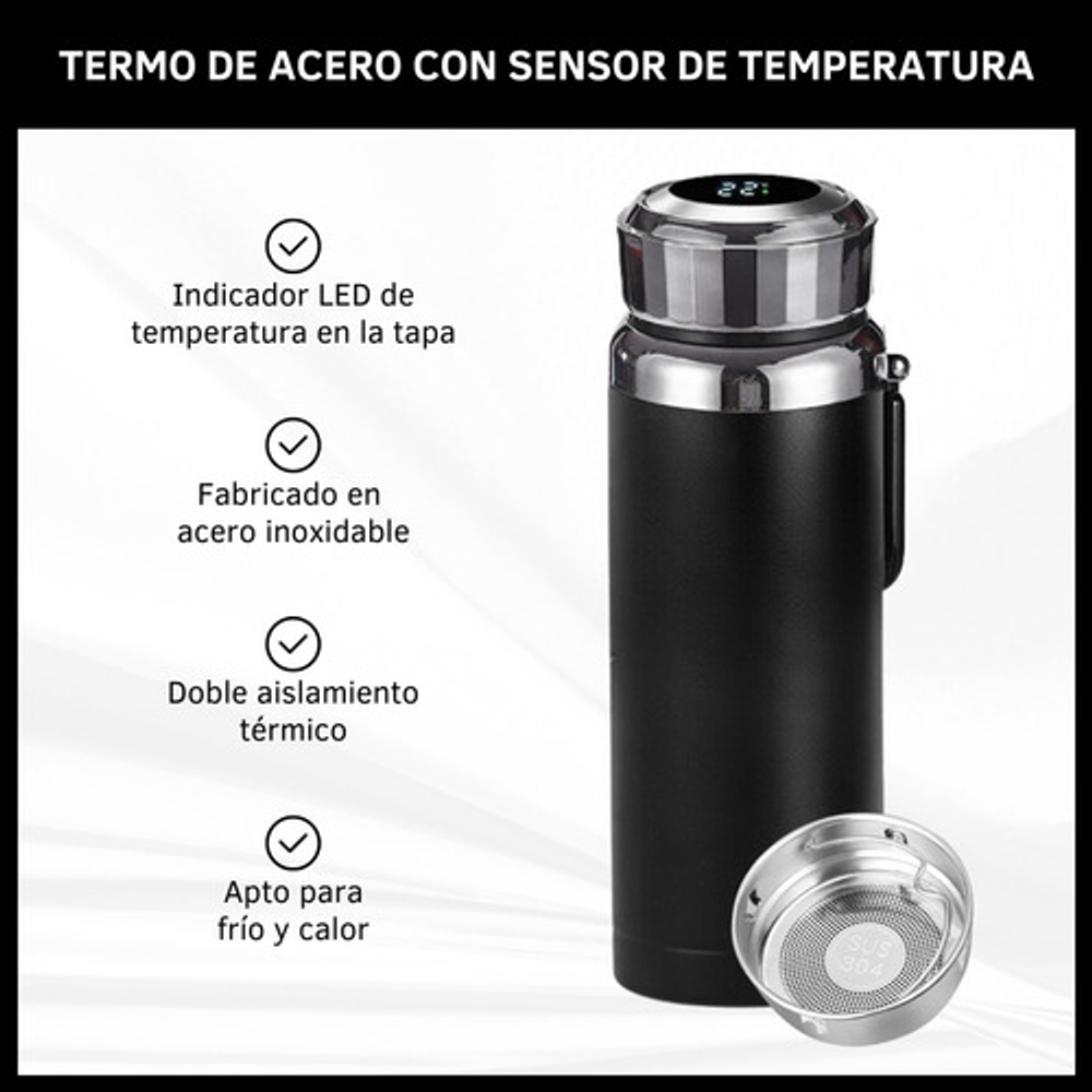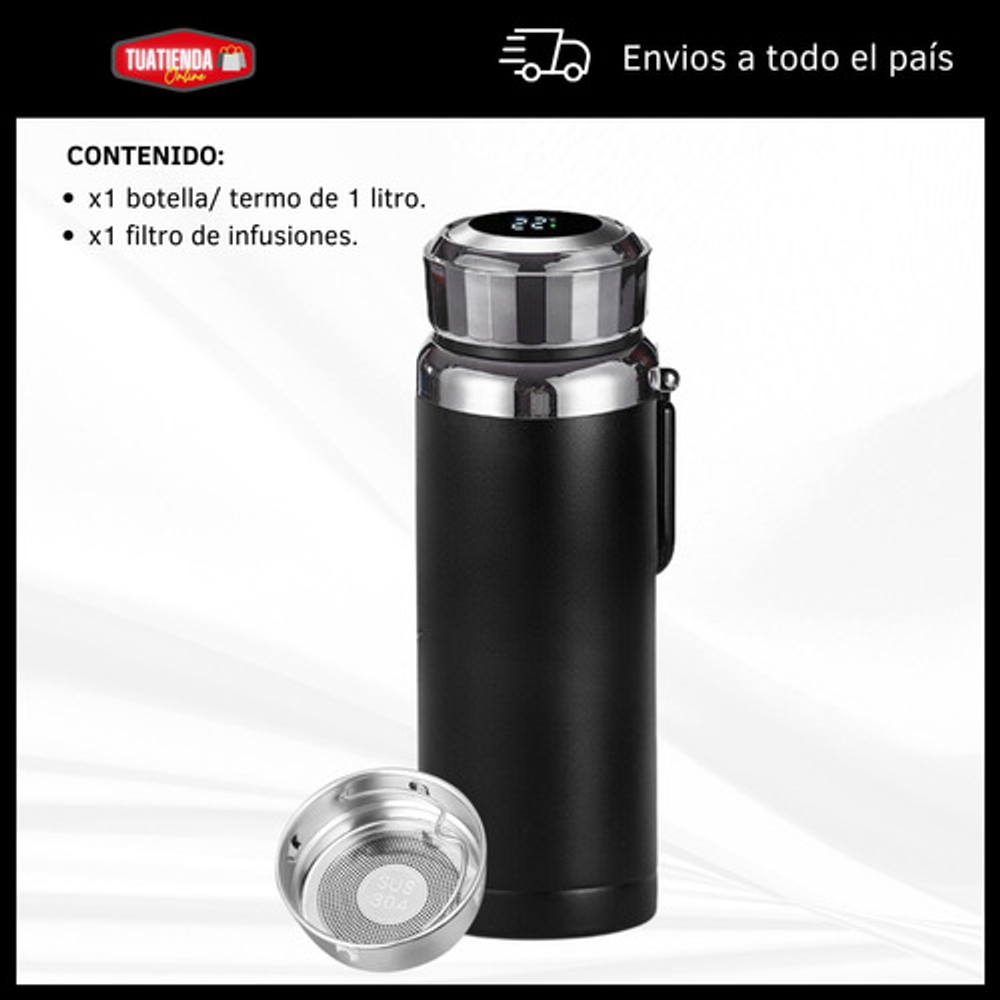 Características: -Indicador LED de temperatura en la tapa. -Fabricado de acero inoxidable. -Doble aislamiento térmico. -Filtro para infusiones. -Apto para frío y calor. -Capacidad: 1 litro. -Libre de BPA.