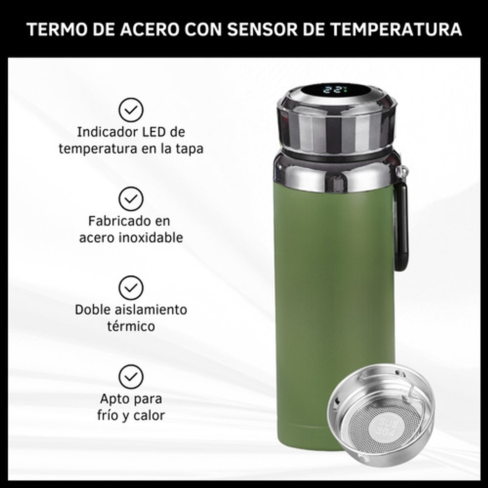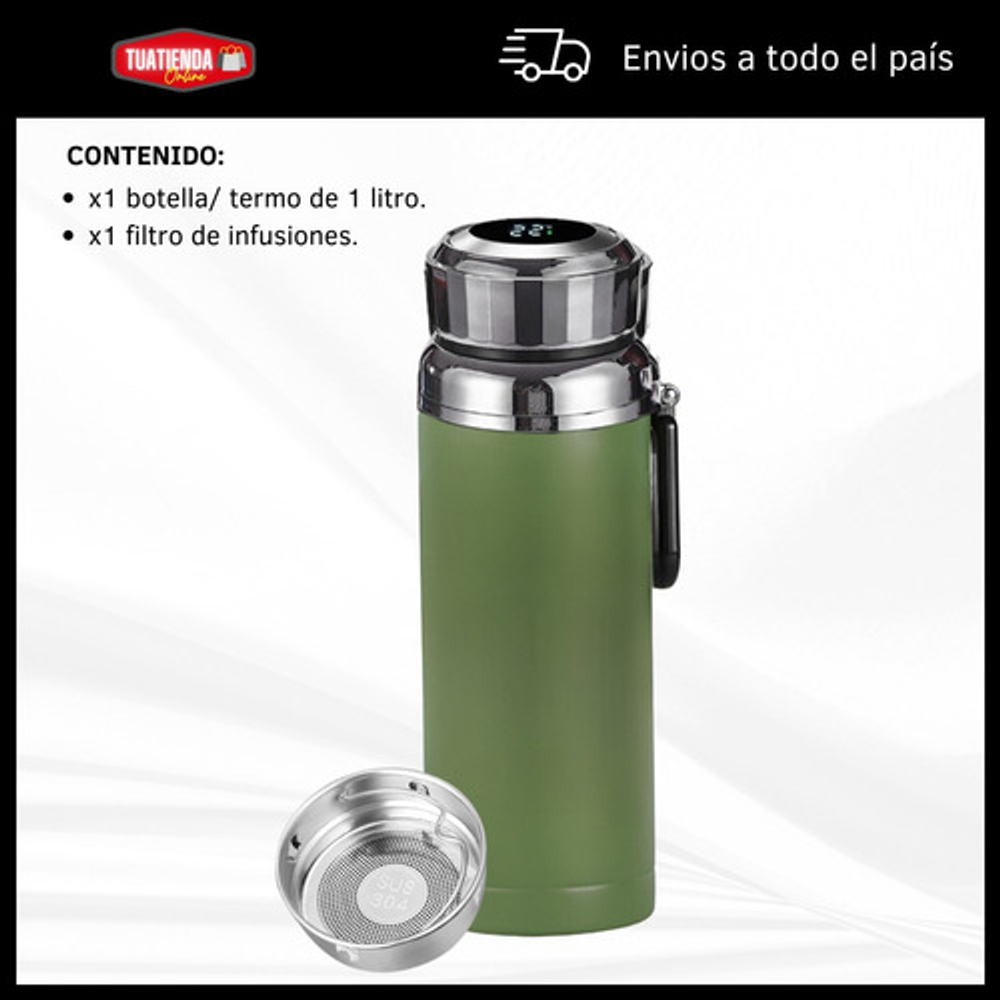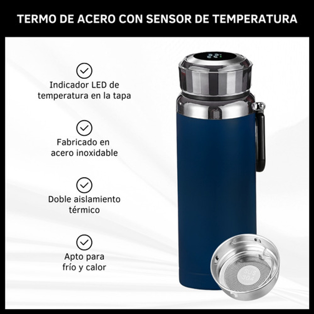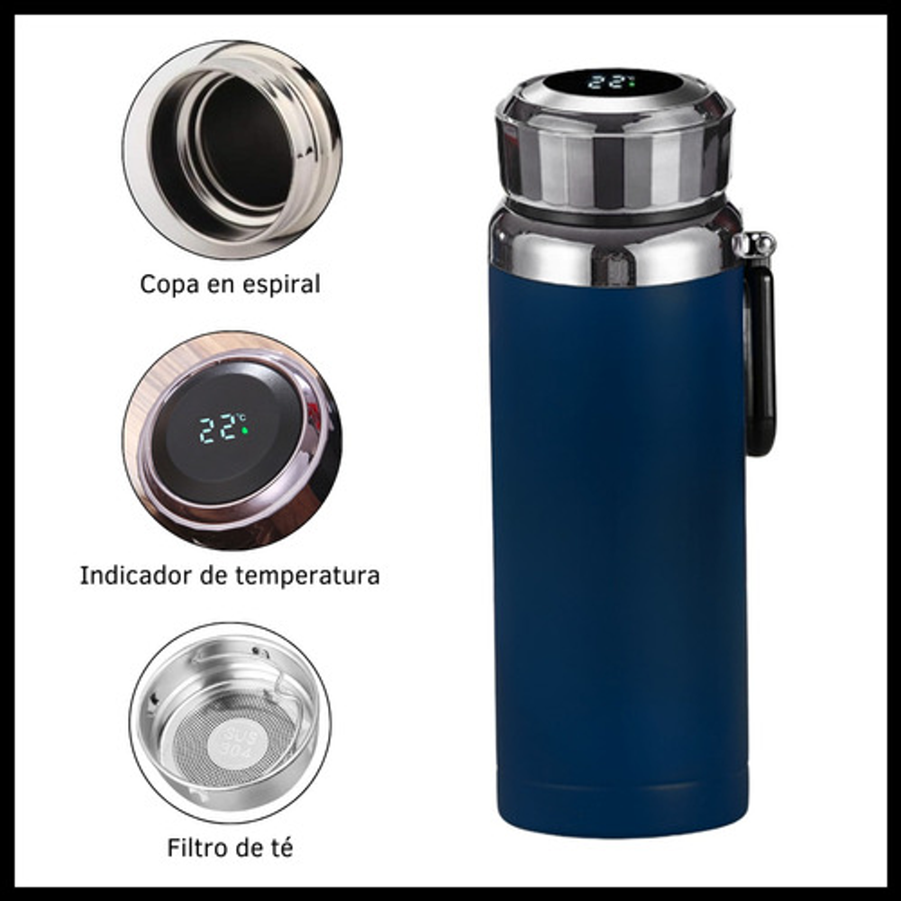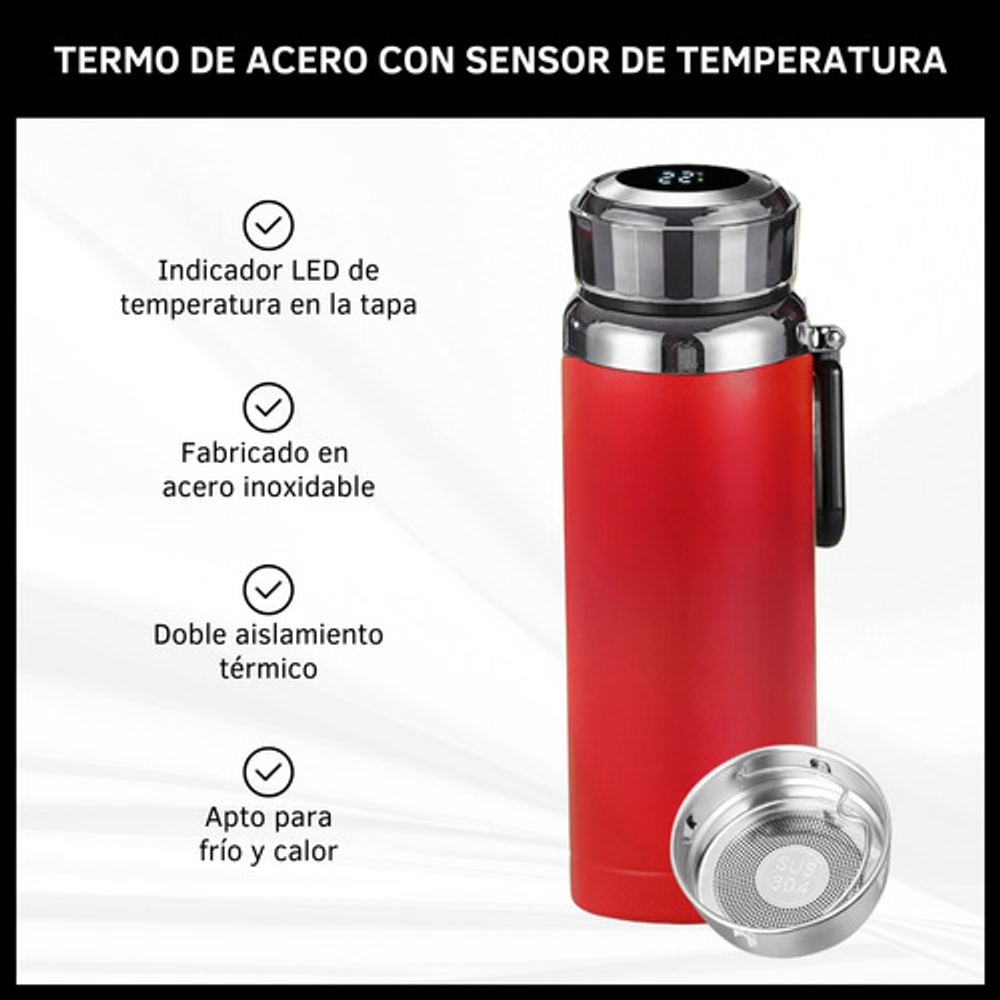 Características: -Indicador LED de temperatura en la tapa. -Fabricado de acero inoxidable. -Doble aislamiento térmico. -Filtro para infusiones. -Apto para frío y calor. -Capacidad: 1 litro. -Libre de BPA.
