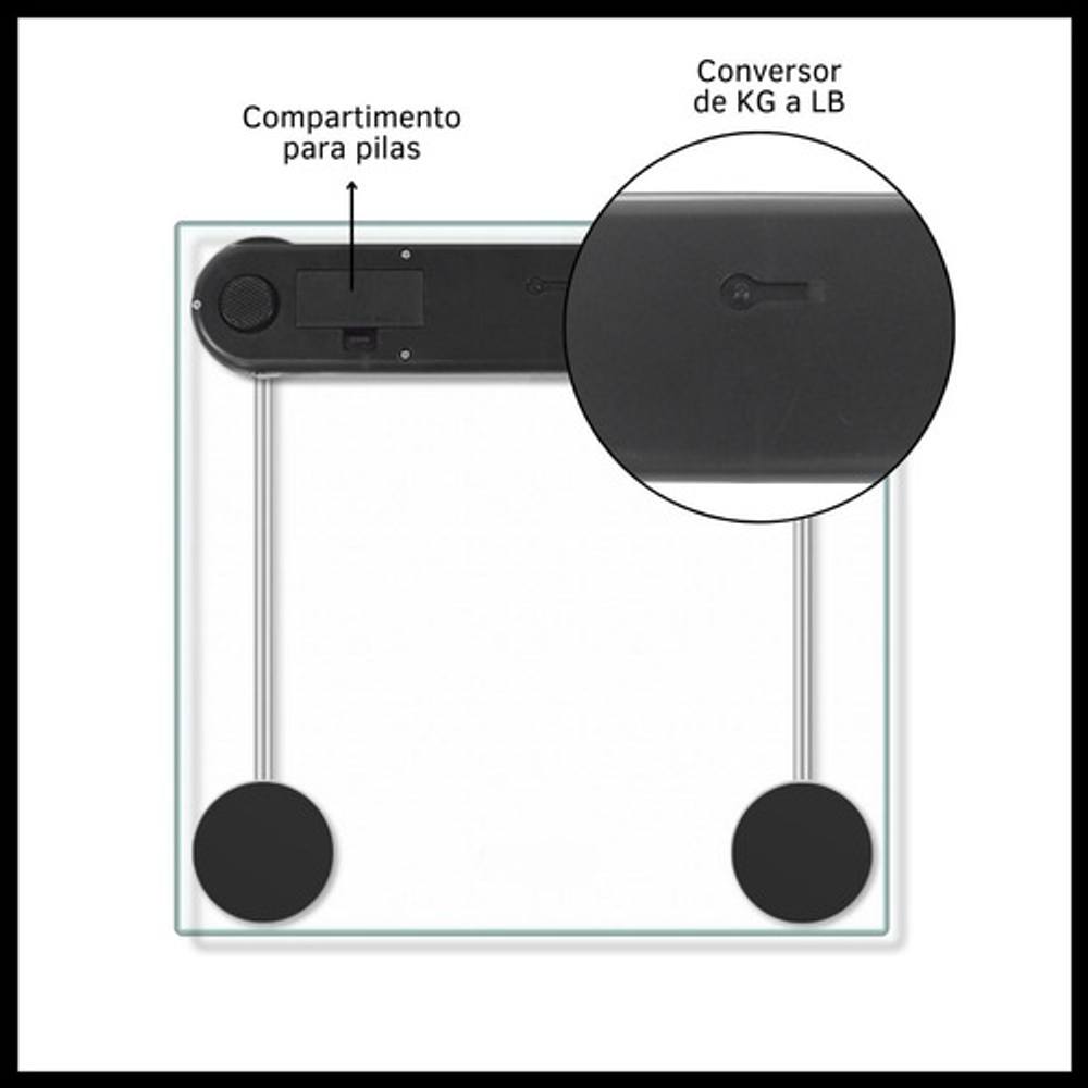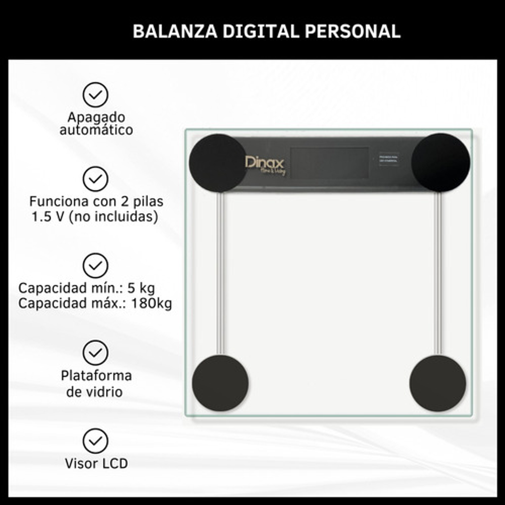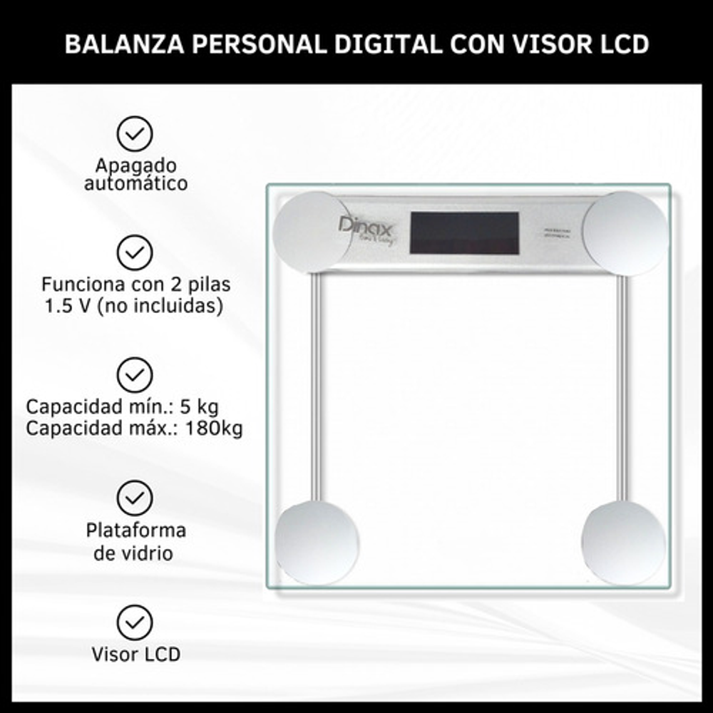 CARACTERÍSTICAS: -Apagado automático -Funciona con 2 pilas 1.5 V (no incluidas) -Capacidad mín.: 5 kg -Capacidad máx.: 180kg -Plataforma de vidrio -Visor LCD