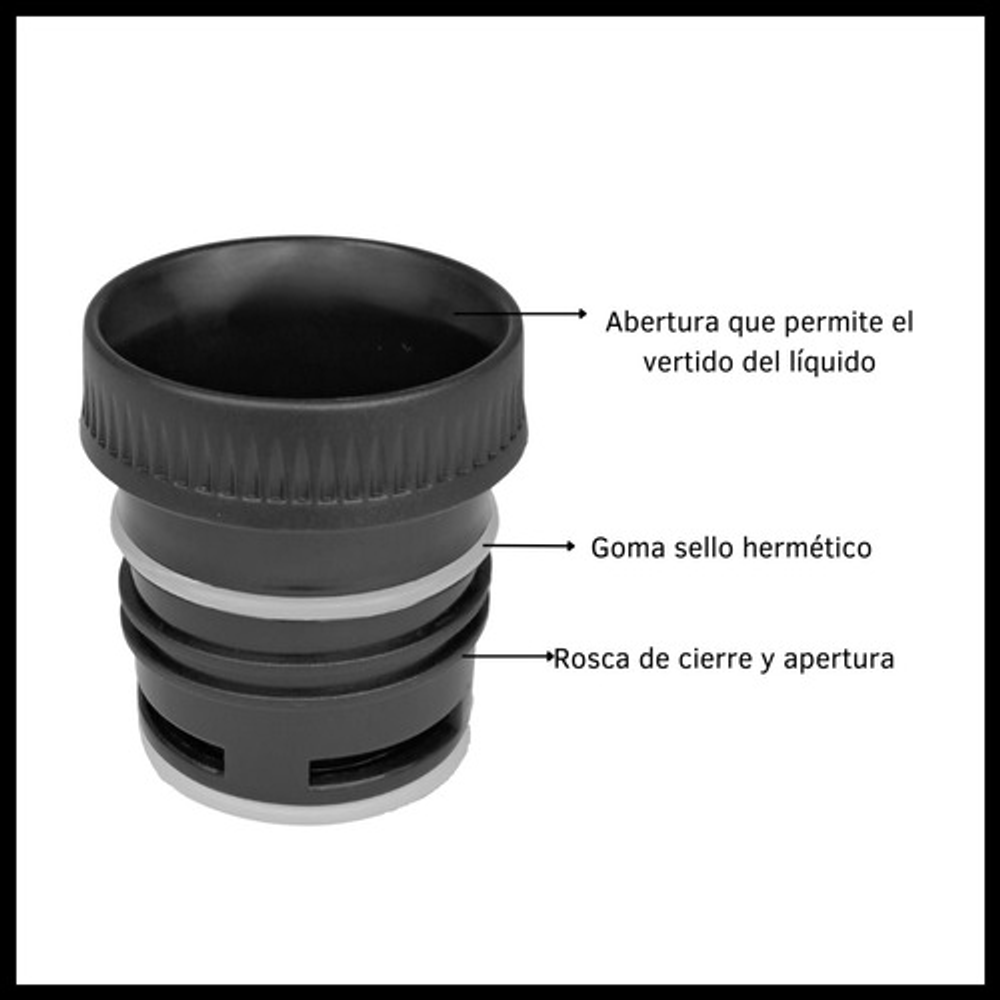 Características: • Material: Plástico. • Sistema de cierre y apertura a rosca. • Apto para diferentes tamaños de termo. • Goma de sello hermético.
