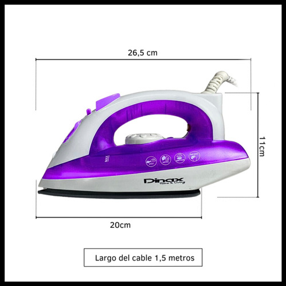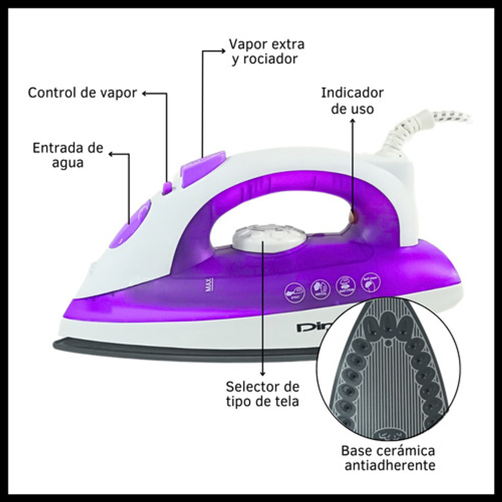 Características: • Termostato con selector de tipo de tela • Con rociador y golpe extra de vapor • Piloto indicador de temperatura • Base cerámica antiadherente • Tanque de agua traslucido • Vapor variable