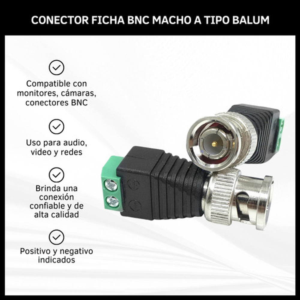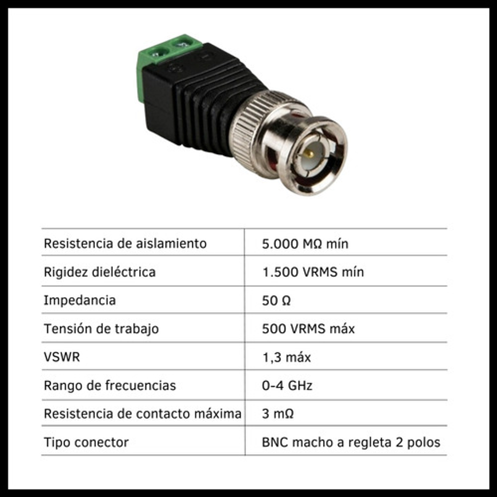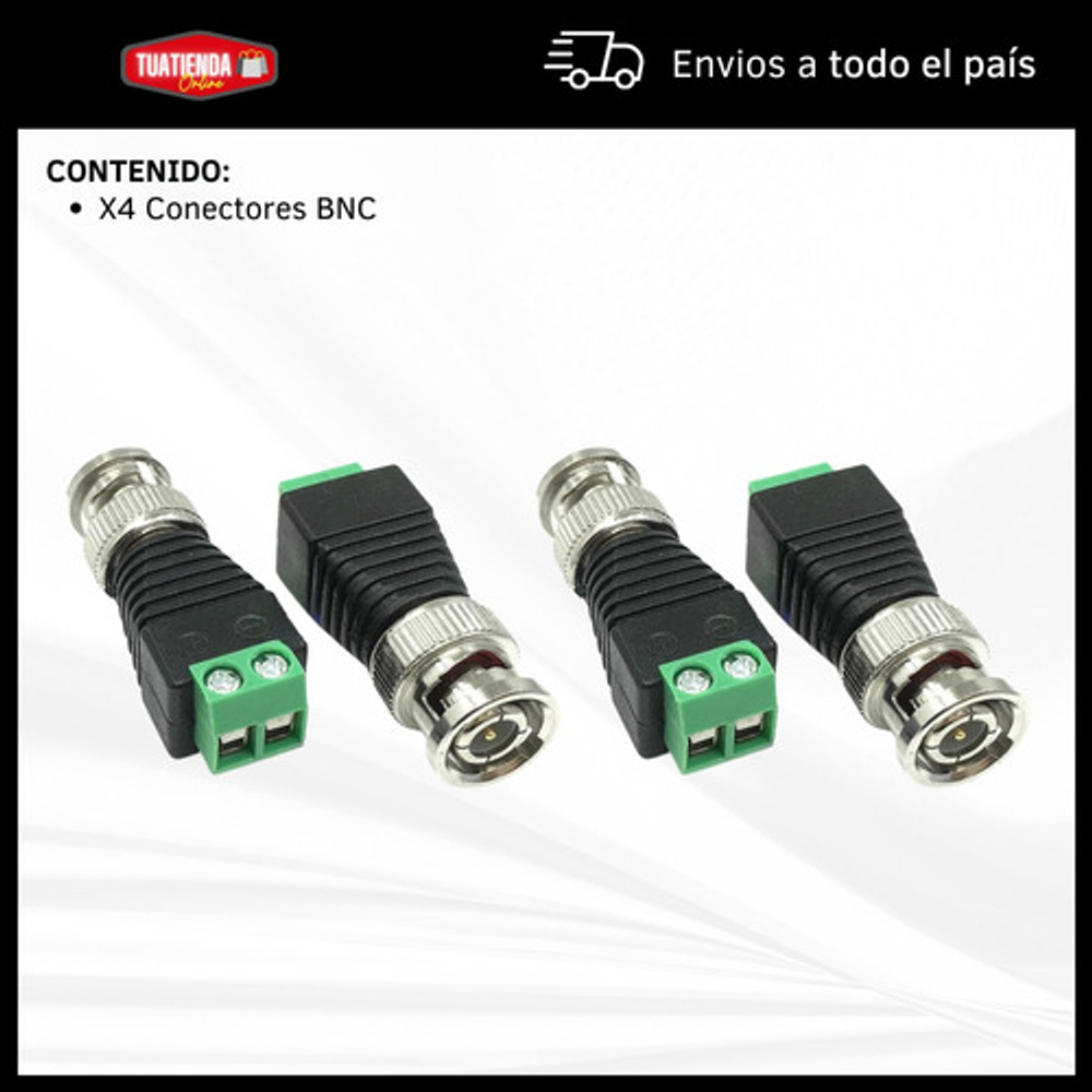 Características: • Formato de venta: Pack • Unidades por pack: 4 • Conexión confiable y de alta calidad. • Ideal para conexión de corta distancia. • Aspecto simple y profesional para cableado. • No necesita de herramientas para su colocación. • El conector BNC es un tipo de conector de rápida conexión / desconexión, lo cual incorpora más seguridad al conector que se usa para cable coaxial.