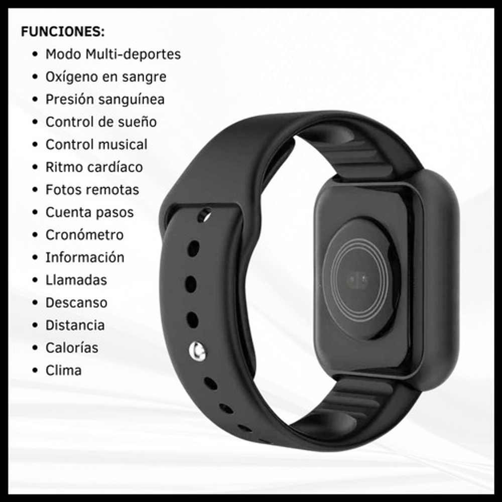 Funciones del smartwatch: Control de música,Control de sueño,Fotos remotas,Multi deportes,Oxigeno en sangre,Presión sanguinea,Ritmo cardiaco
