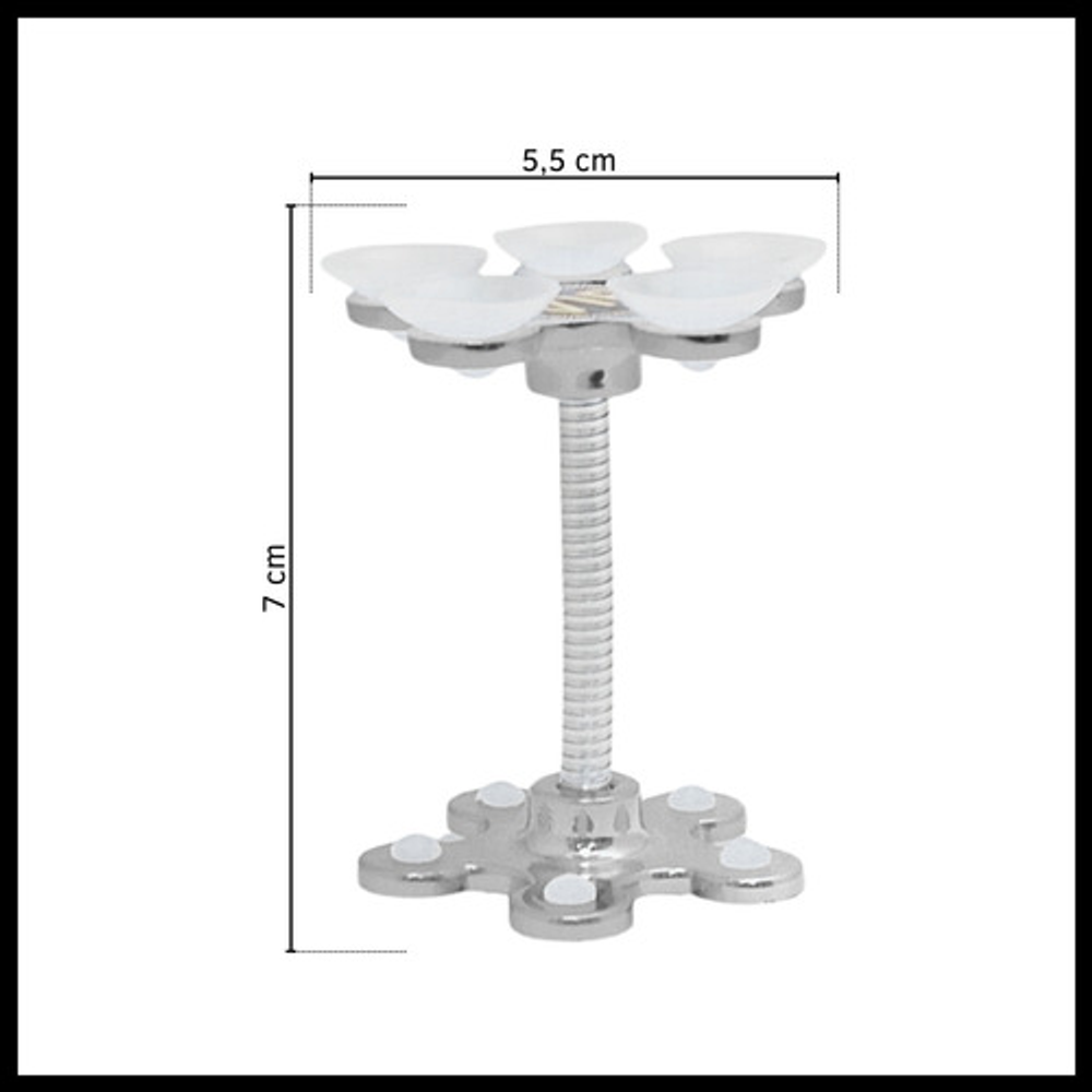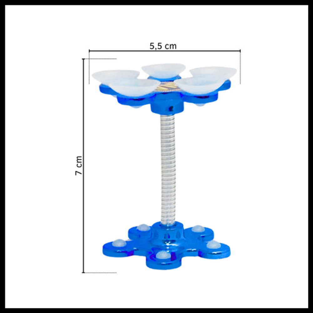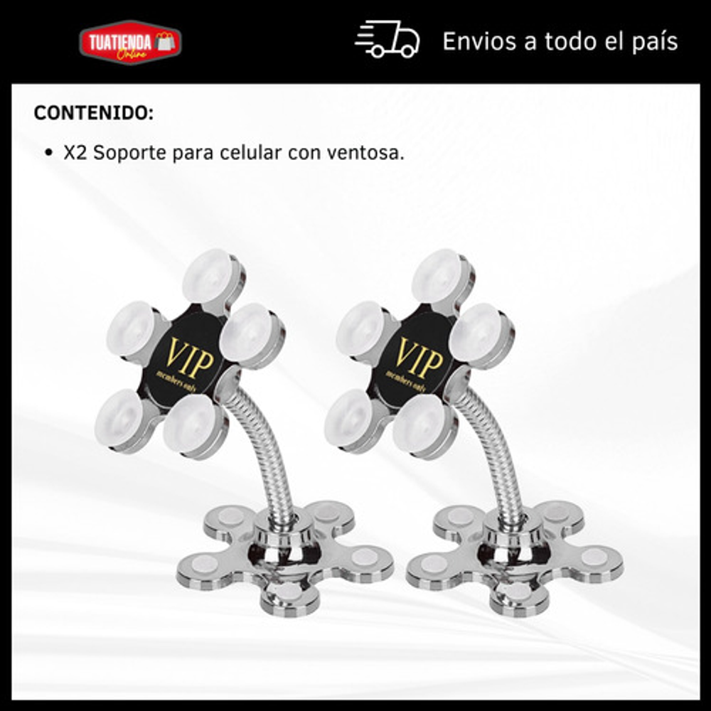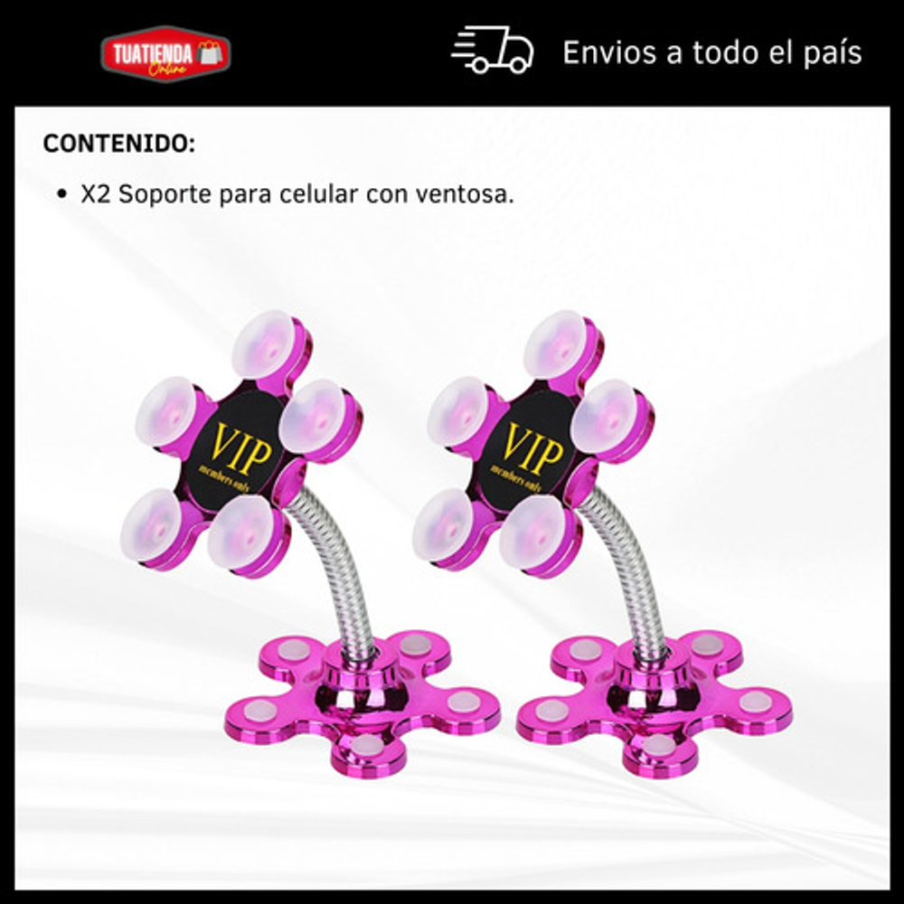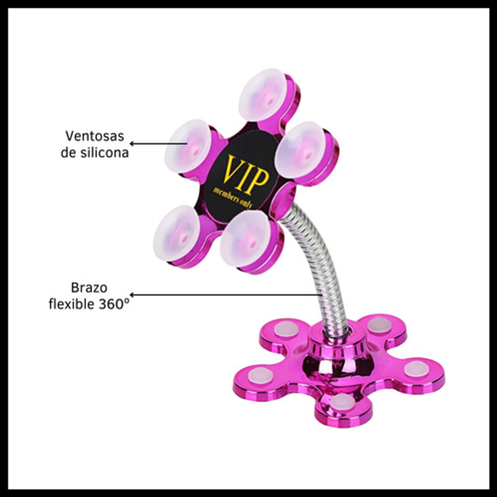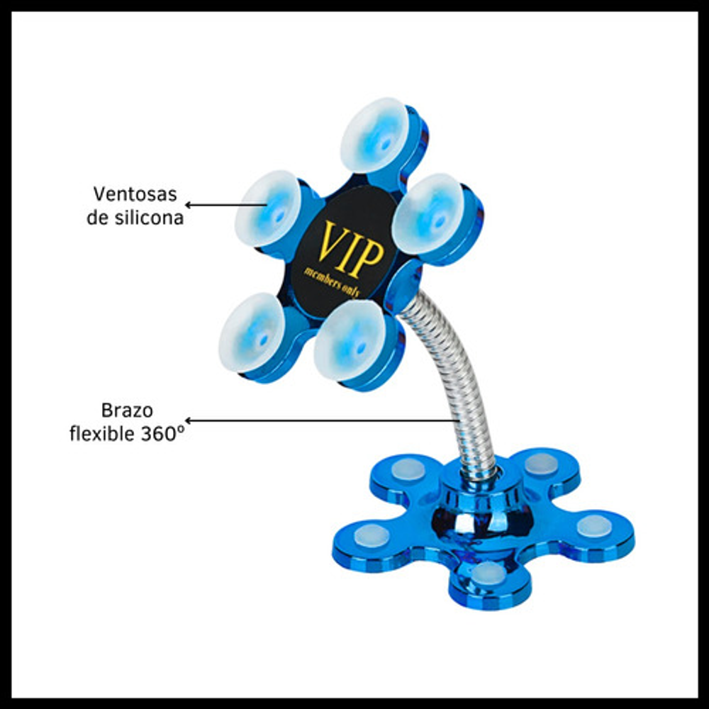 Características: • Soporte para superficies lisas, no rugosas. • No daña el celular, gps, etc. • Material: silicona y metal. • Rotación 360º. • Fijación por ventosas.