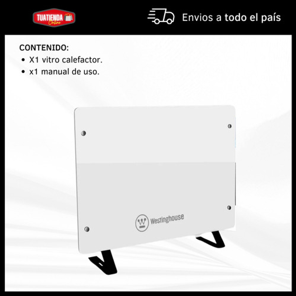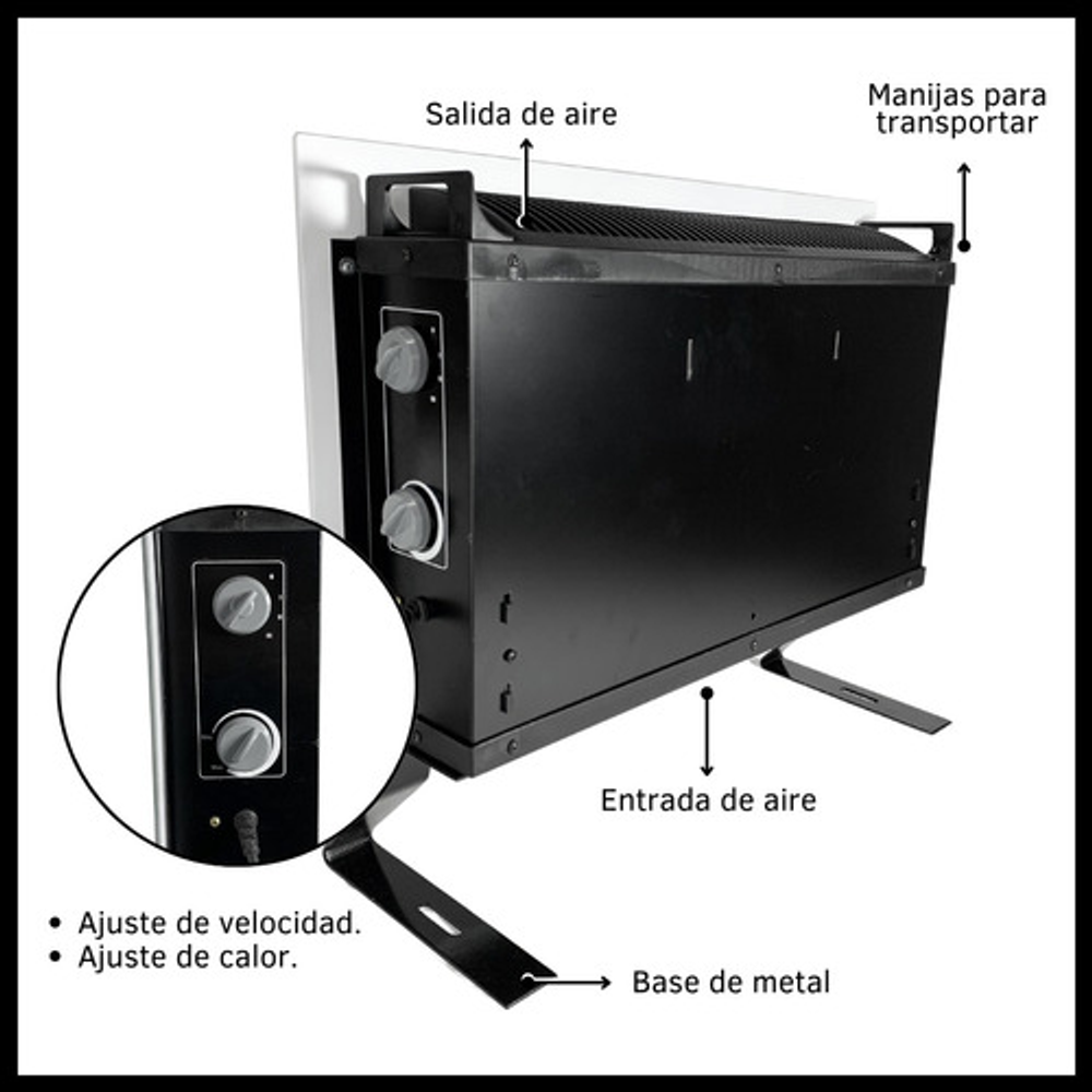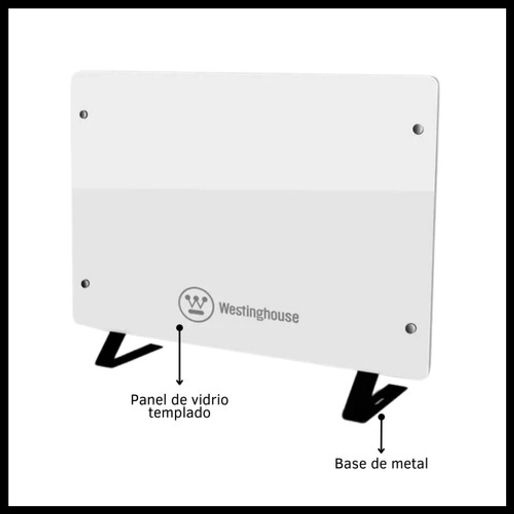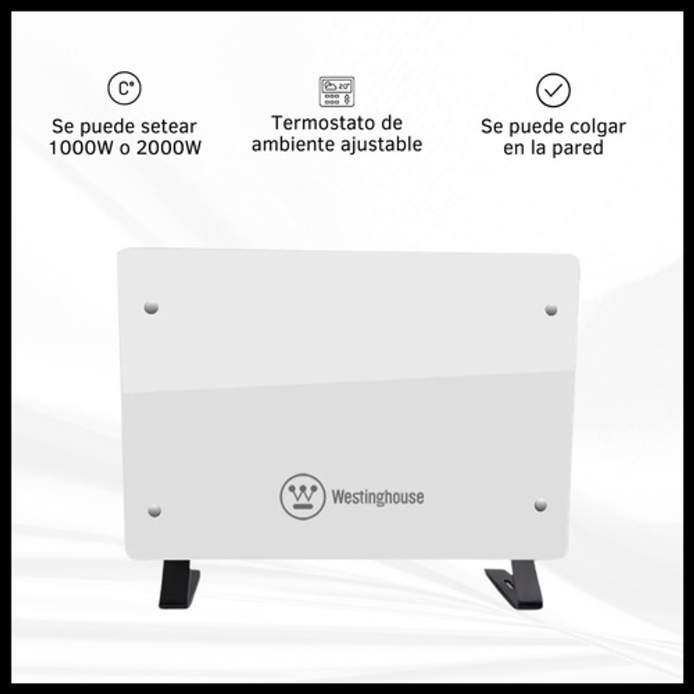 CARACTERISTICAS: -Material: base de metal, panel de vidrio templado. -Potencia: 2000W. -Control de temperatura. -3 niveles de calefacción. -Se puede colgar en la pared. -Protección sobre calentamiento.